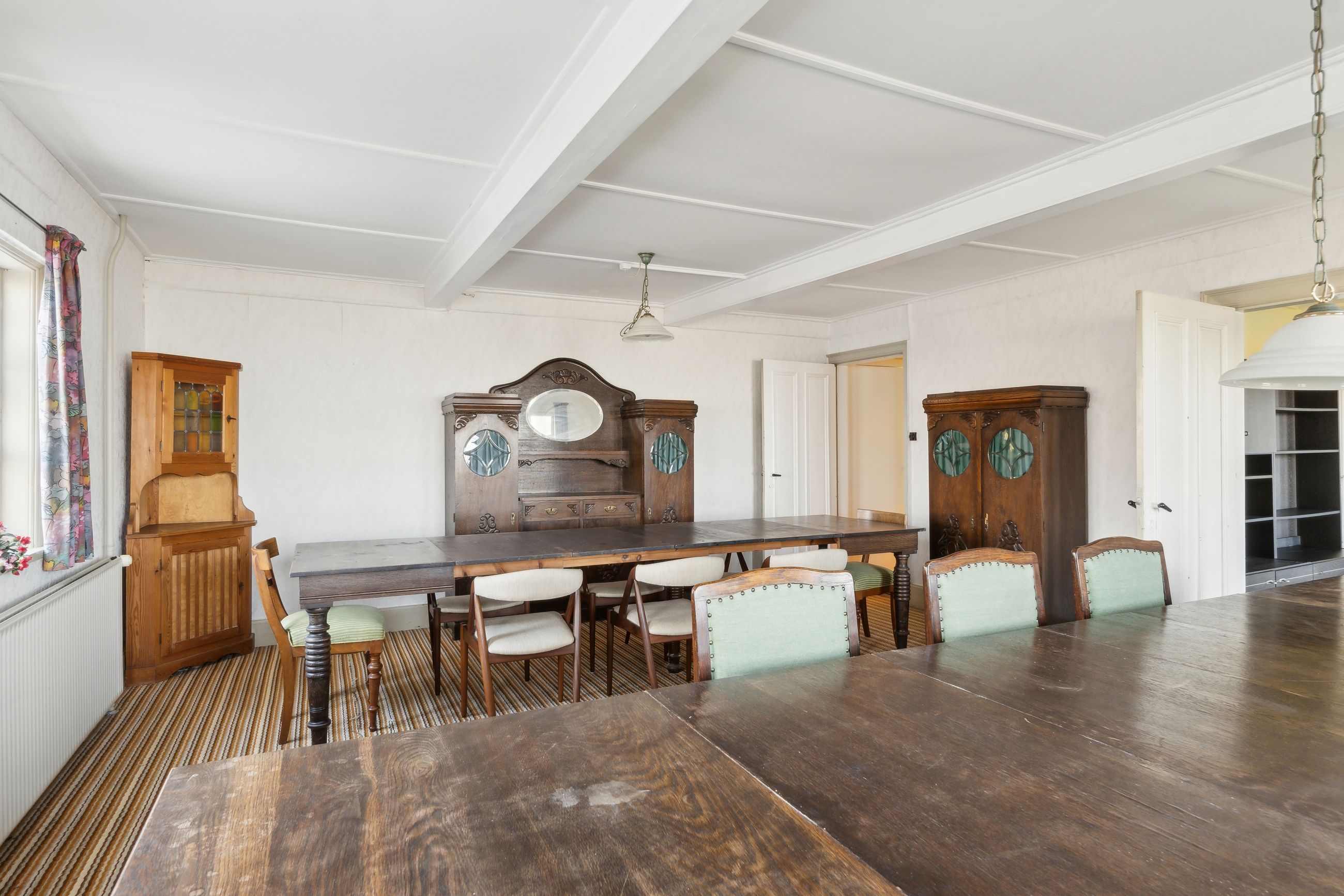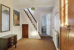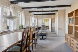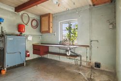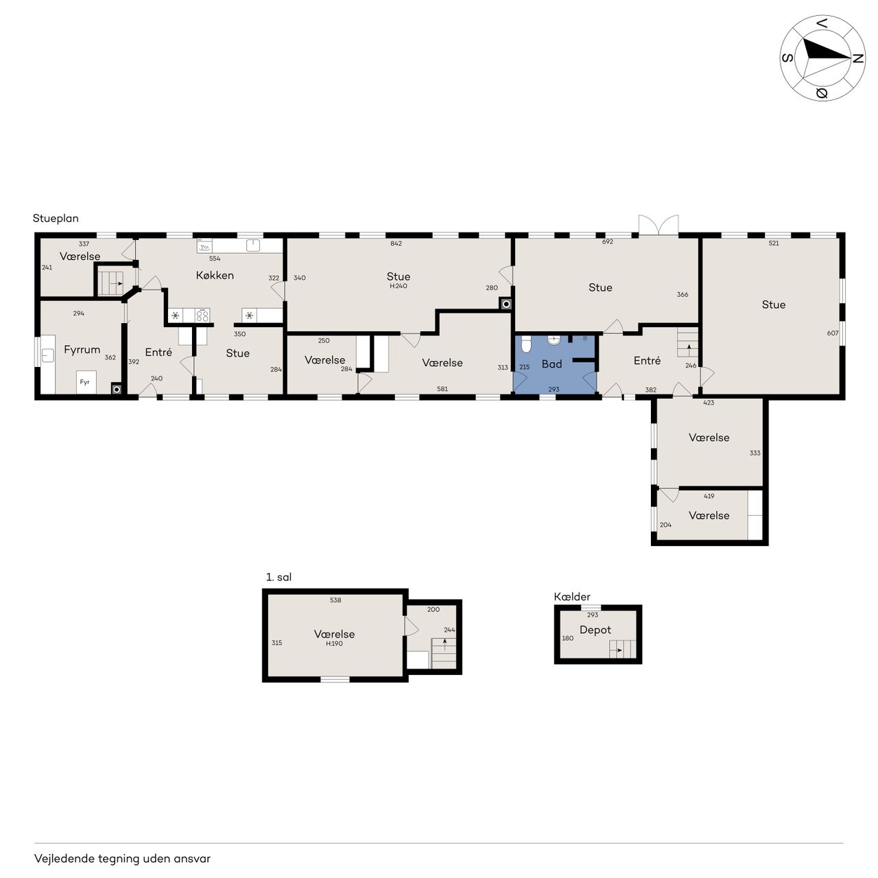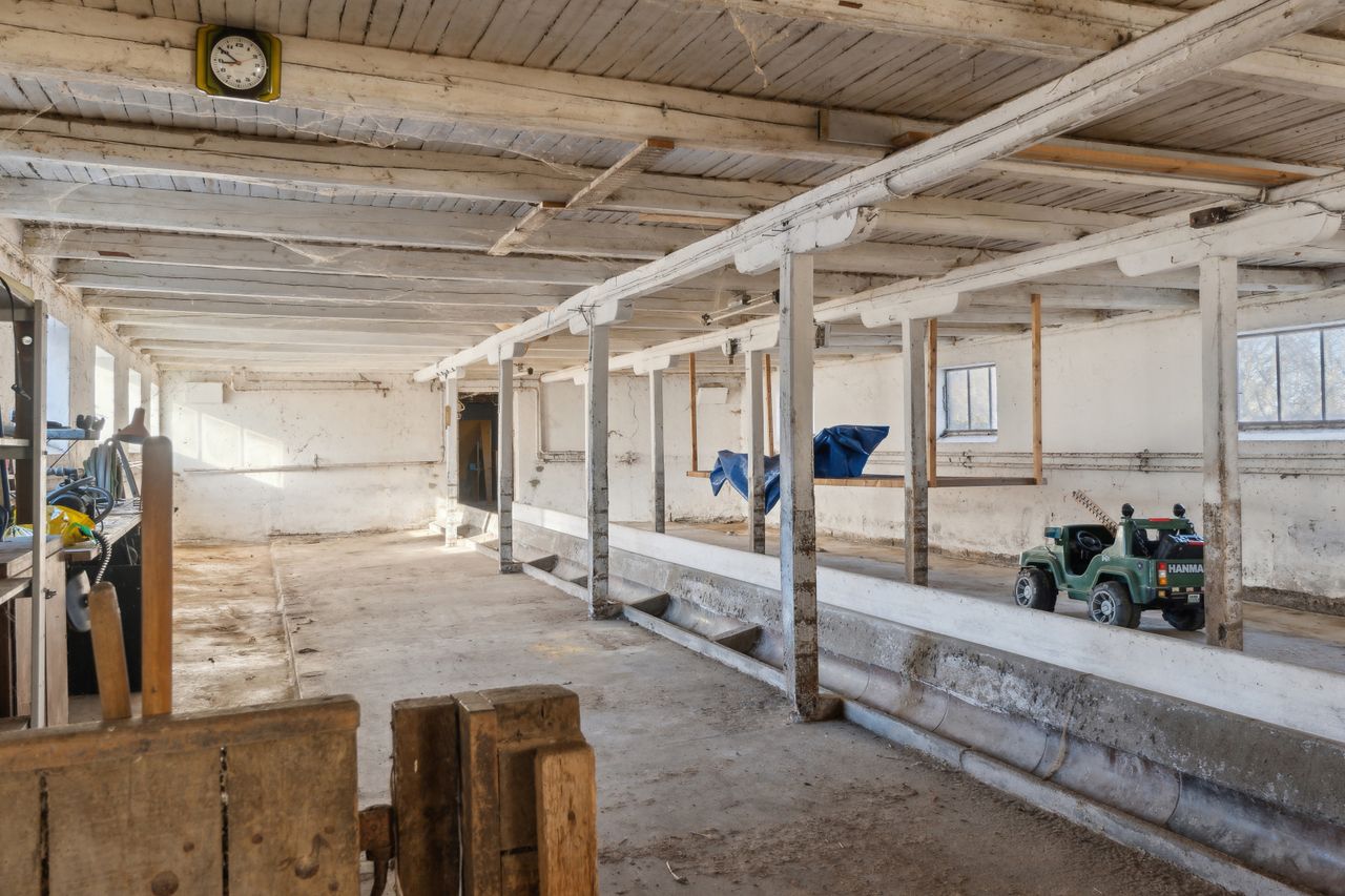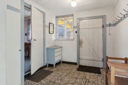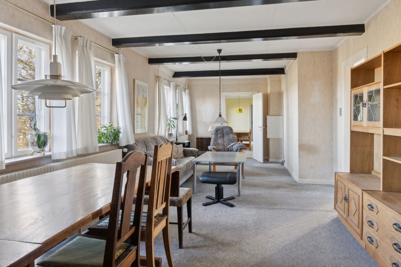 Indenfor mødes du af en rummelig entre, der fører videre til fyrrummet og forstuen. Det ældre køkken er fyldt med charmerende detaljer og har adgang til en lille viktualiekælder - perfekt til opbevaring af dine kulinariske skatte. Hjemmet rummer tre store stuer, hvoraf den ene nemt kan anvendes som spisestue eller opholdsstue alt efter behov.