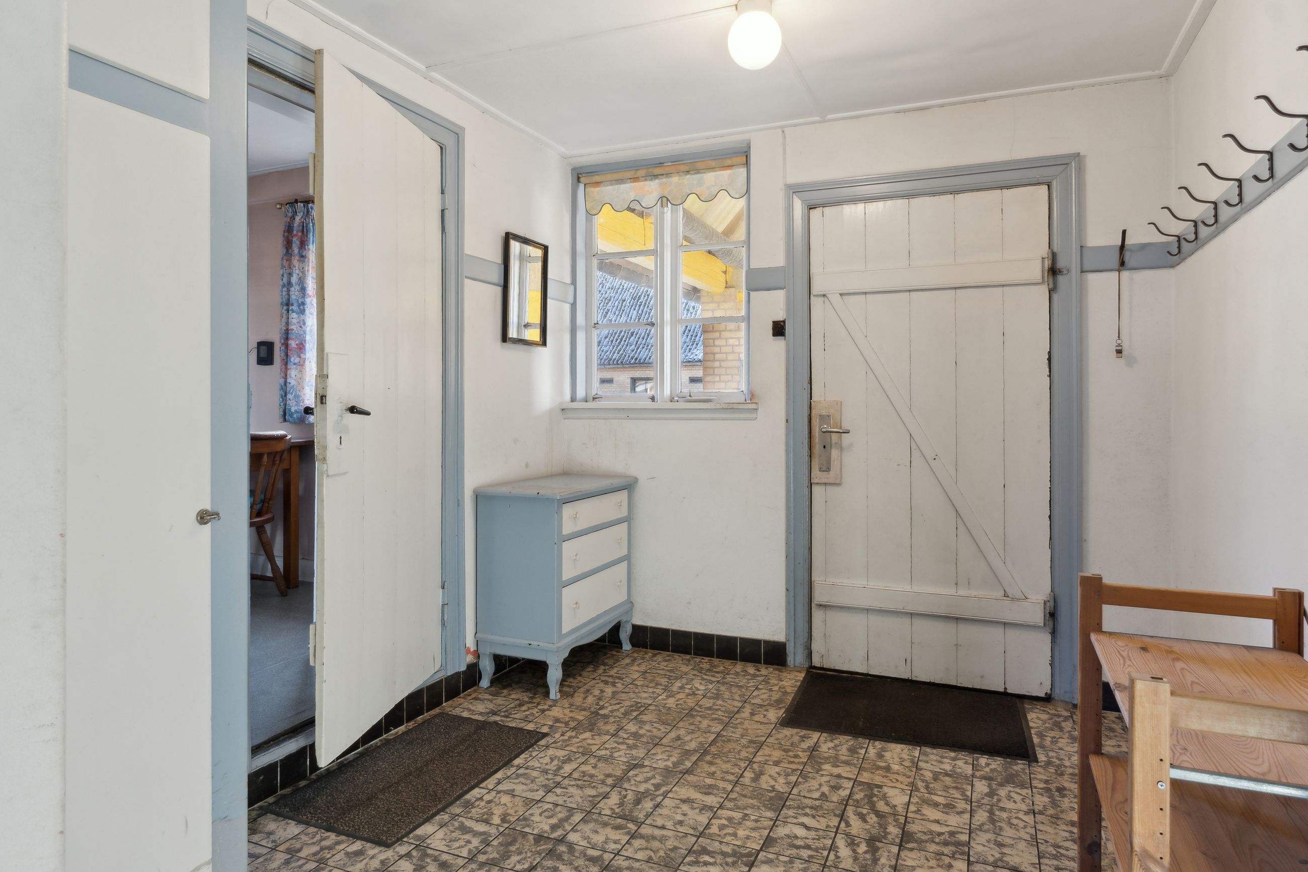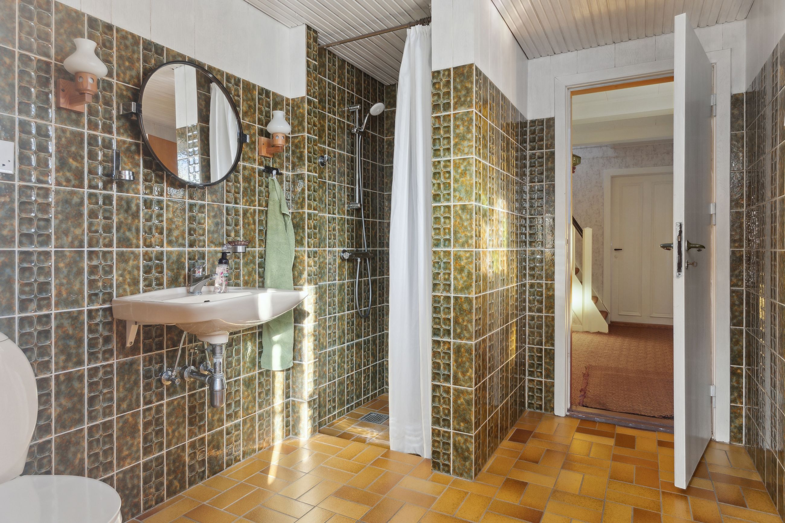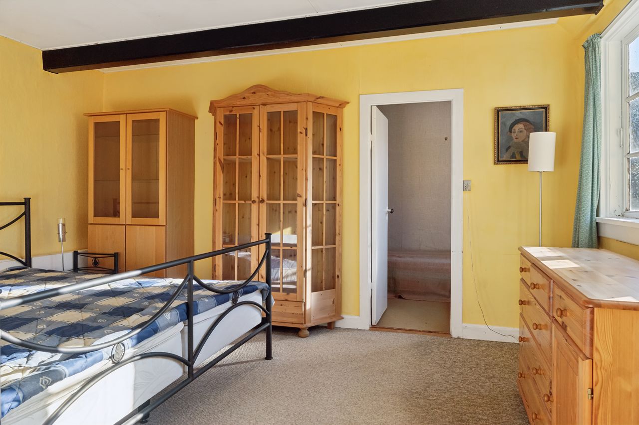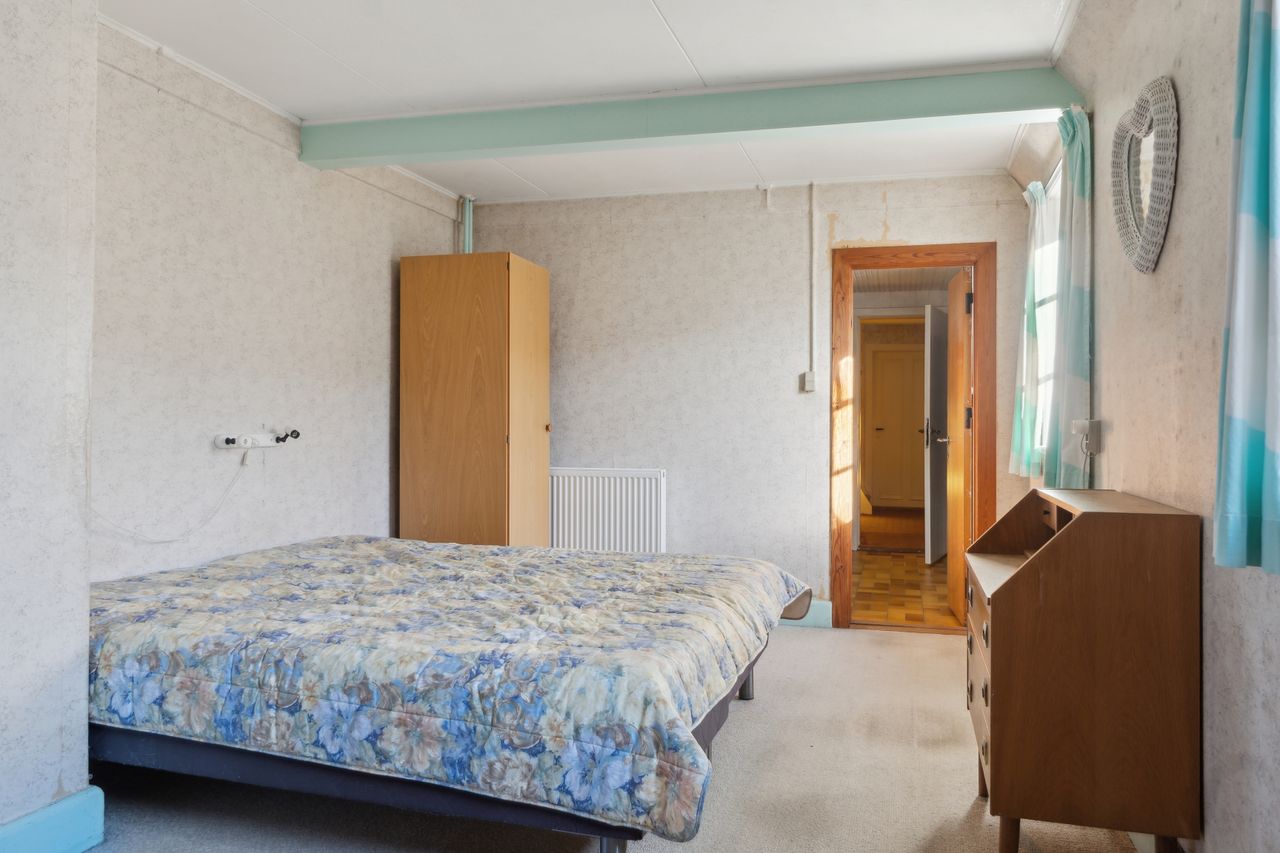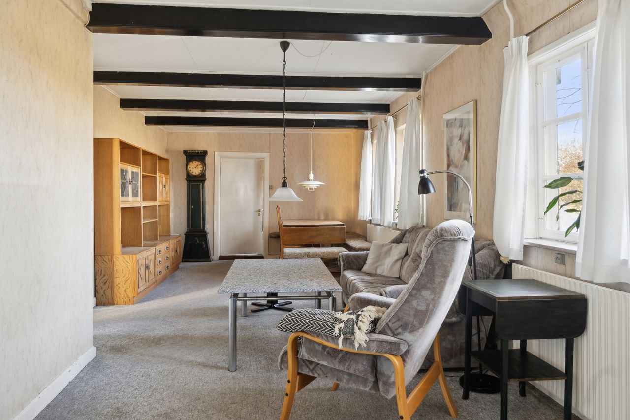 Ejendommen tilbyder fire værelser, hvoraf et befinder sig på første sal, hvilket giver mulighed for at indrette børneværelser eller kontorplads afhængigt af familiens størrelse. Badeværelset emmer af ægte 70'er stemning med sine karakteristiske grønne fliser og bruseniche.