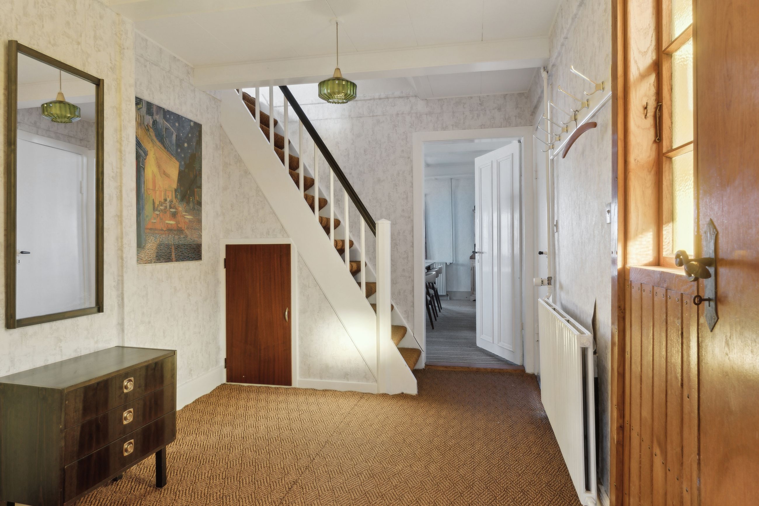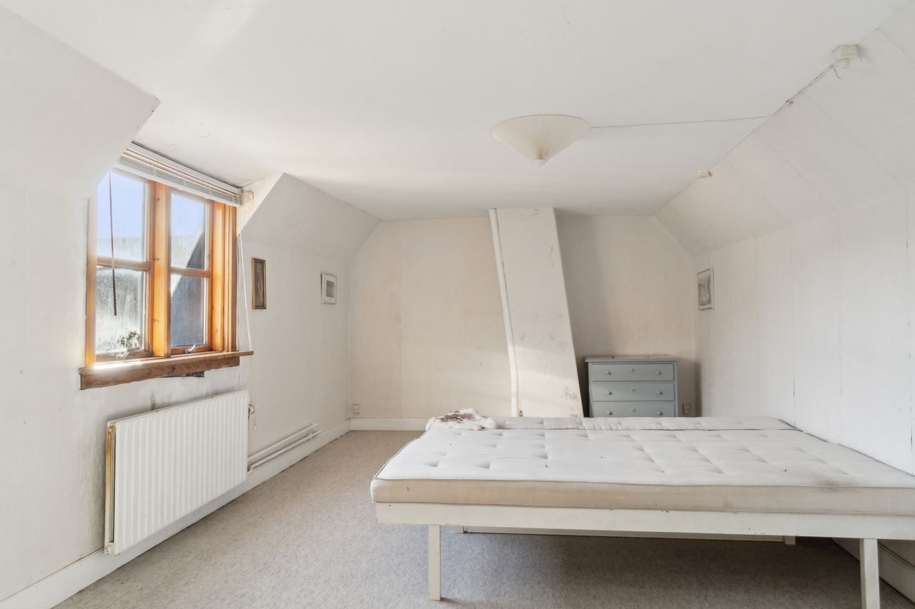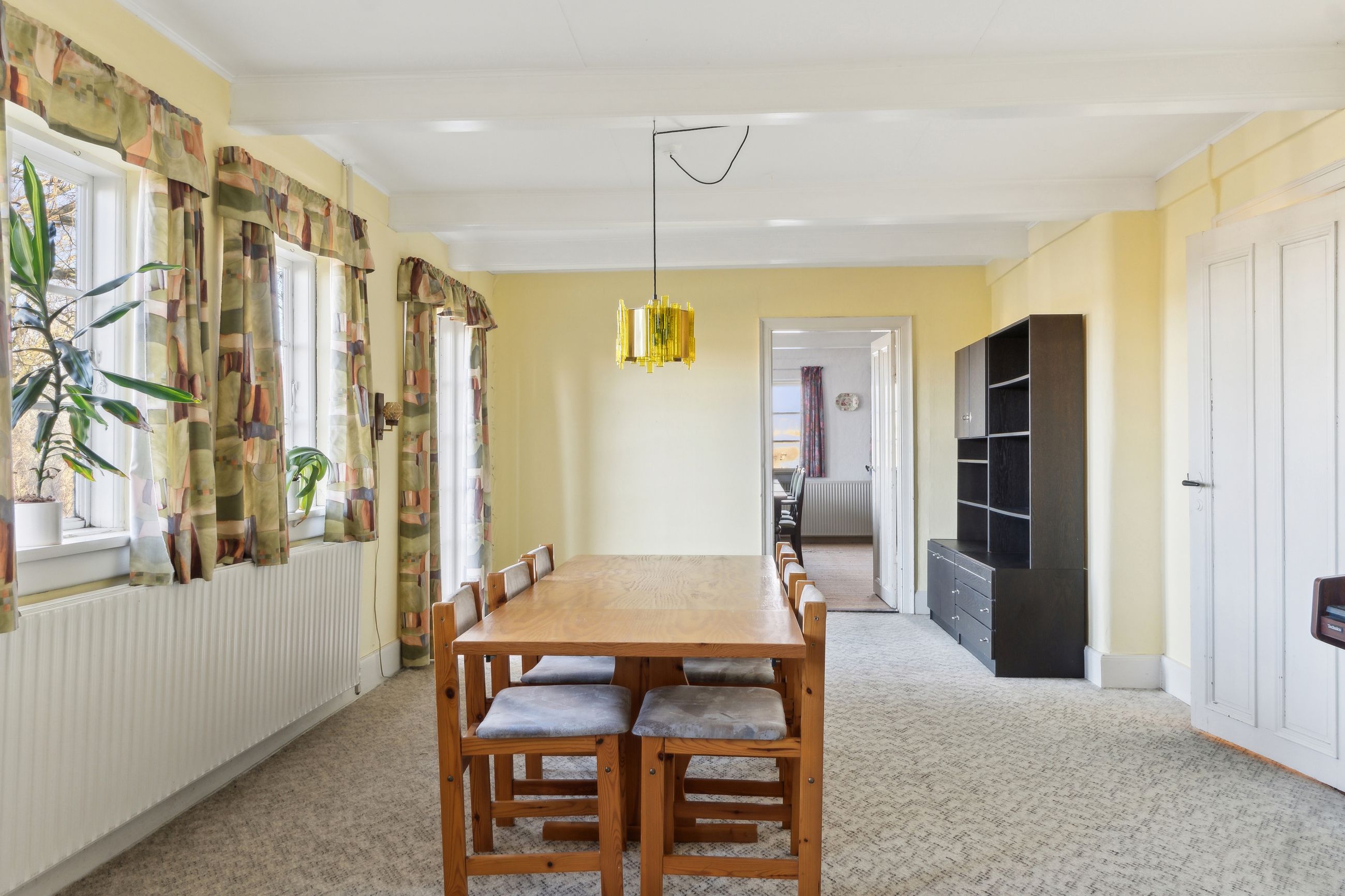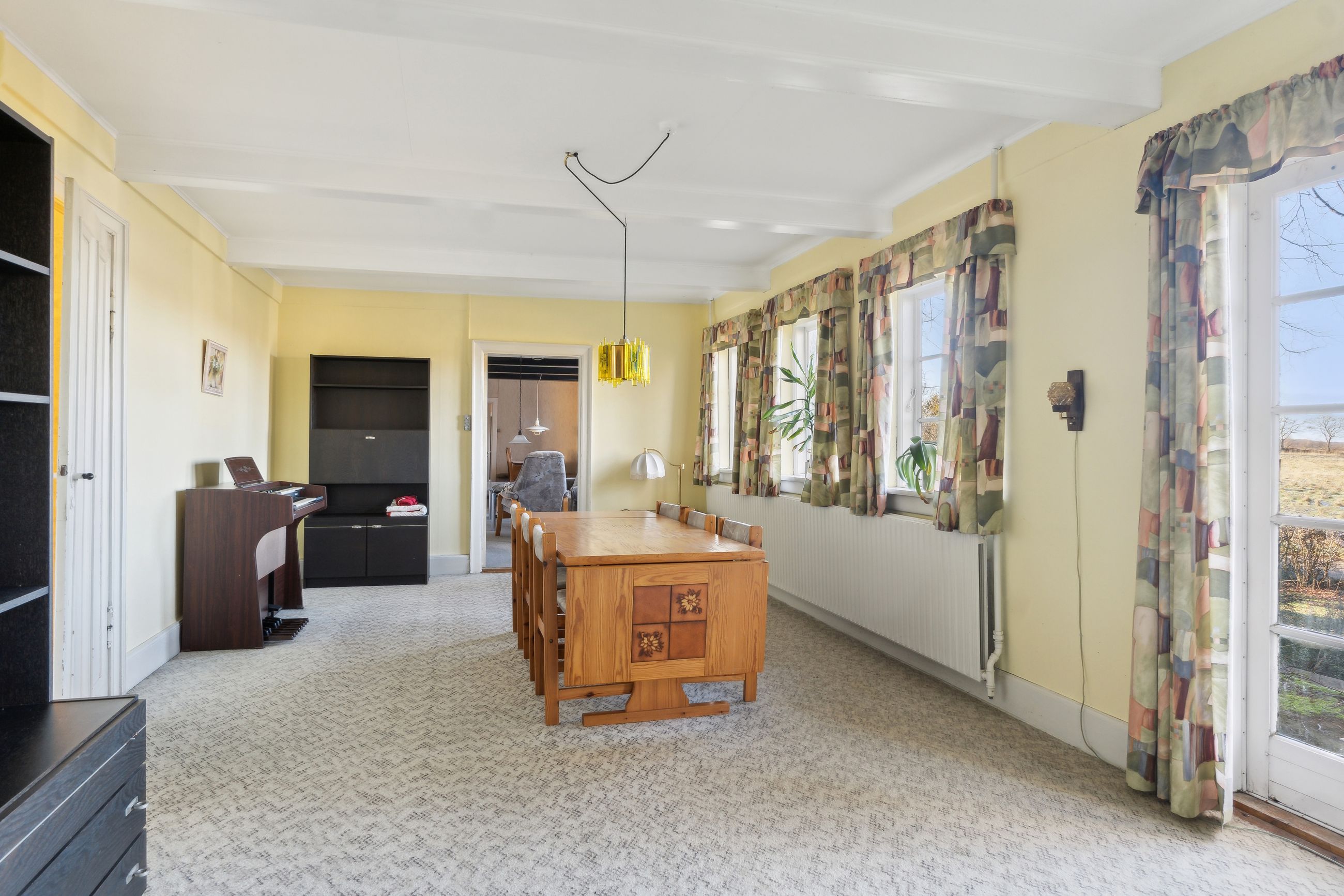 Ejendommen tilbyder fire værelser, hvoraf et befinder sig på første sal, hvilket giver mulighed for at indrette børneværelser eller kontorplads afhængigt af familiens størrelse. Badeværelset emmer af ægte 70'er stemning med sine karakteristiske grønne fliser og bruseniche.