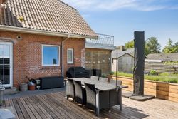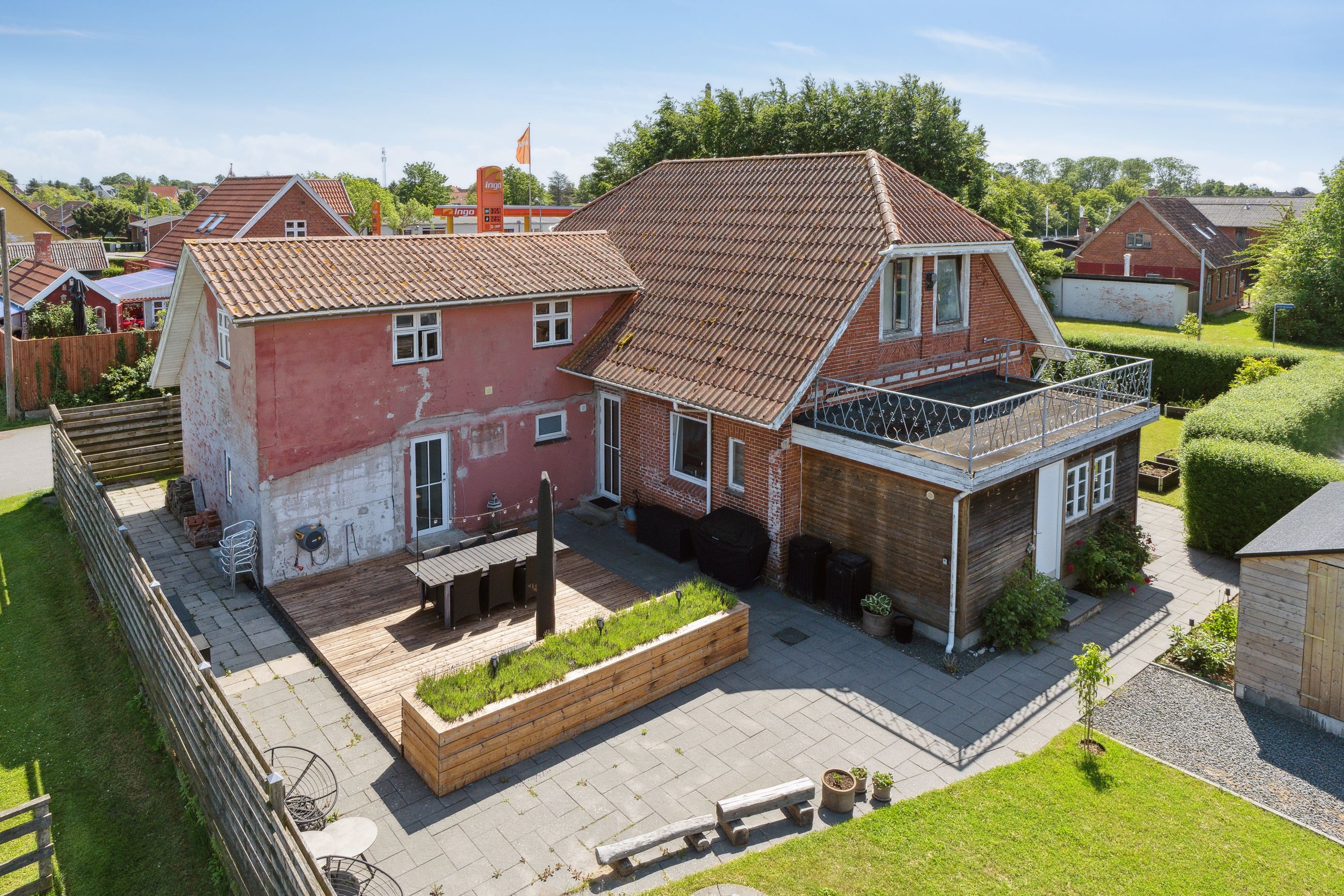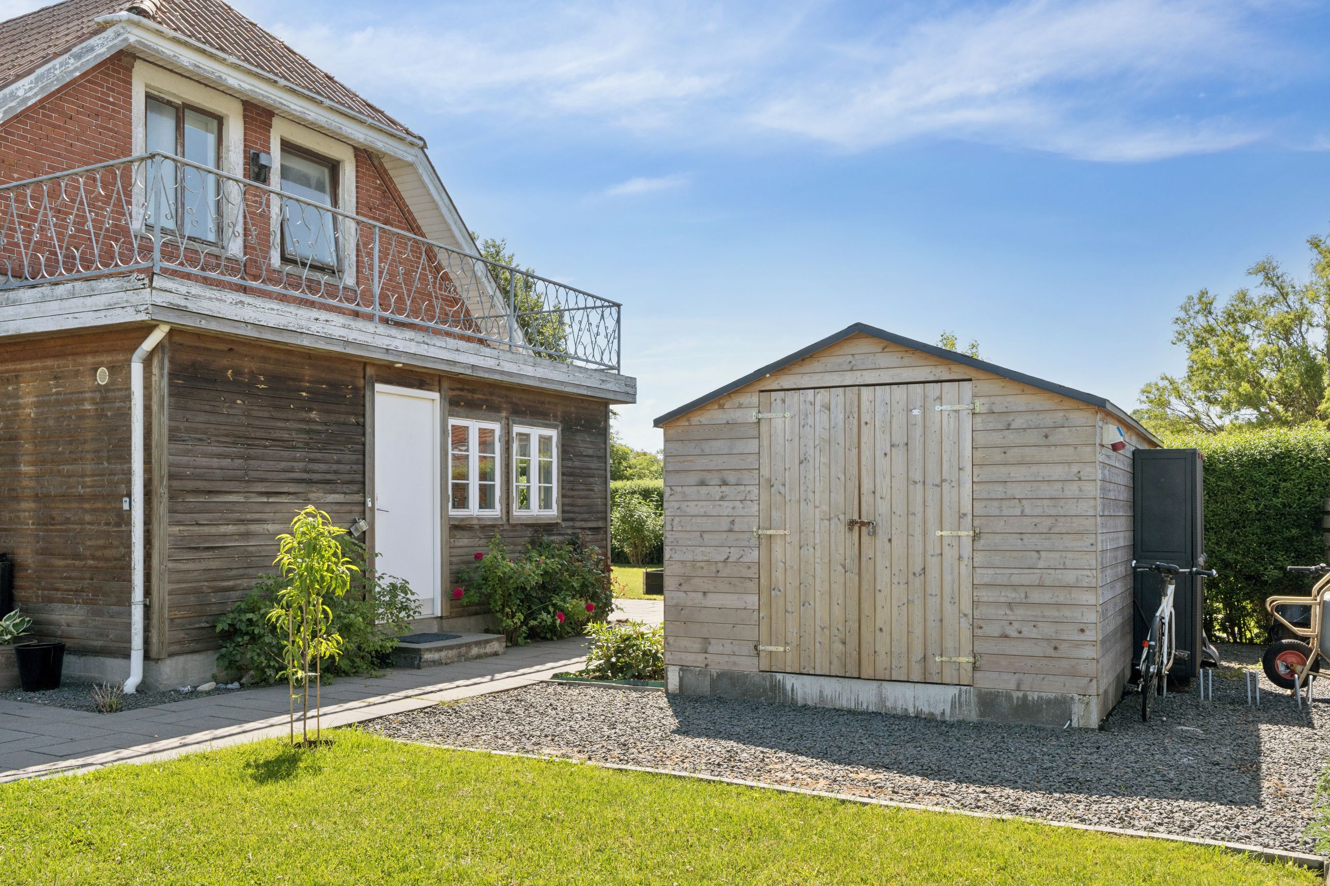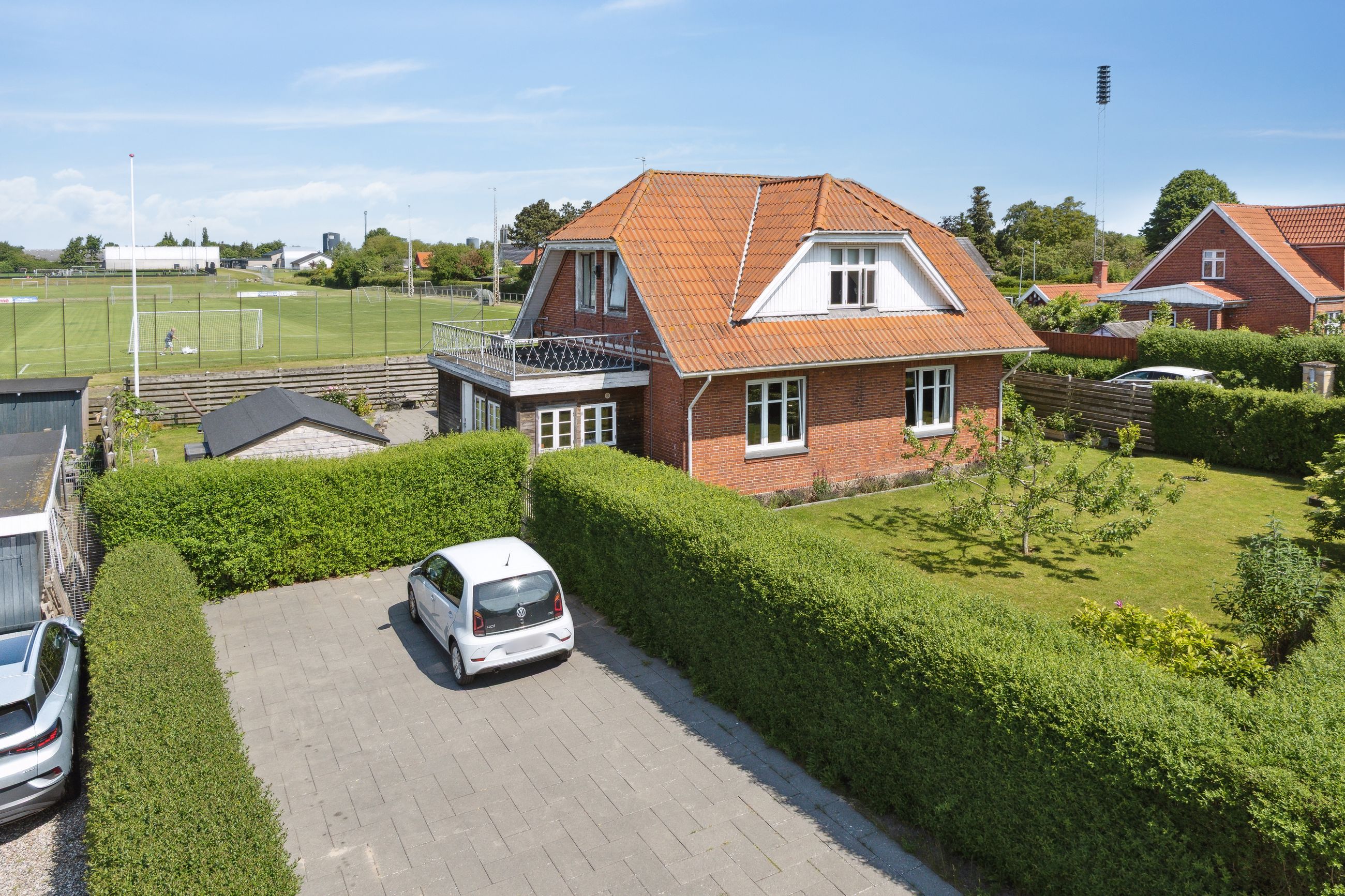 Allerede ved ankomsten fornemmer man den gedigne og velholdte stil, hvor en flisebelagt indkørsel giver plads til flere biler. Facaden fremstår indbydende med røde mursten, hvide vinduer og taget er af eternit.