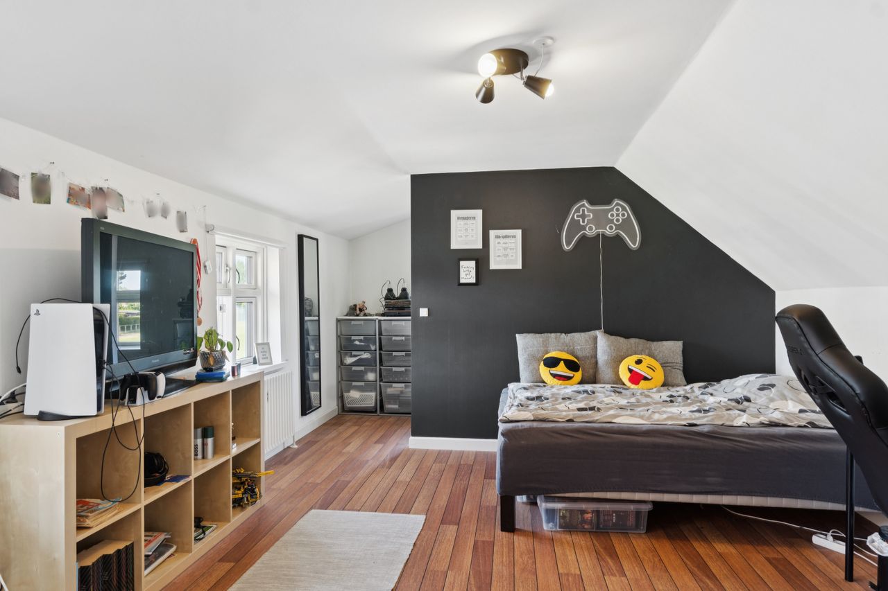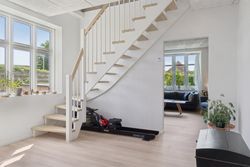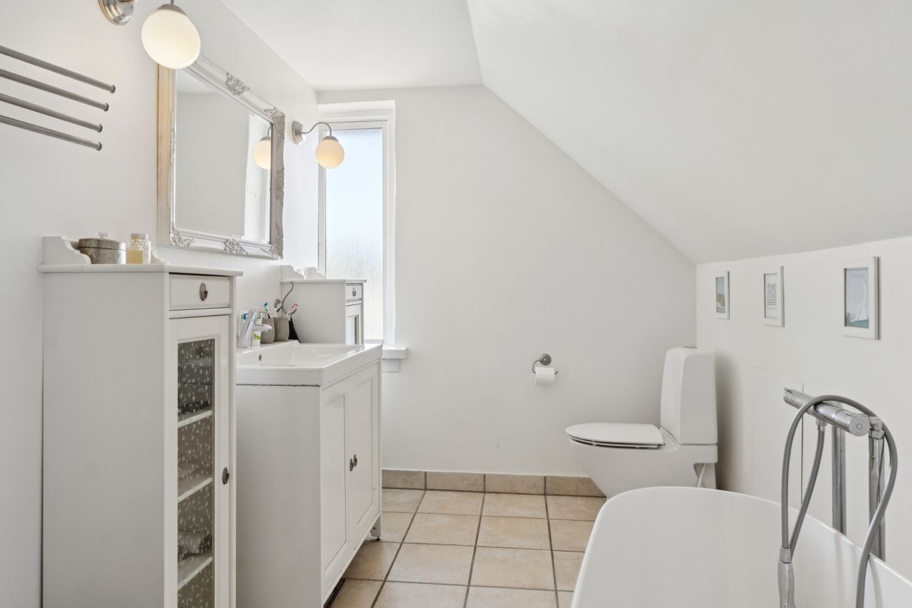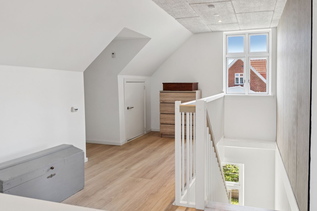 En ny, elegant trappe fører op til 1. salen, hvor et lyst repos med gulvvarme fordeler til hele tre rummelige værelser, alle med god opbevaringsplads og en hyggelig atmosfære. Hertil kommer endnu et badeværelse med badekar, perfekt til både hverdagsluksus og børnefamilien.