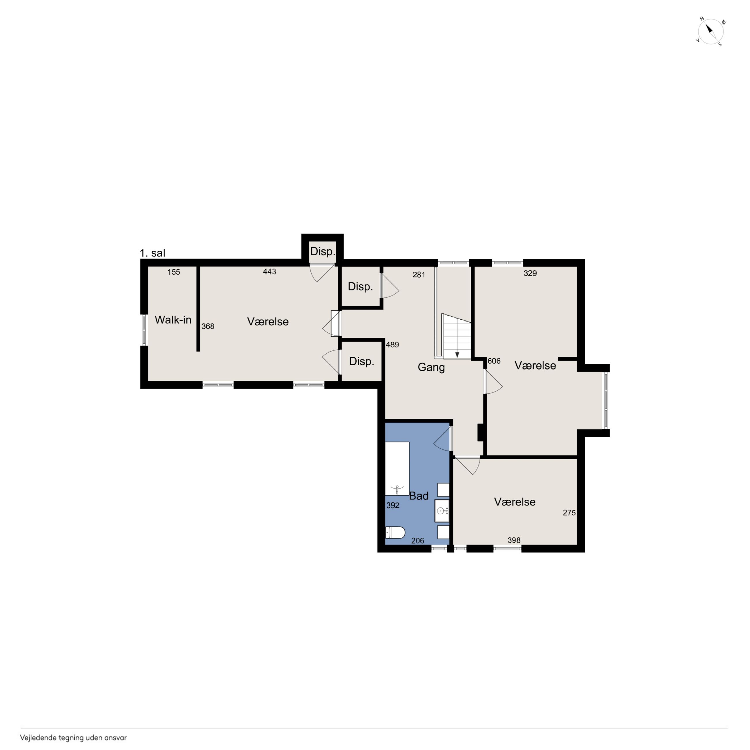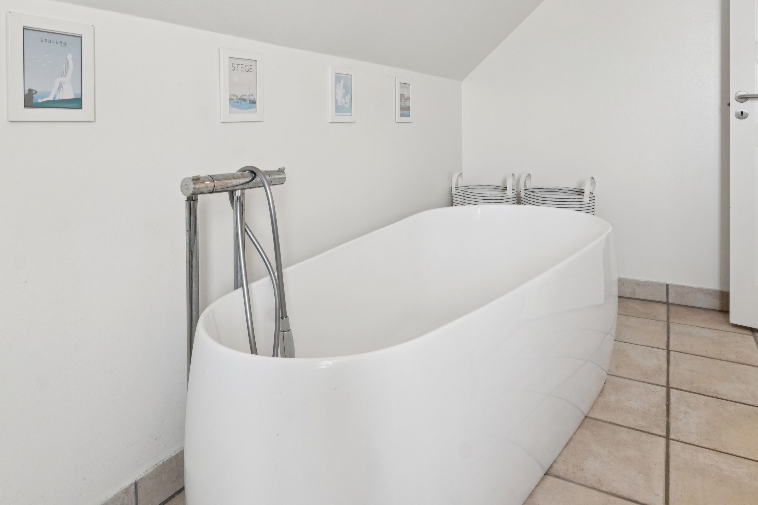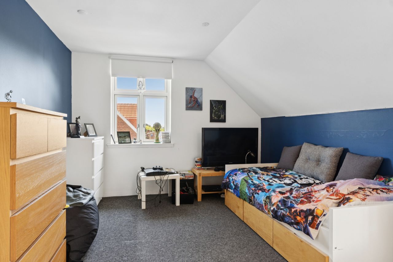 En ny, elegant trappe fører op til 1. salen, hvor et lyst repos med gulvvarme fordeler til hele tre rummelige værelser, alle med god opbevaringsplads og en hyggelig atmosfære. Hertil kommer endnu et badeværelse med badekar, perfekt til både hverdagsluksus og børnefamilien.