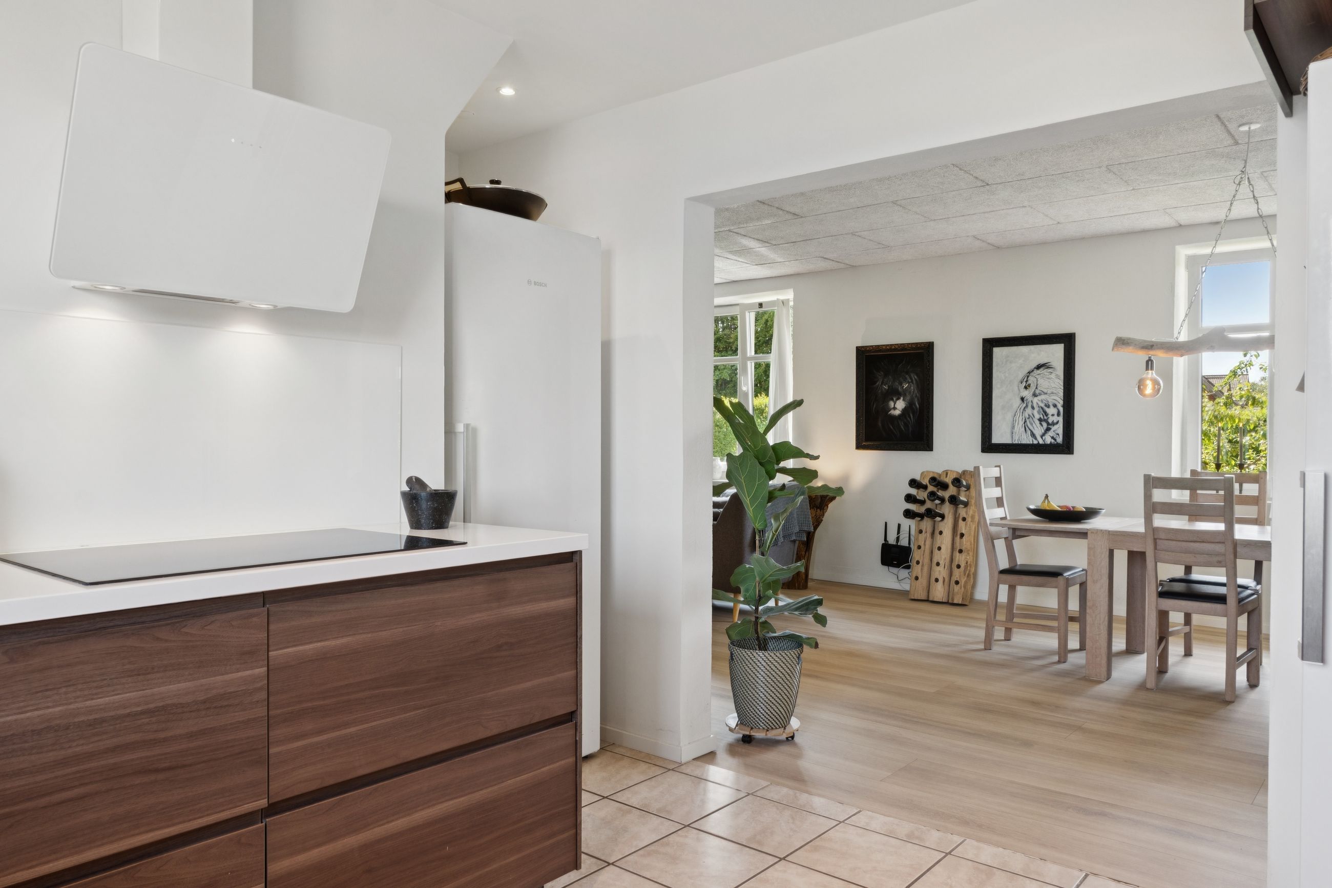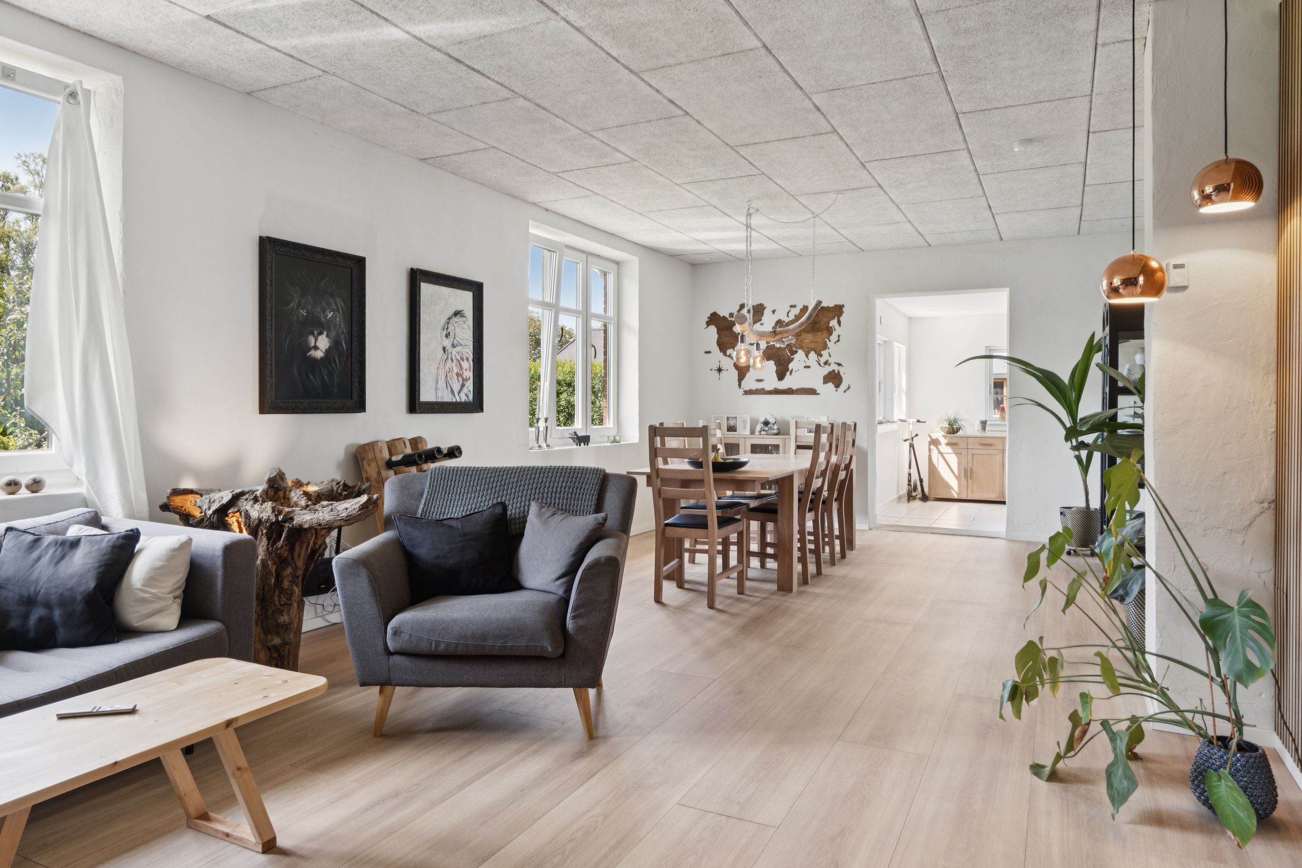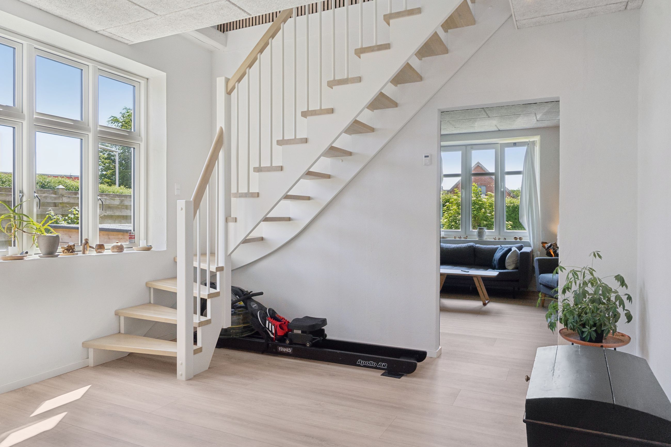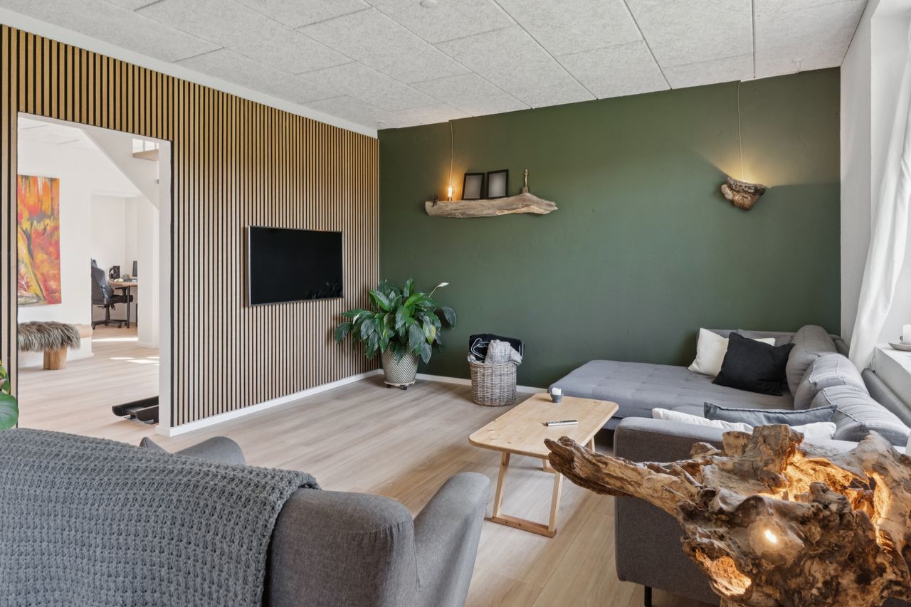 Indendørs bydes I velkommen i en stor og funktionel entré med masser af opbevaringsplads. Herfra åbner boligen sig med en lys og rummelig stue med både opholds- og spisearrangement i åben forbindelse med køkkenet – det perfekte samlingspunkt for hele familien. Stuen giver mulighed for adskilte zoner til leg, afslapning eller socialt samvær.
