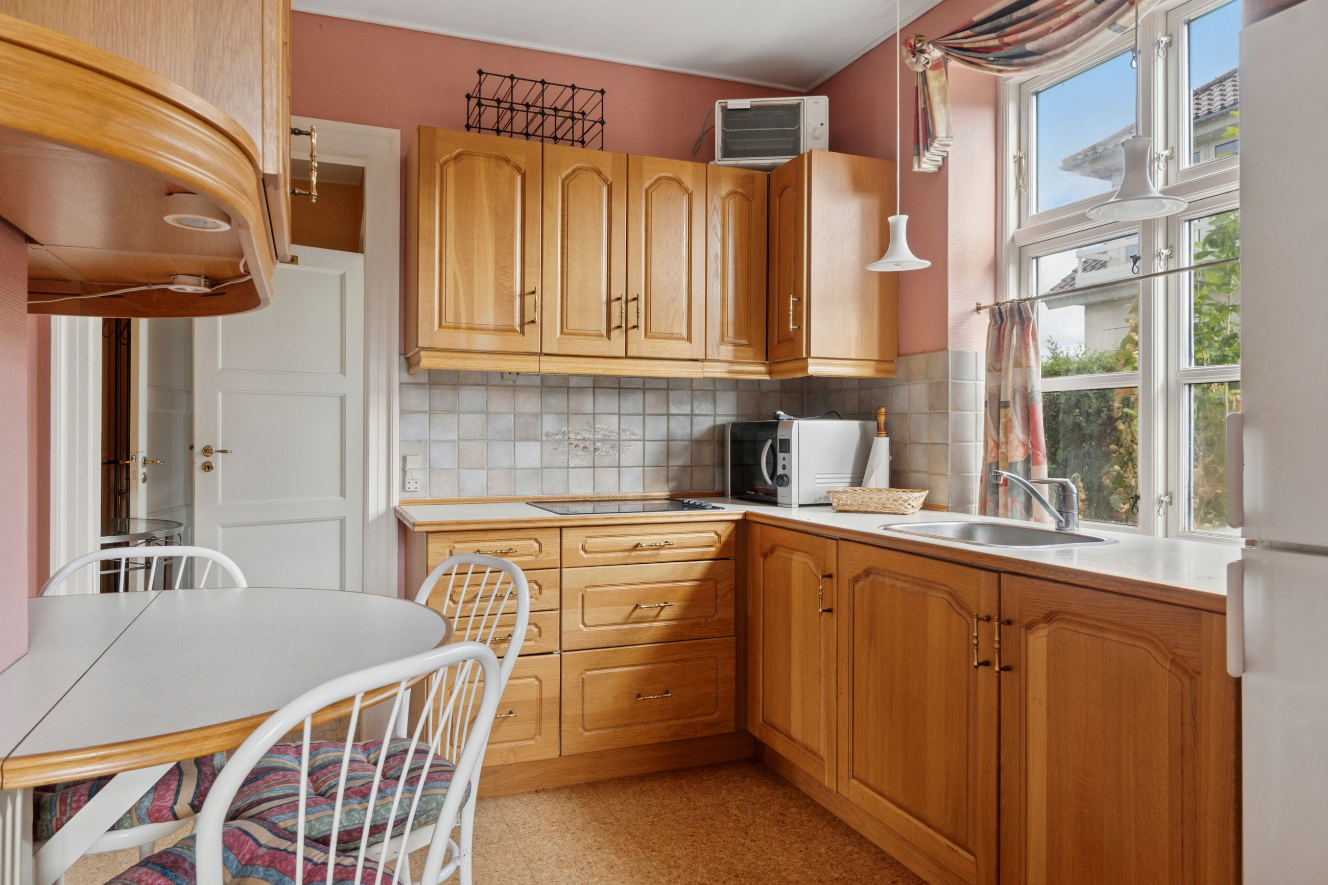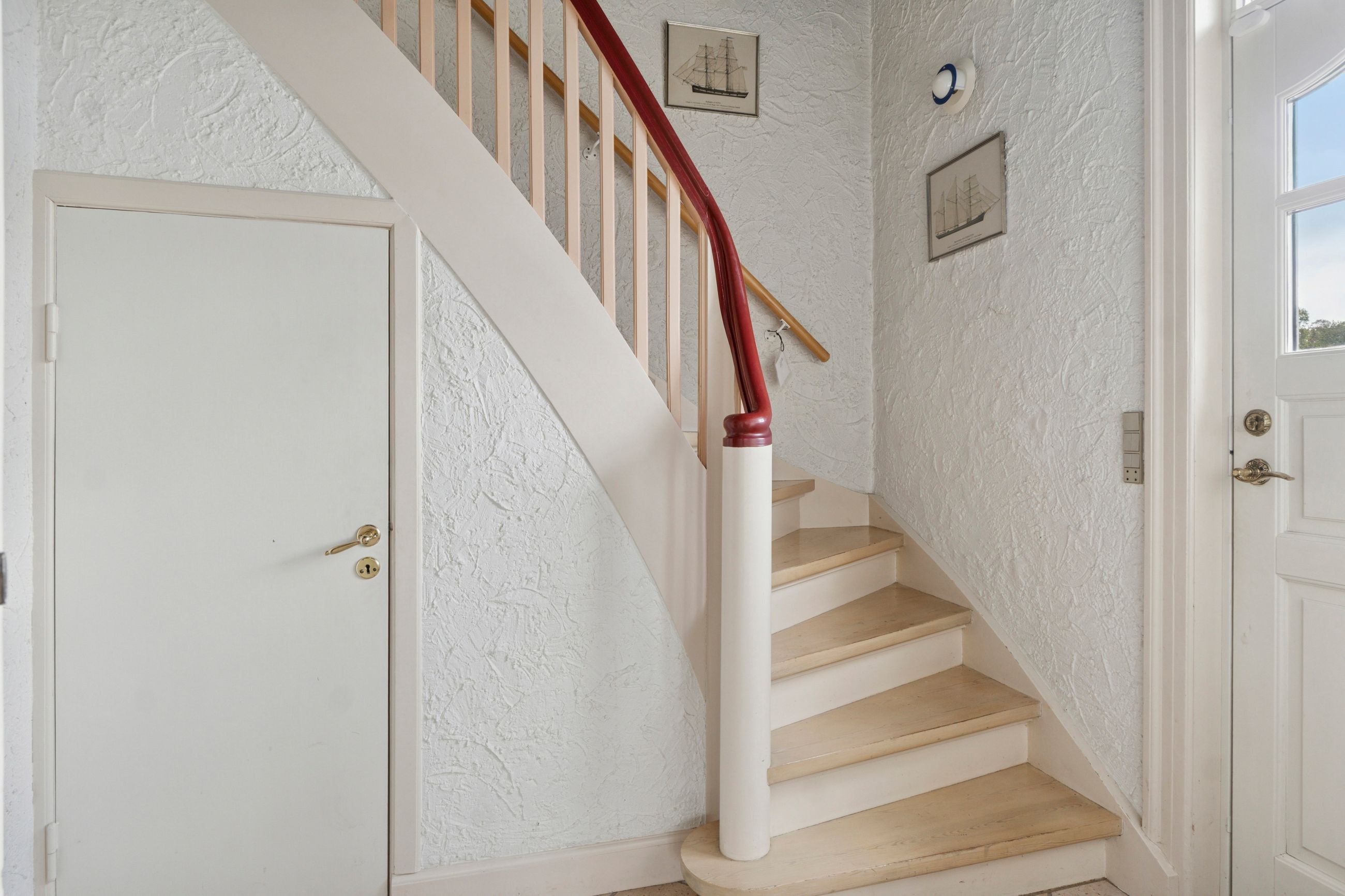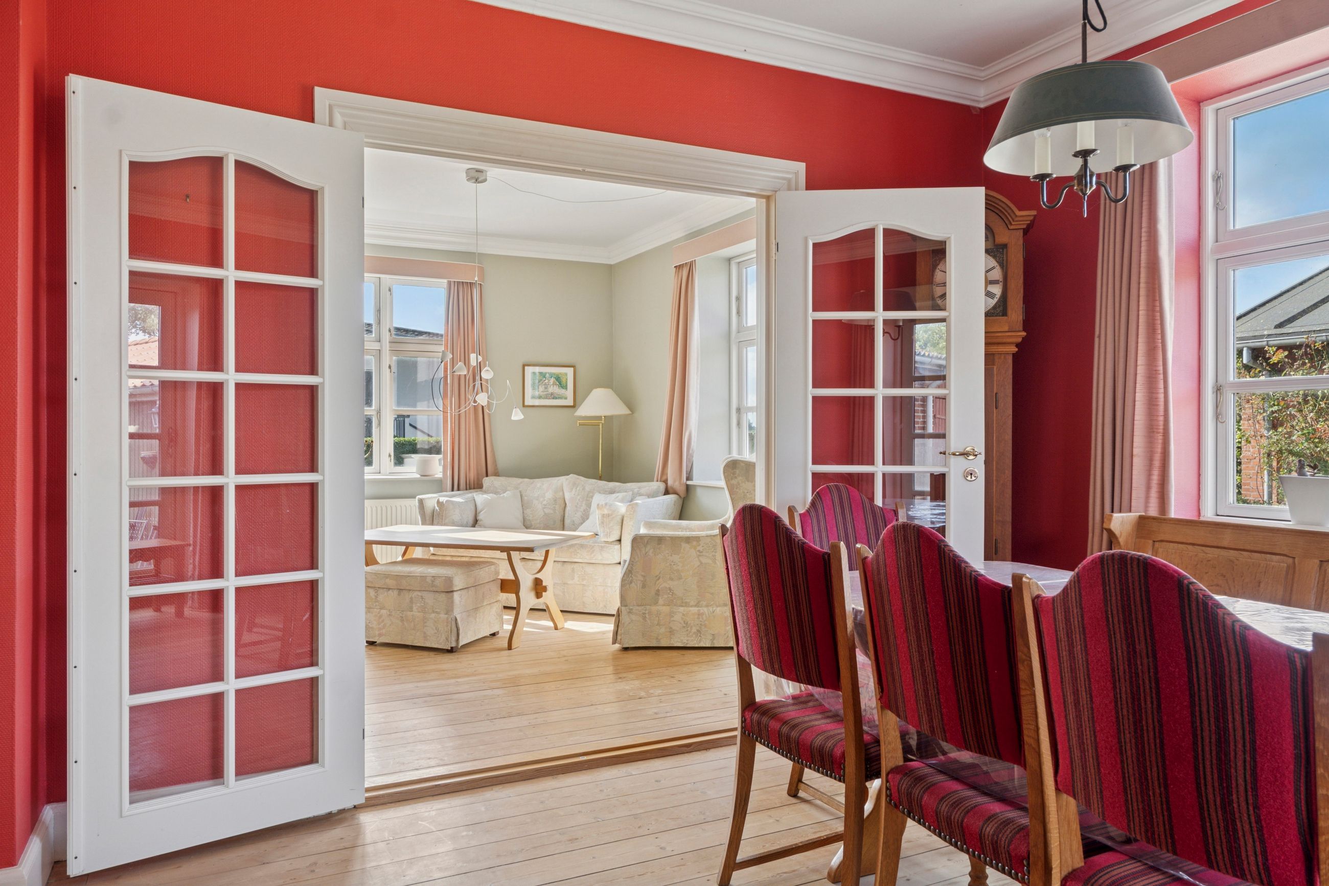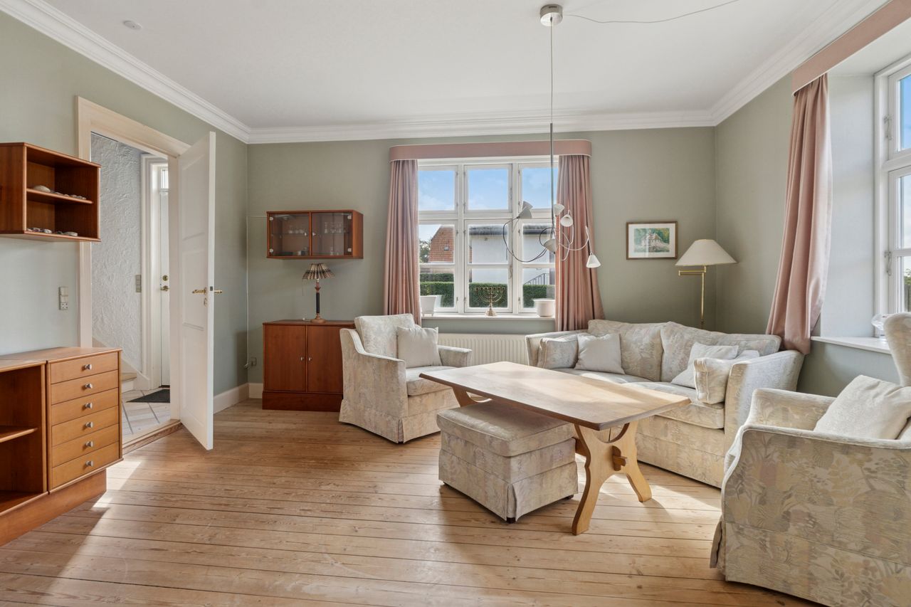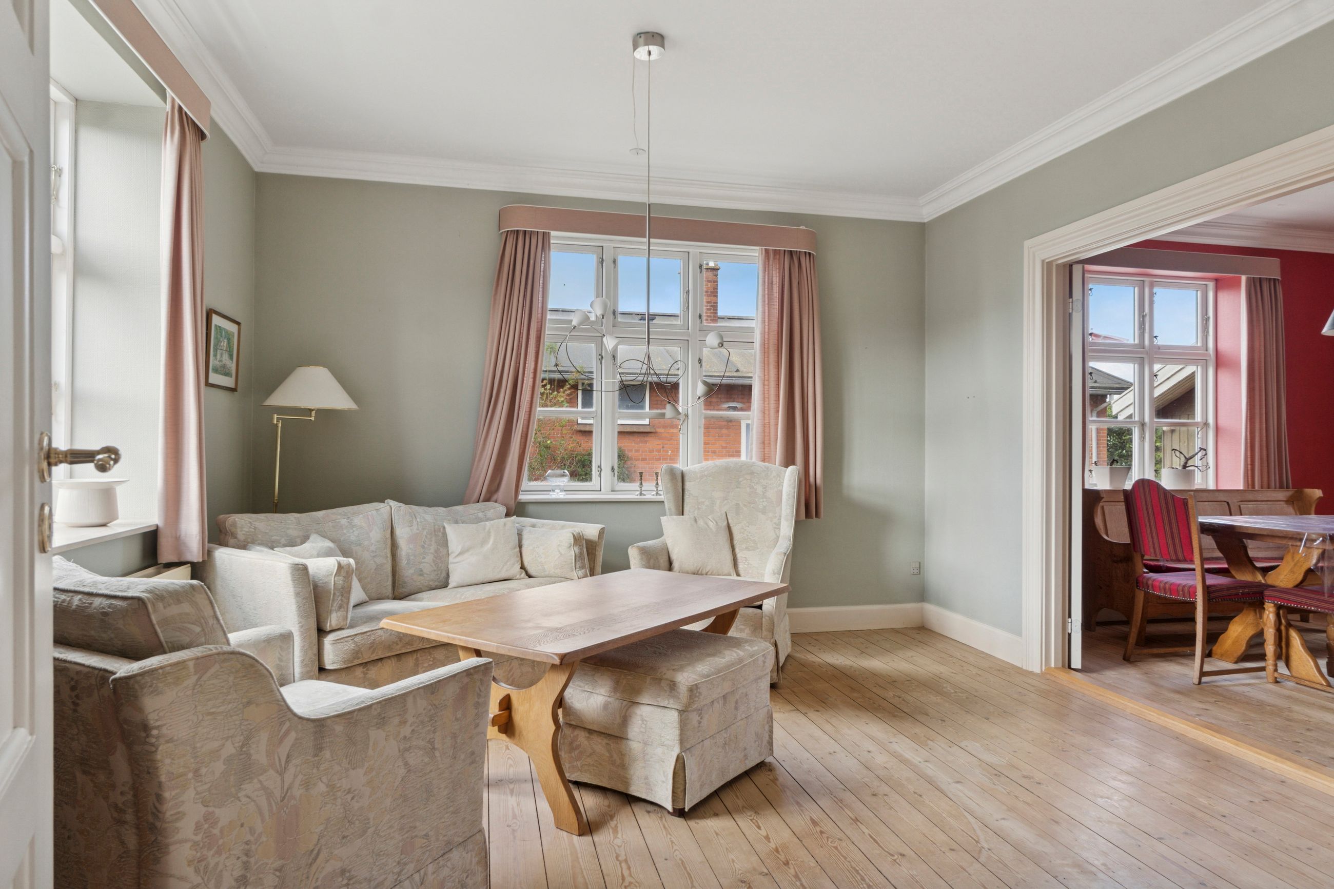 Indenfor bydes du velkommen i en indbydende entré med den smukke, originale trappe til 1. salen. Husets hjerte er det lyse køkken, som har direkte adgang til både spisestue og opholdsstue med flotte trægulve og elegante stuklofter – ideelt til både hverdagsliv og hyggelige sammenkomster.