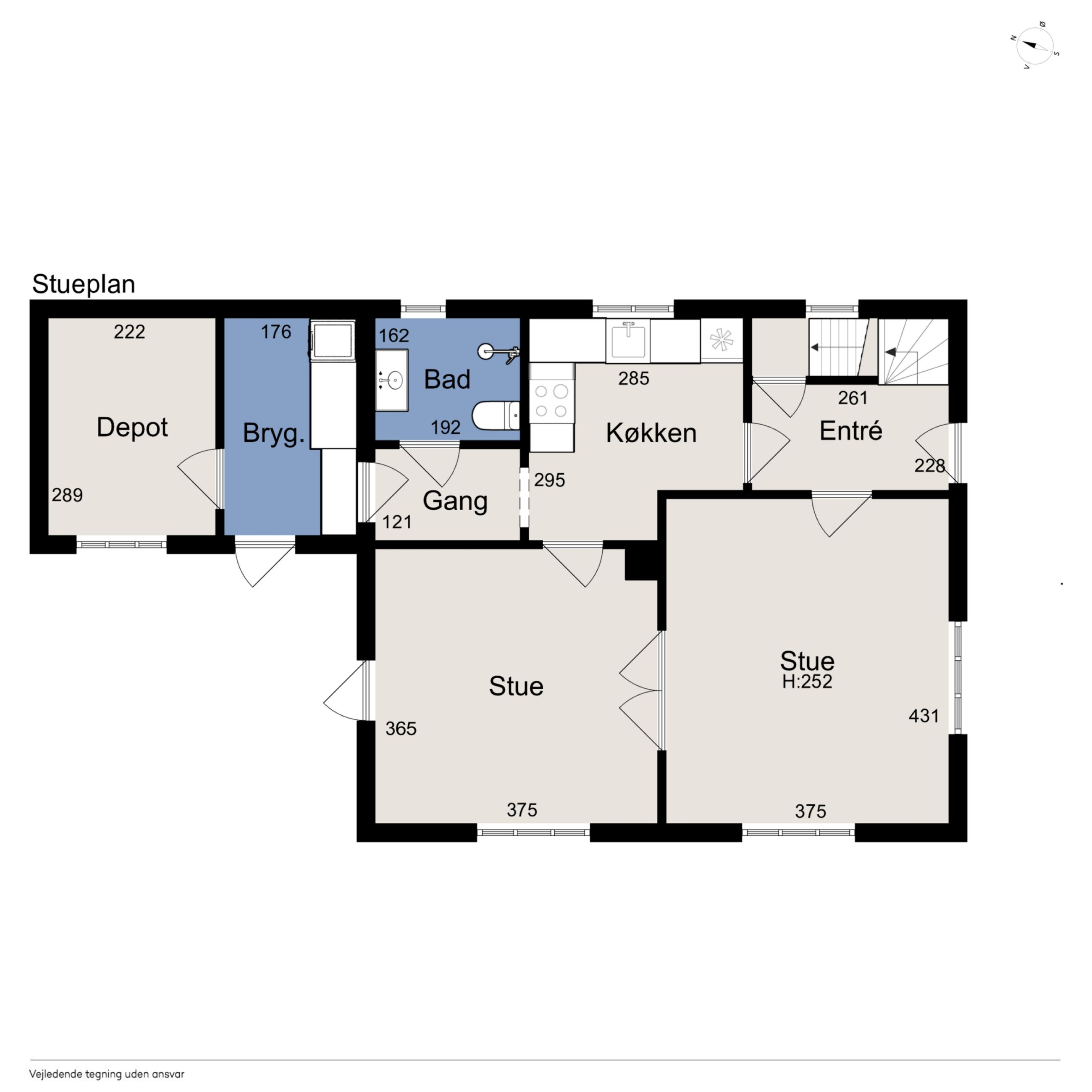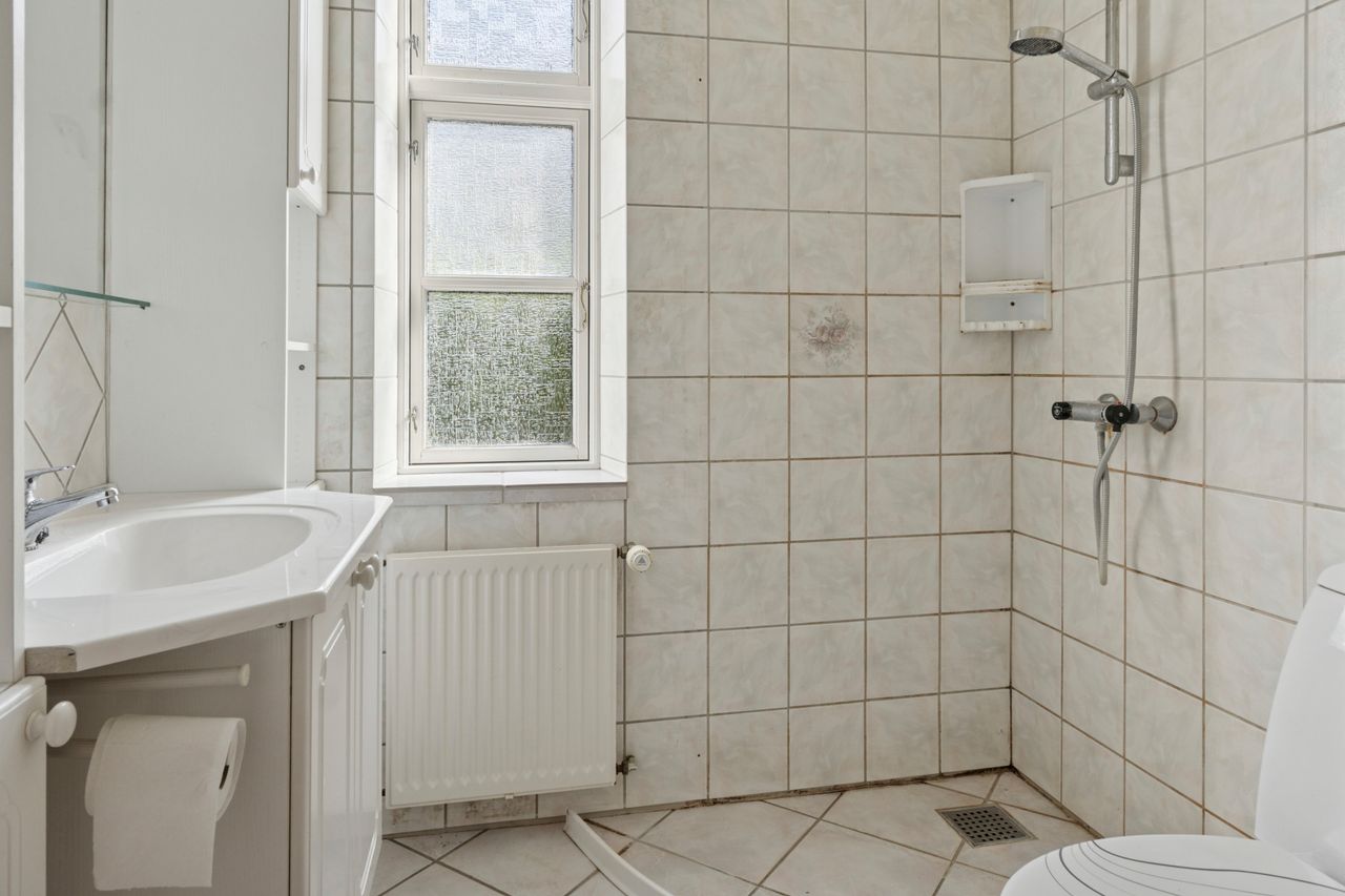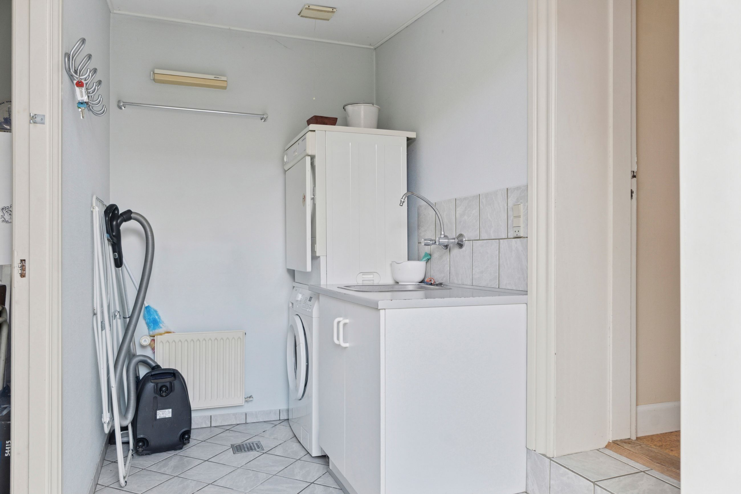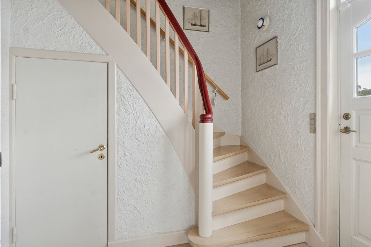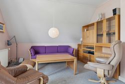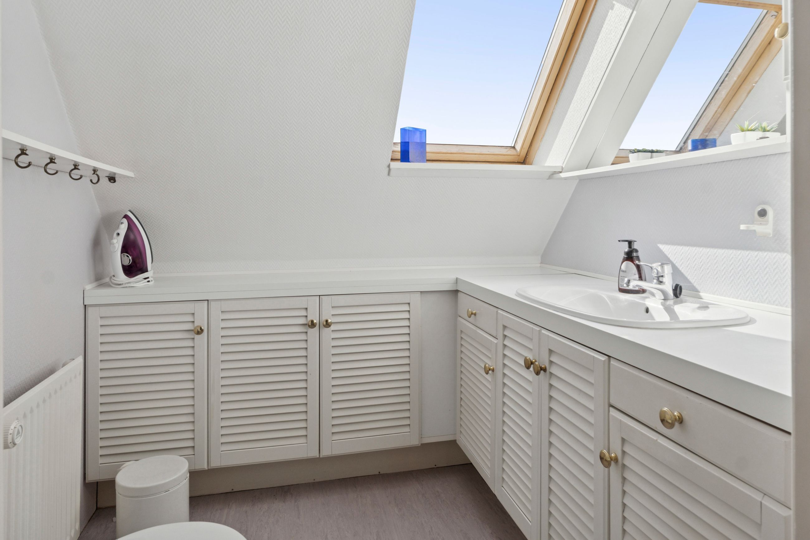 I stueplan findes desuden en mellemgang med adgang til badeværelse med gulvvarme, praktisk bryggers med separat udgang samt et disponibelt rum, der egner sig perfekt som kontor, hobbyrum eller lille værksted. Fra entré adgang til lille kælderrum.