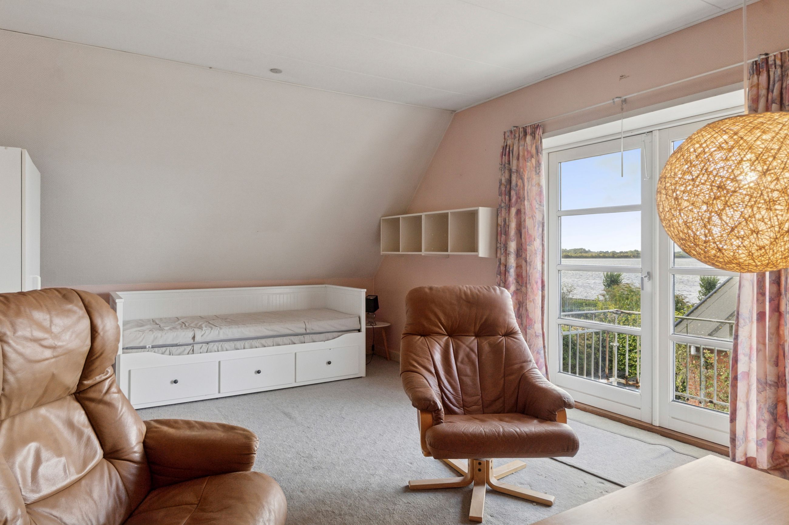 På 1. sal finder du et hyggeligt gæsteværelse, toilet samt et stort og lyst soveværelse, hvor du kan vågne til den betagende udsigt over vandet.
