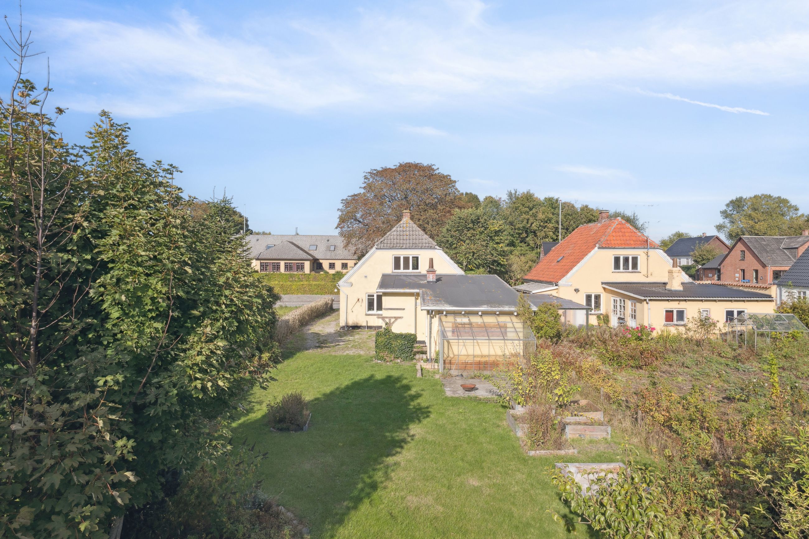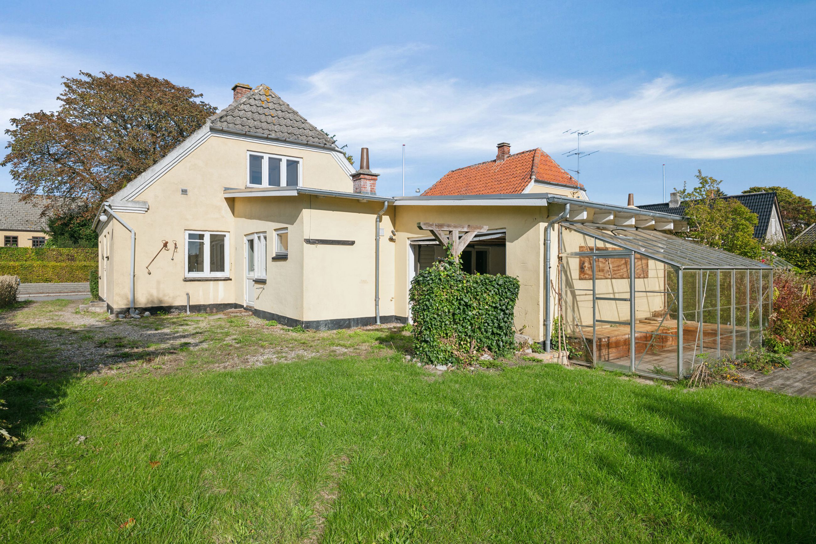 Ejendommen præsenterer sig med klassiske, gulmalede facader, solide betontagsten og vinduer i varierende alder, hvilket giver huset et autentisk og indbydende udtryk.