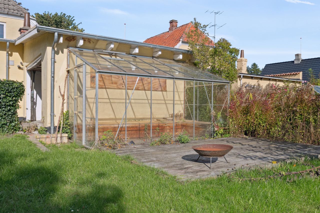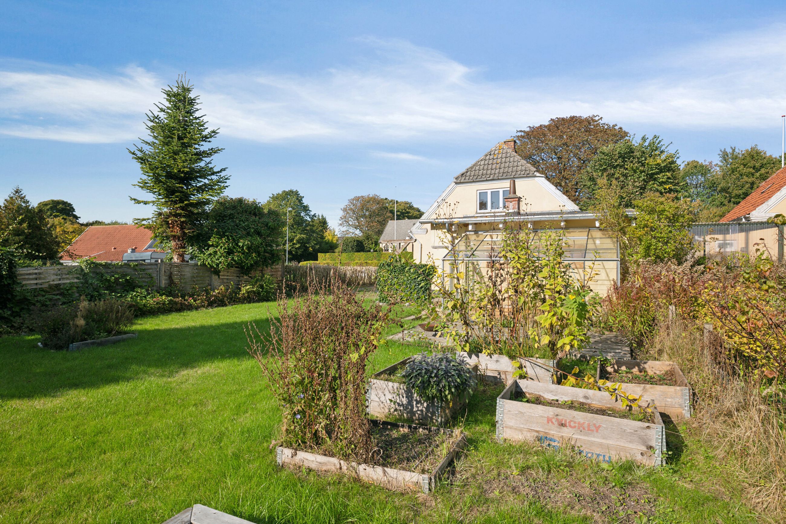 Udenfor venter en hyggelig sydvendt baghave med højt til himlen, hvor du kan nyde solen på terrassen, dyrke grønt i højbedene eller plukke bær fra buskene.