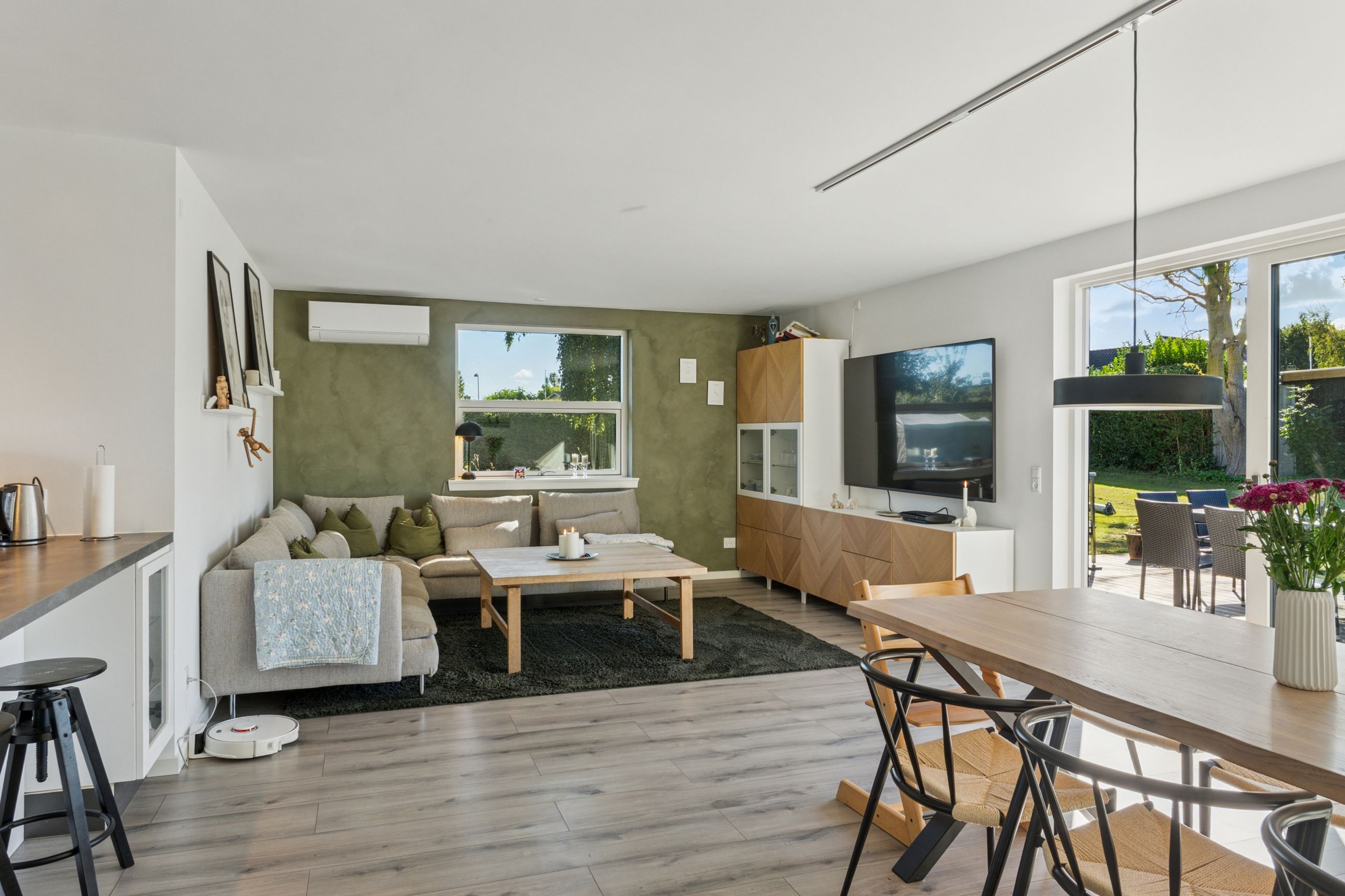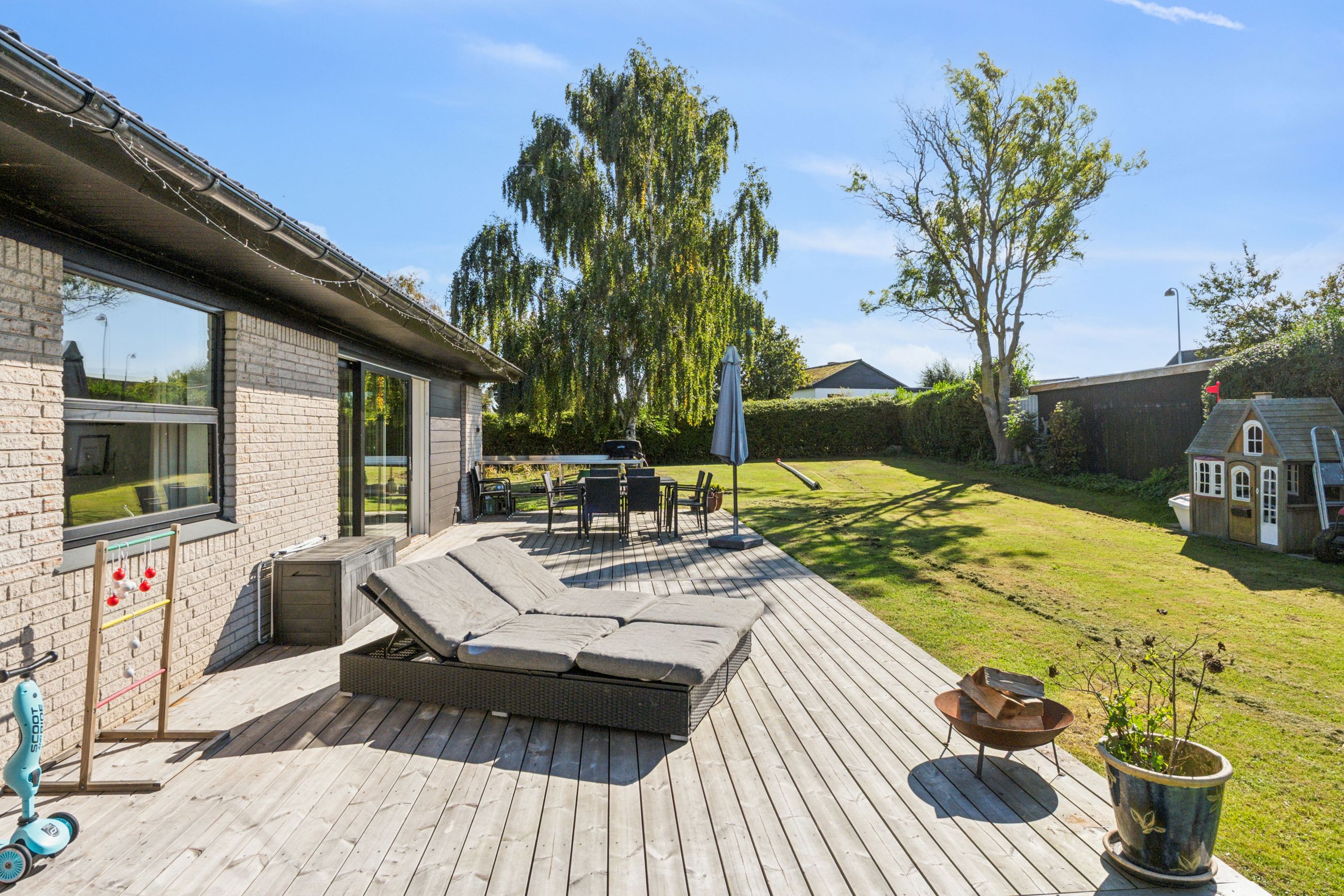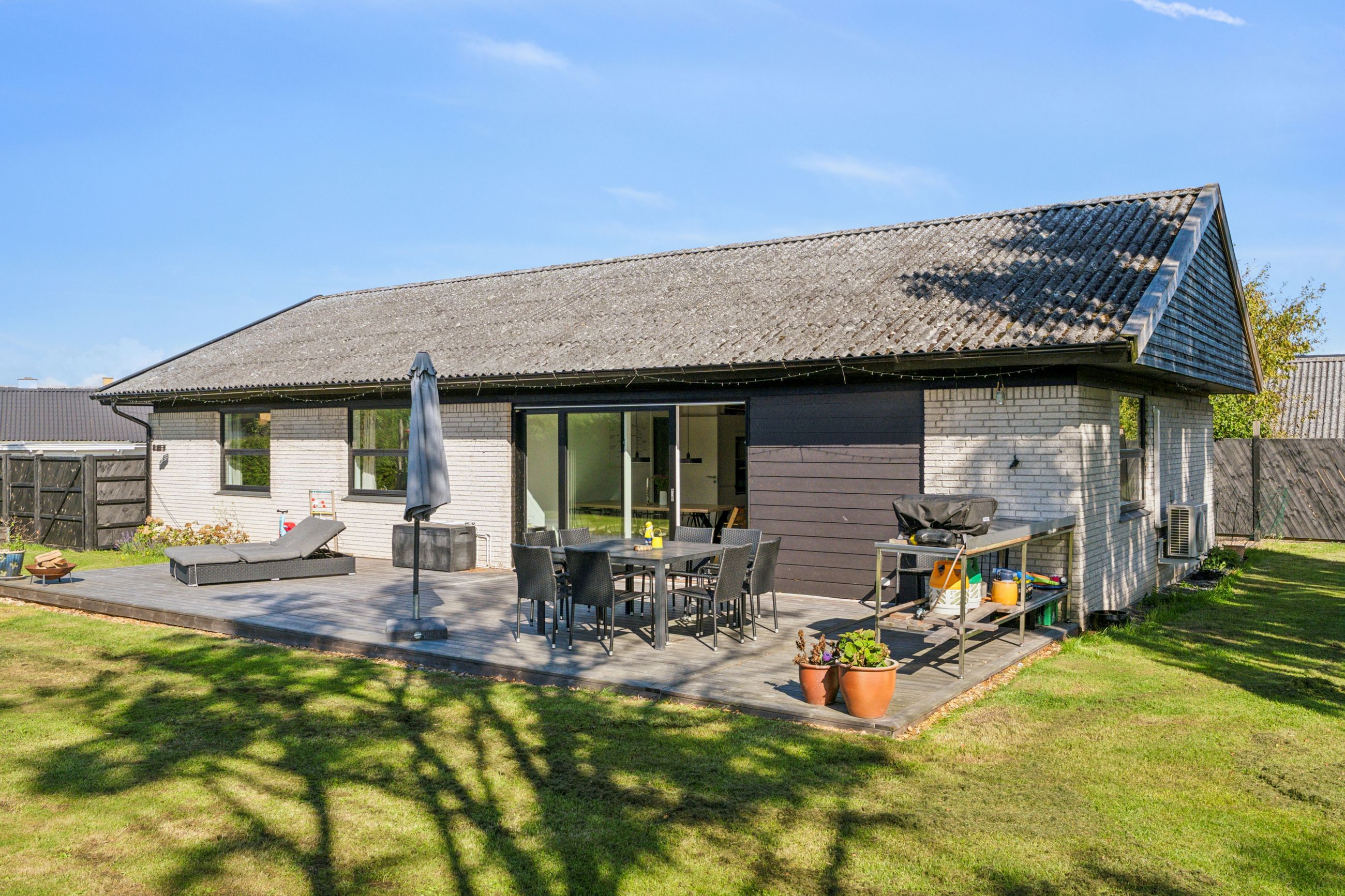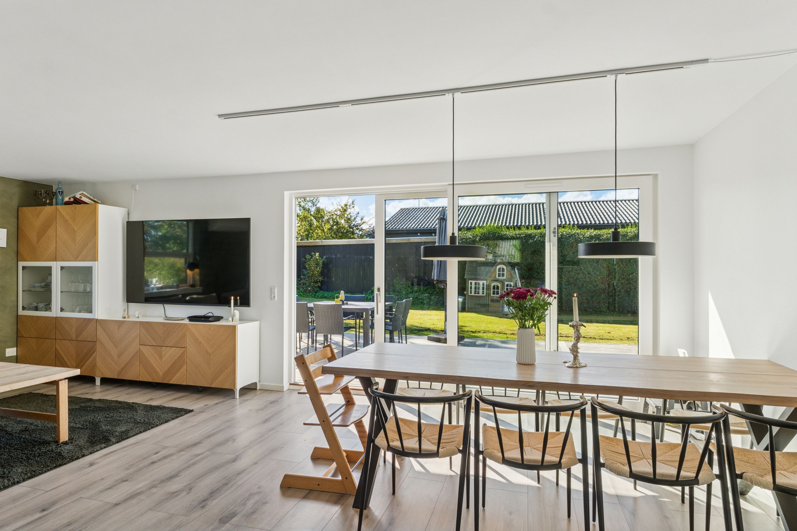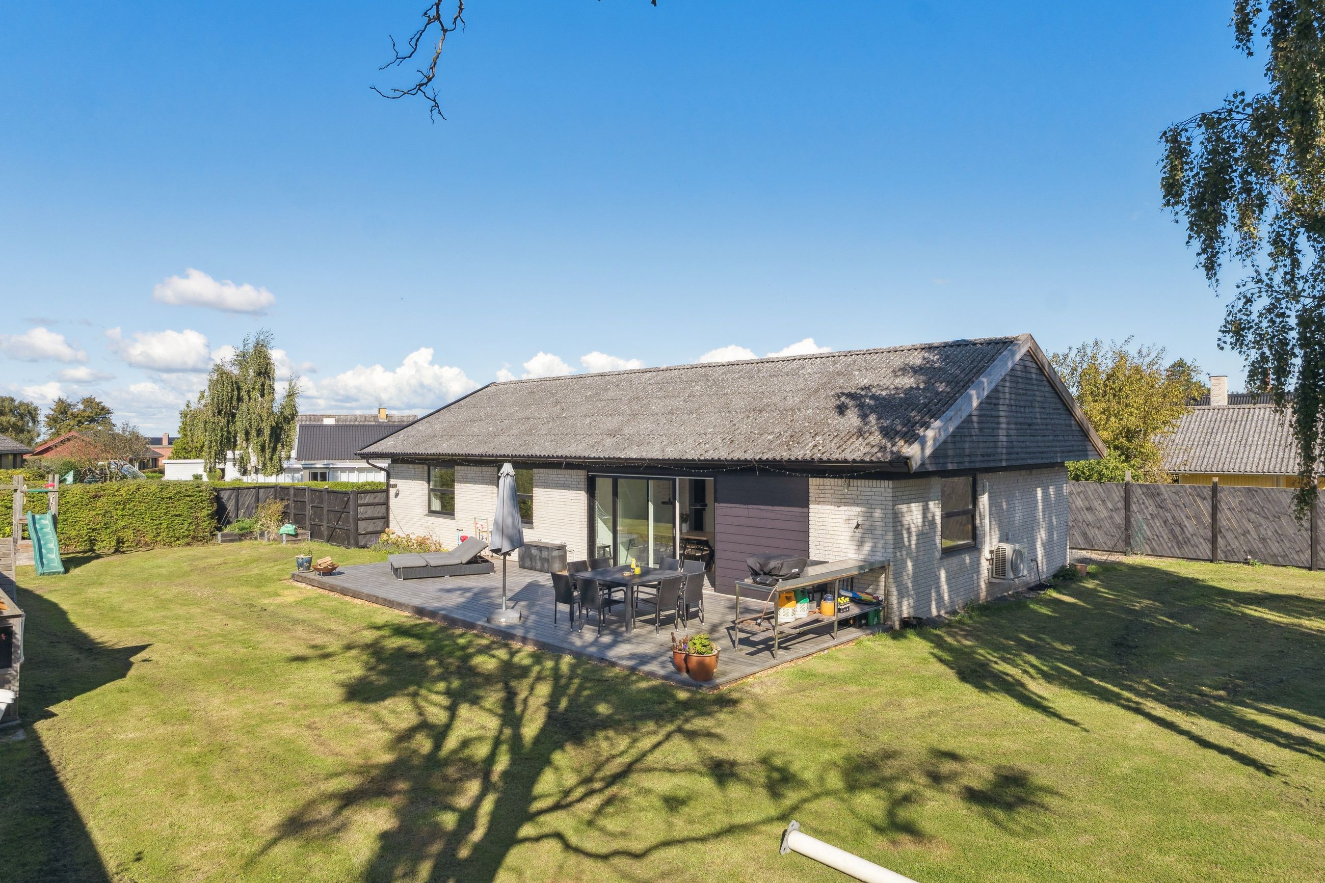 Huset byder på en stor og indbydende entré med opbevaringsplads, tre gode og regulære værelser samt et moderne badeværelse med stor bruseniche og gulvvarme. Desuden et gæstetoilet. Det store, lyse køkken-alrum er husets naturlige samlingspunkt – her er der god plads til madlavning og samvær, og det stilrene køkken i hvide elementer fremstår pænt og tidssvarende. I åben forbindelse ligger den rummelige stue, som nemt rummer både sofaafdeling og spiseplads til hele familien. Fra stuen er der direkte udgang til en stor sydvendt træterrasse – perfekt til grill, afslapning og sommeraftener i haven.