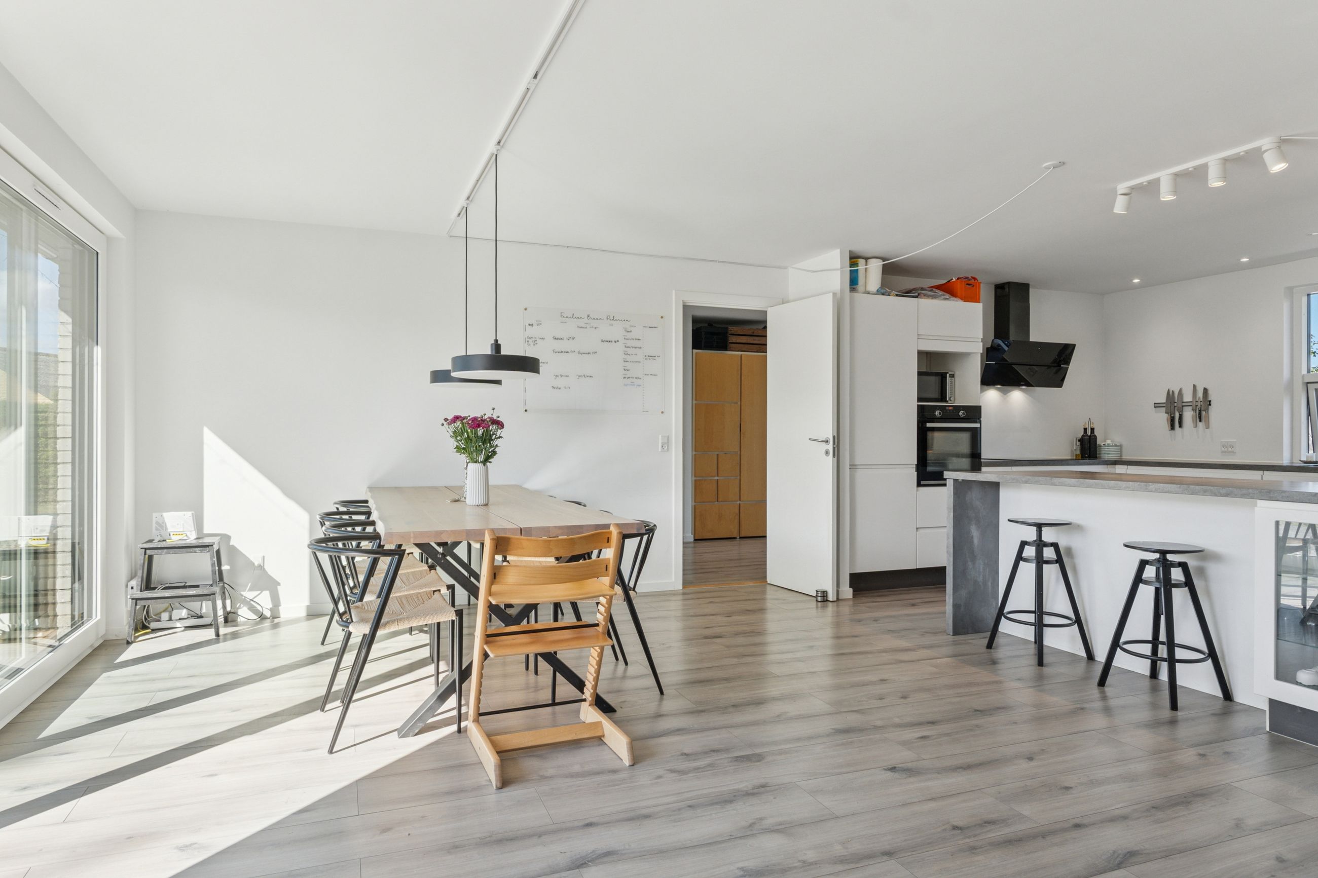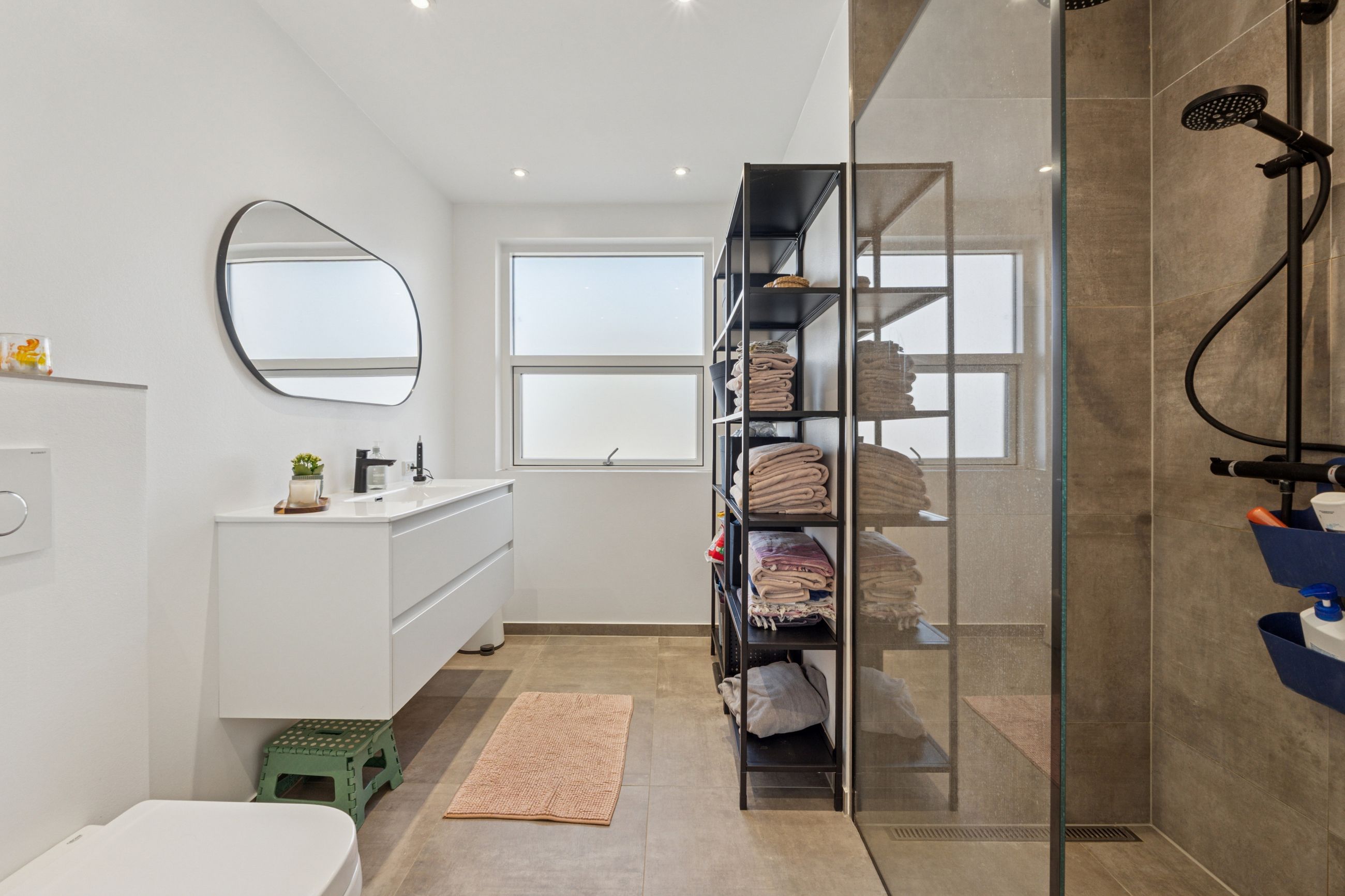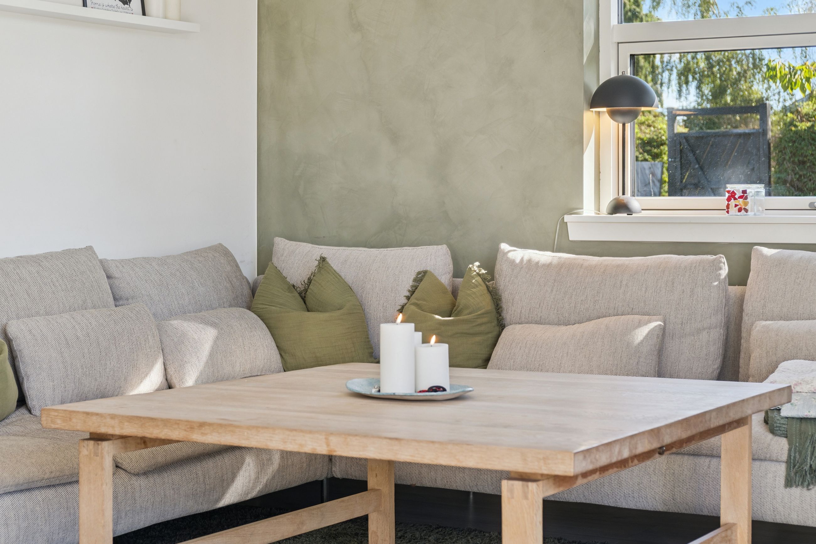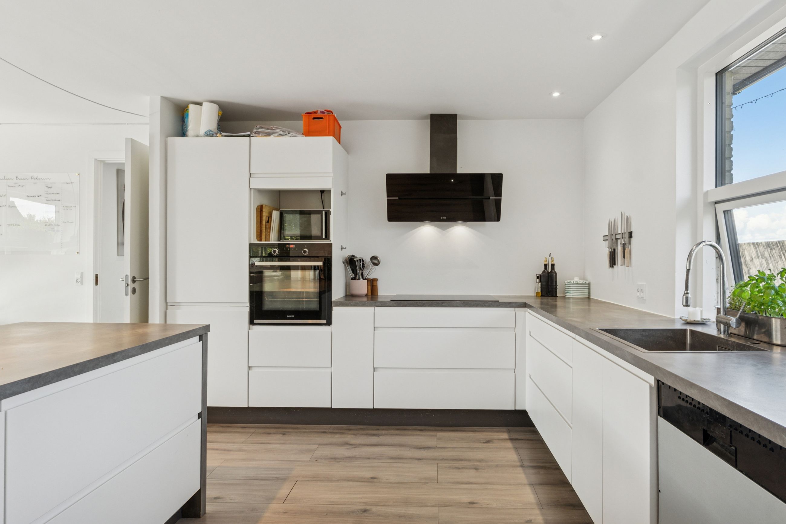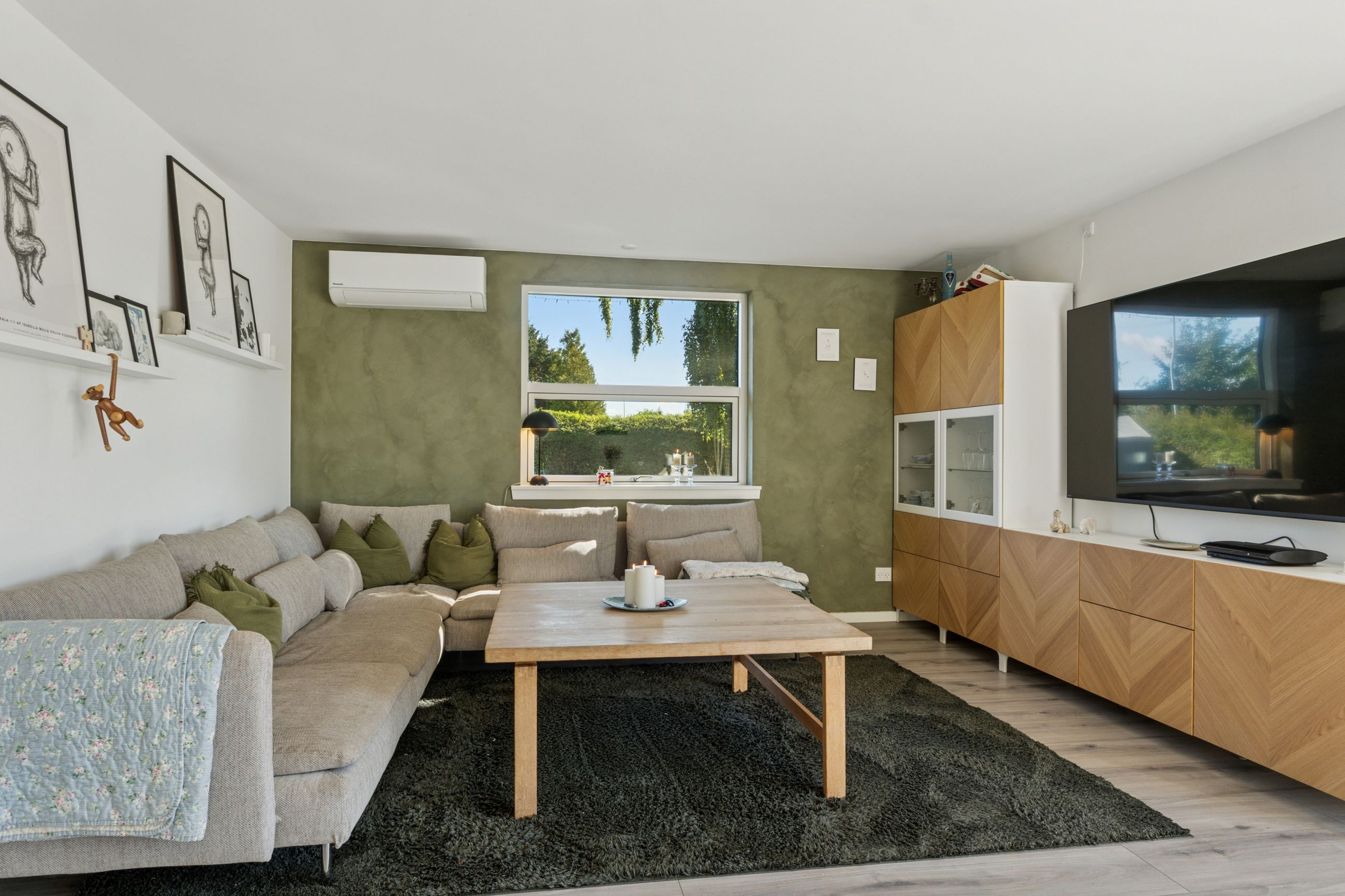 Huset byder på en stor og indbydende entré med opbevaringsplads, tre gode og regulære værelser samt et moderne badeværelse med stor bruseniche og gulvvarme. Desuden et gæstetoilet. Det store, lyse køkken-alrum er husets naturlige samlingspunkt – her er der god plads til madlavning og samvær, og det stilrene køkken i hvide elementer fremstår pænt og tidssvarende. I åben forbindelse ligger den rummelige stue, som nemt rummer både sofaafdeling og spiseplads til hele familien. Fra stuen er der direkte udgang til en stor sydvendt træterrasse – perfekt til grill, afslapning og sommeraftener i haven.
