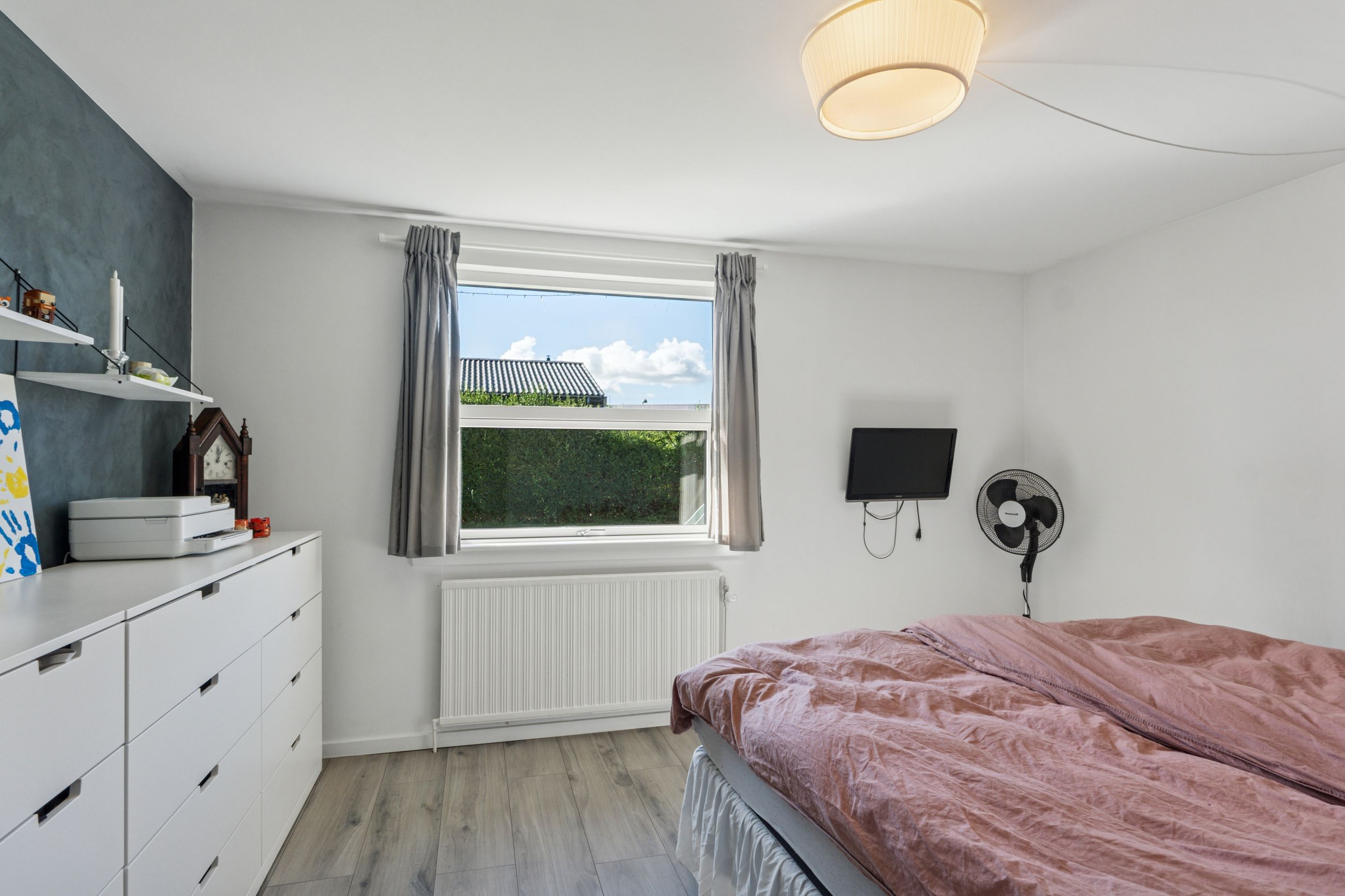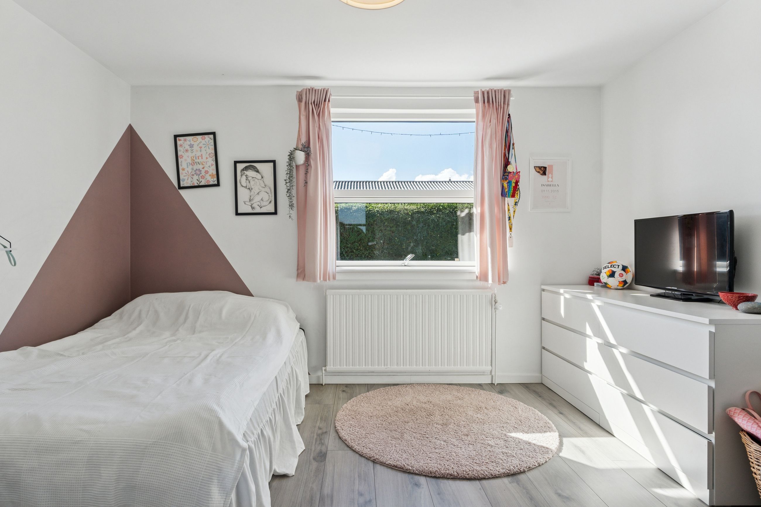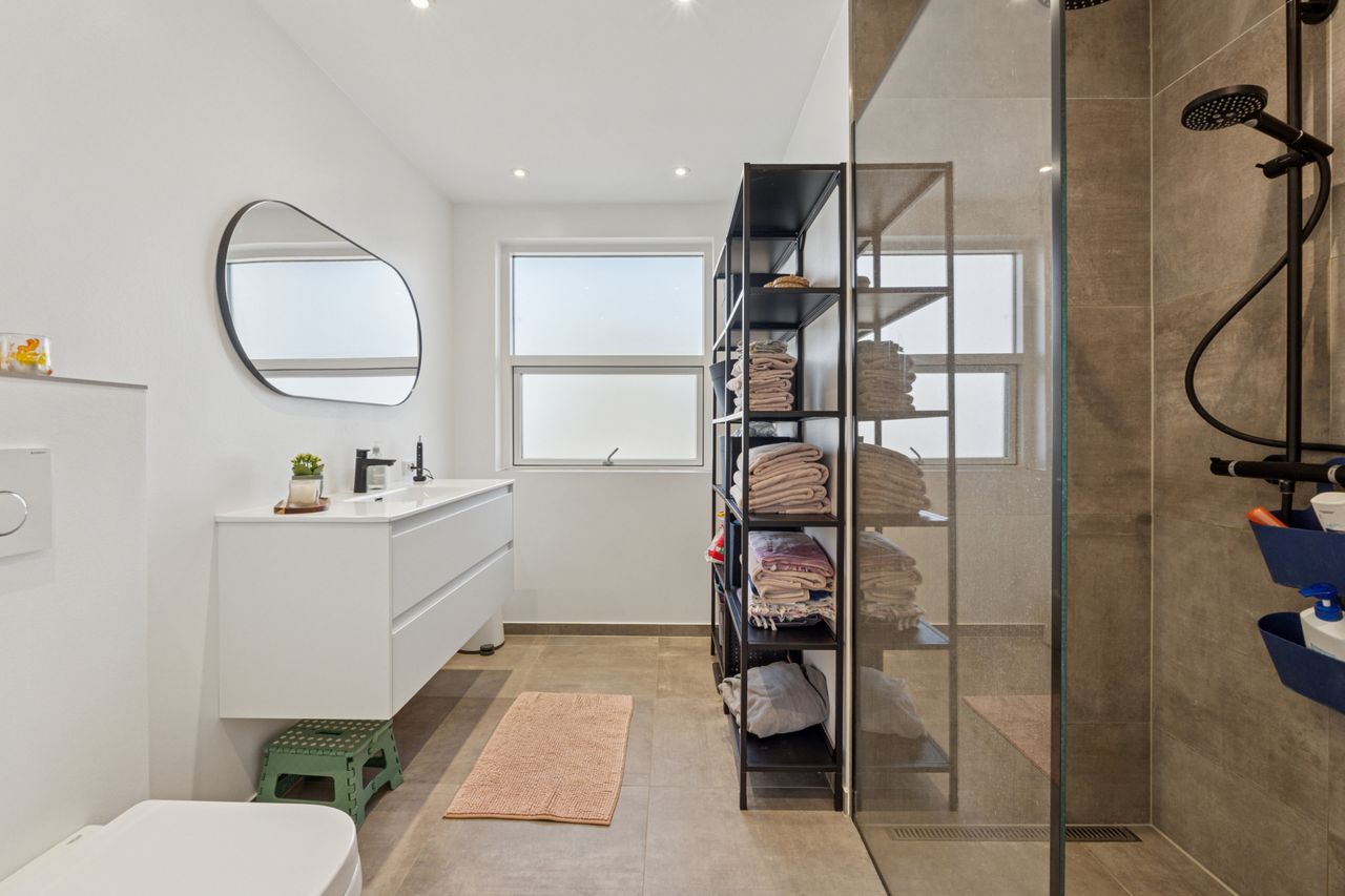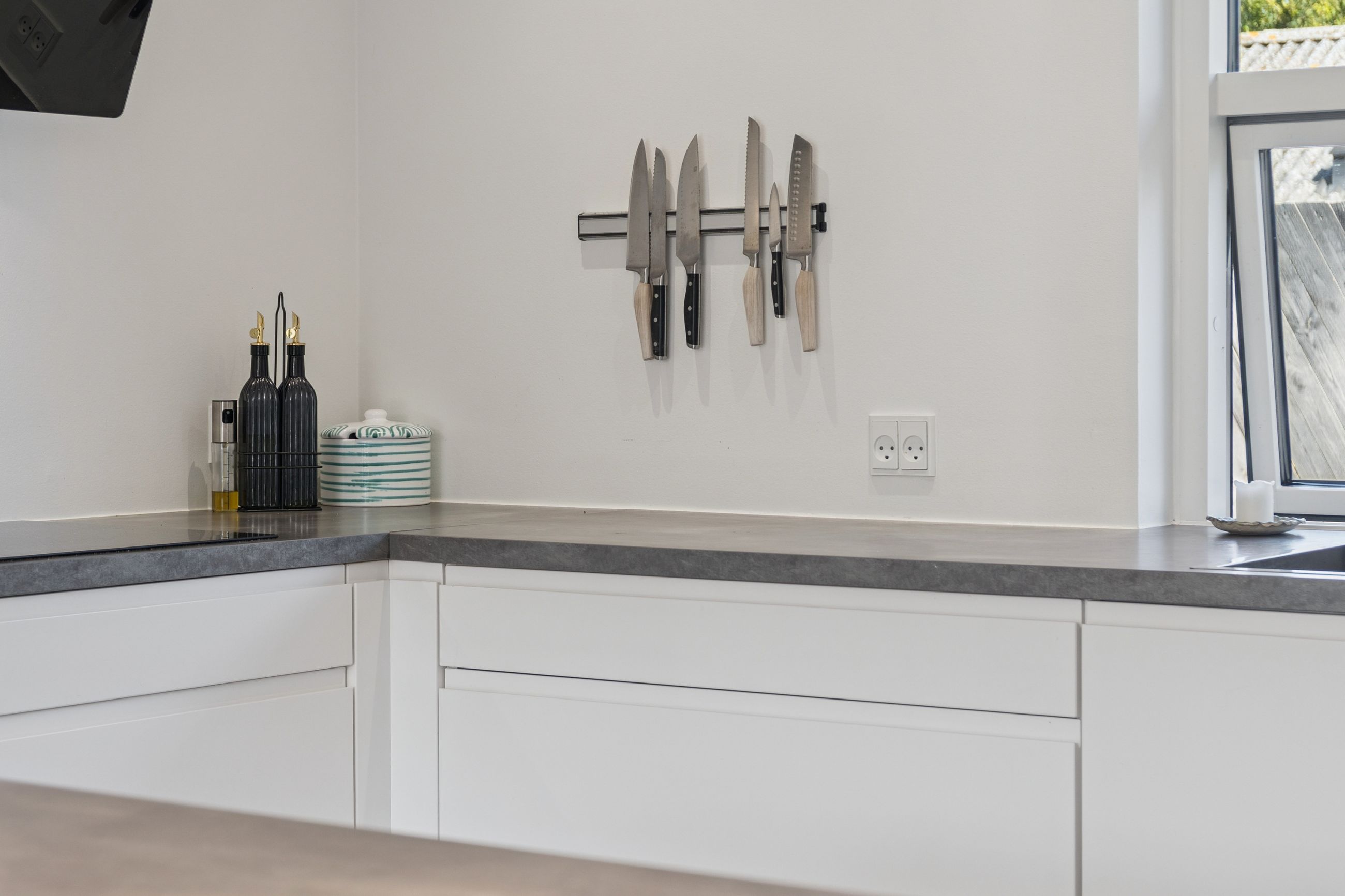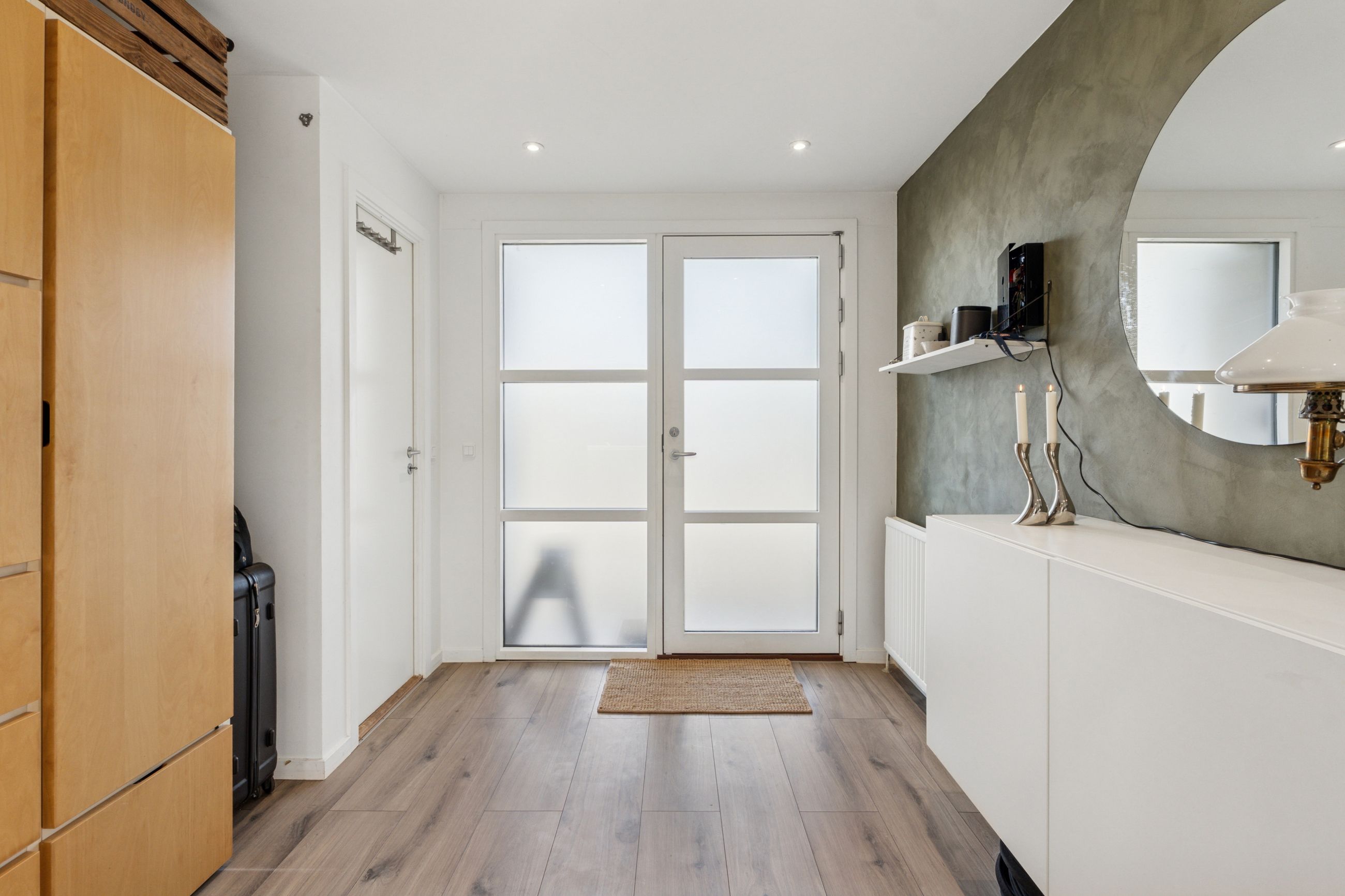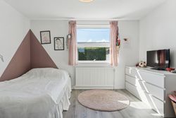 Huset byder på en stor og indbydende entré med opbevaringsplads, tre gode og regulære værelser samt et moderne badeværelse med stor bruseniche og gulvvarme. Desuden et gæstetoilet. Det store, lyse køkken-alrum er husets naturlige samlingspunkt – her er der god plads til madlavning og samvær, og det stilrene køkken i hvide elementer fremstår pænt og tidssvarende. I åben forbindelse ligger den rummelige stue, som nemt rummer både sofaafdeling og spiseplads til hele familien. Fra stuen er der direkte udgang til en stor sydvendt træterrasse – perfekt til grill, afslapning og sommeraftener i haven.