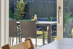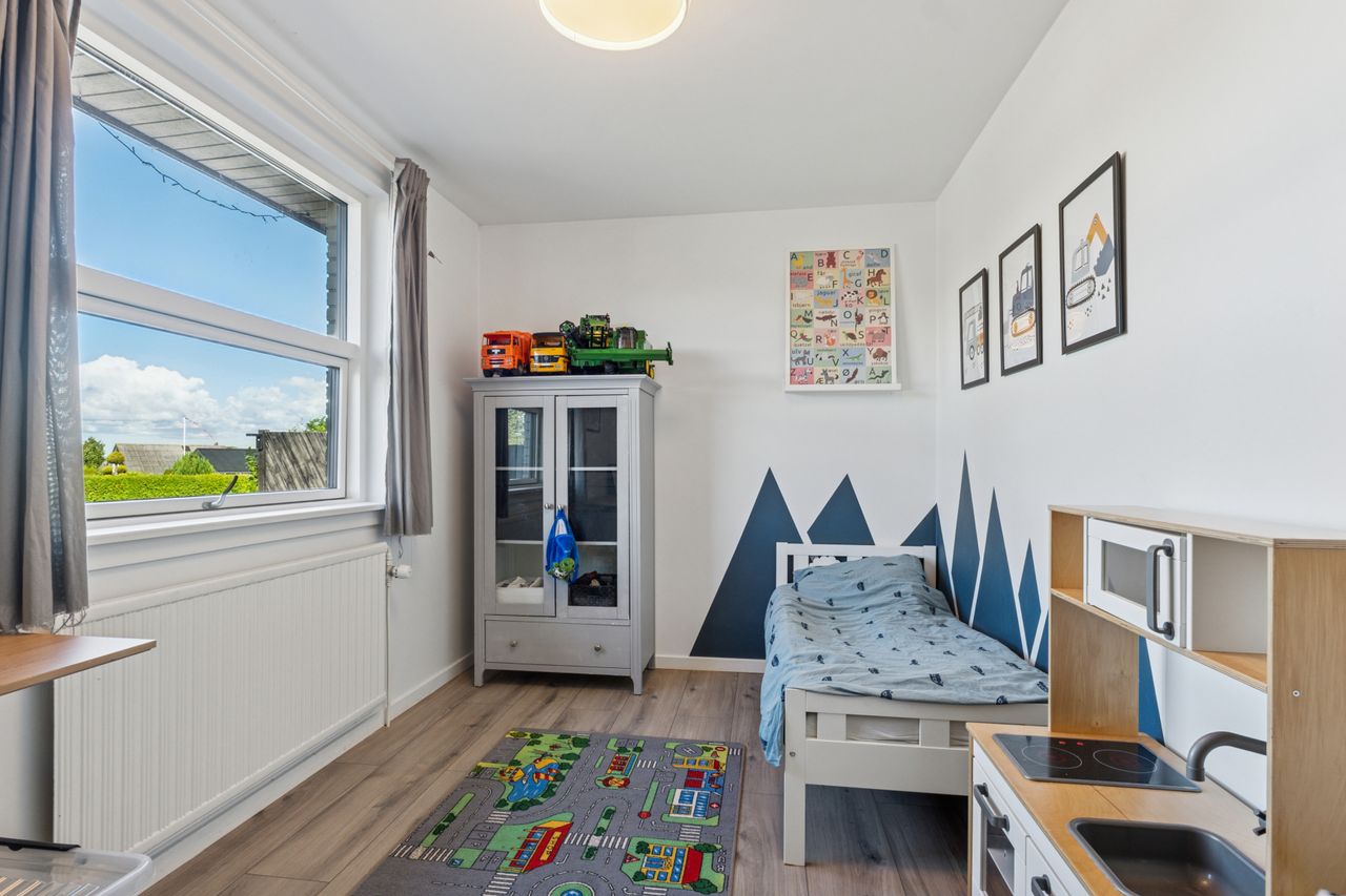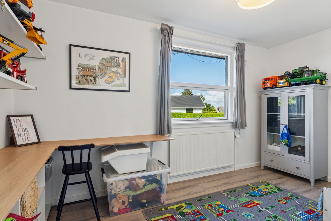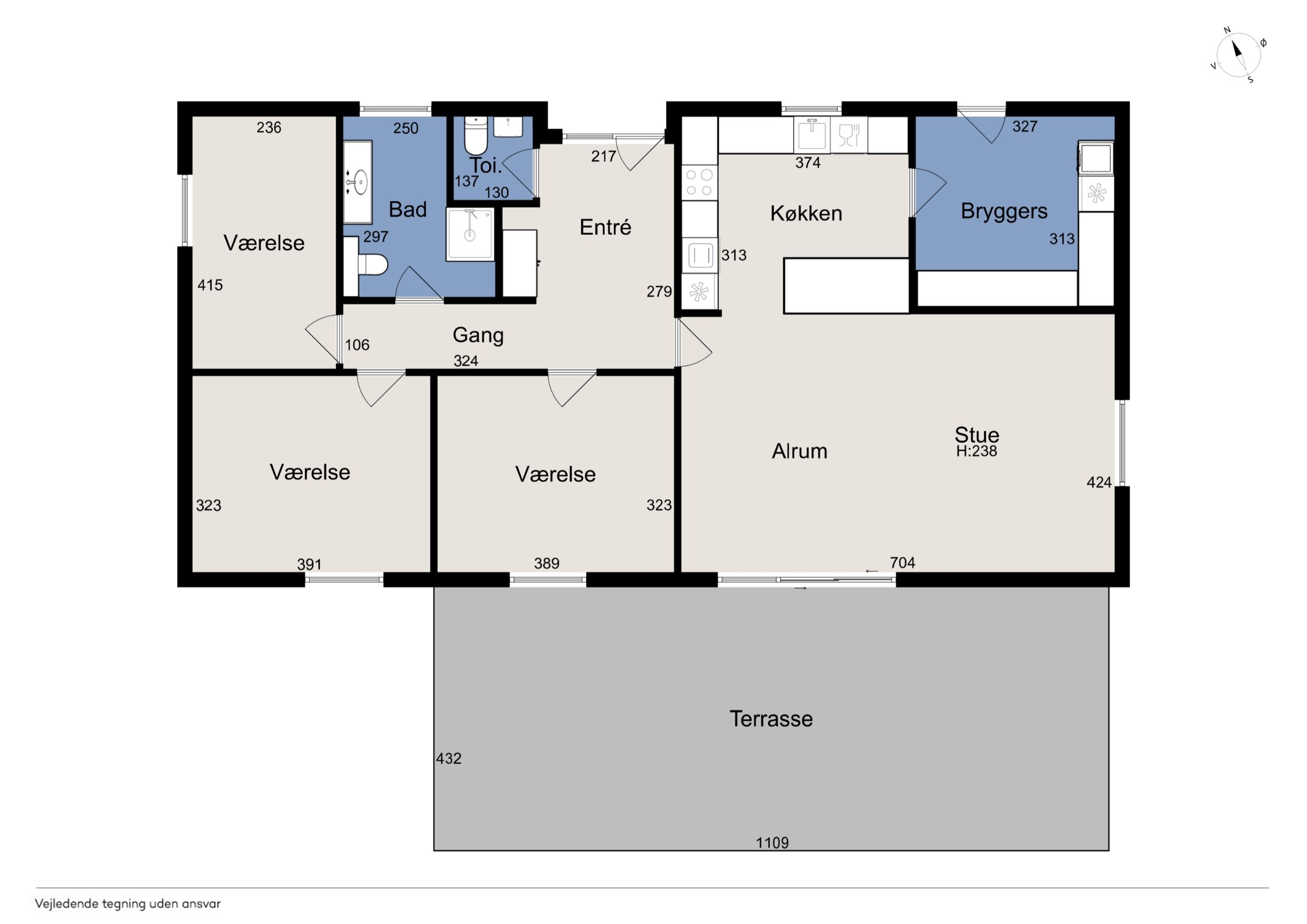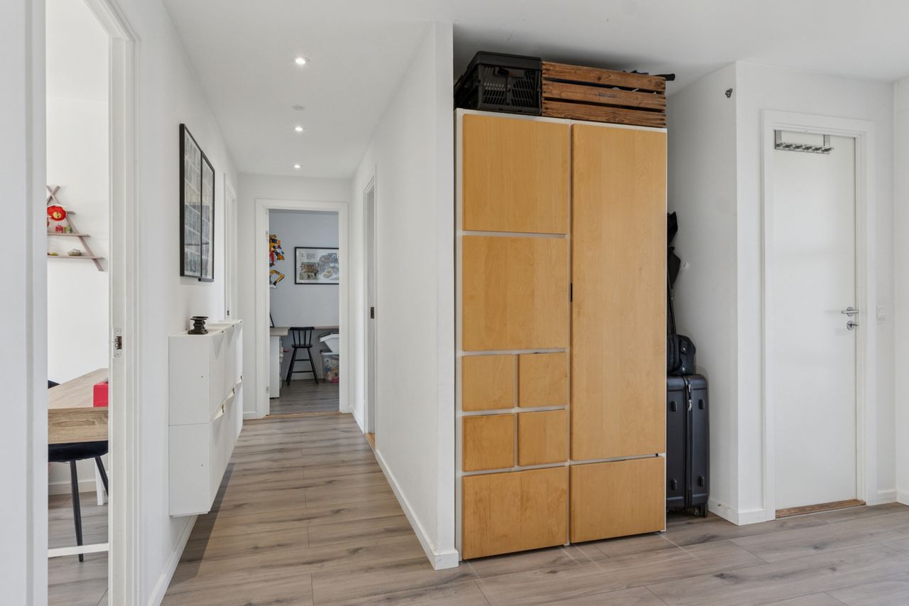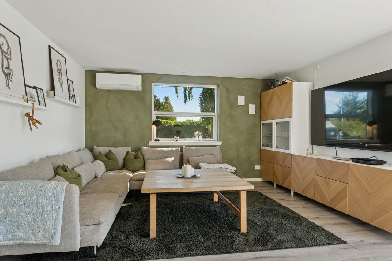 Huset byder på en stor og indbydende entré med opbevaringsplads, tre gode og regulære værelser samt et moderne badeværelse med stor bruseniche og gulvvarme. Desuden et gæstetoilet. Det store, lyse køkken-alrum er husets naturlige samlingspunkt – her er der god plads til madlavning og samvær, og det stilrene køkken i hvide elementer fremstår pænt og tidssvarende. I åben forbindelse ligger den rummelige stue, som nemt rummer både sofaafdeling og spiseplads til hele familien. Fra stuen er der direkte udgang til en stor sydvendt træterrasse – perfekt til grill, afslapning og sommeraftener i haven.