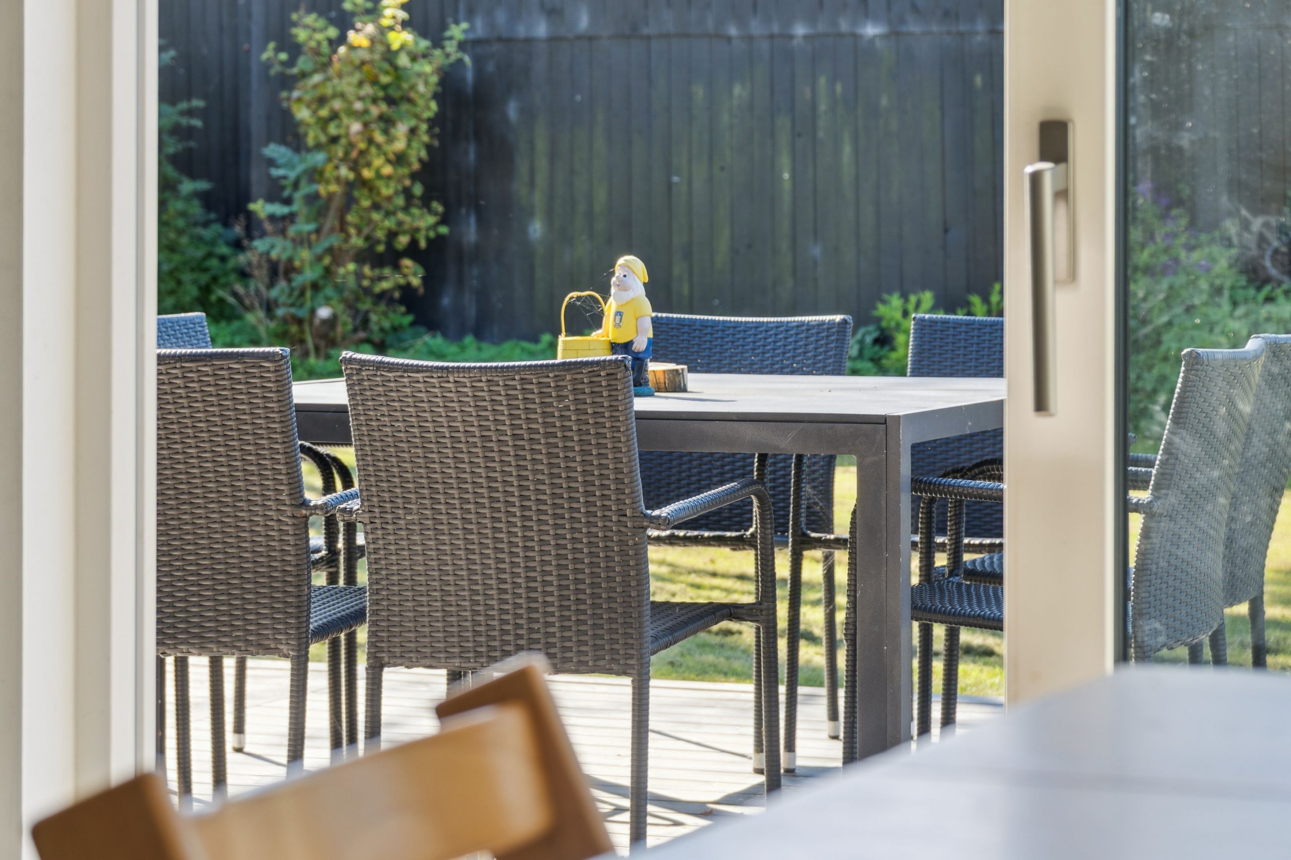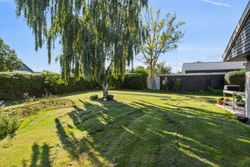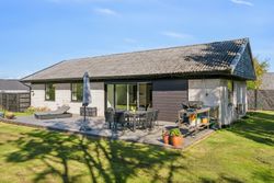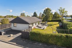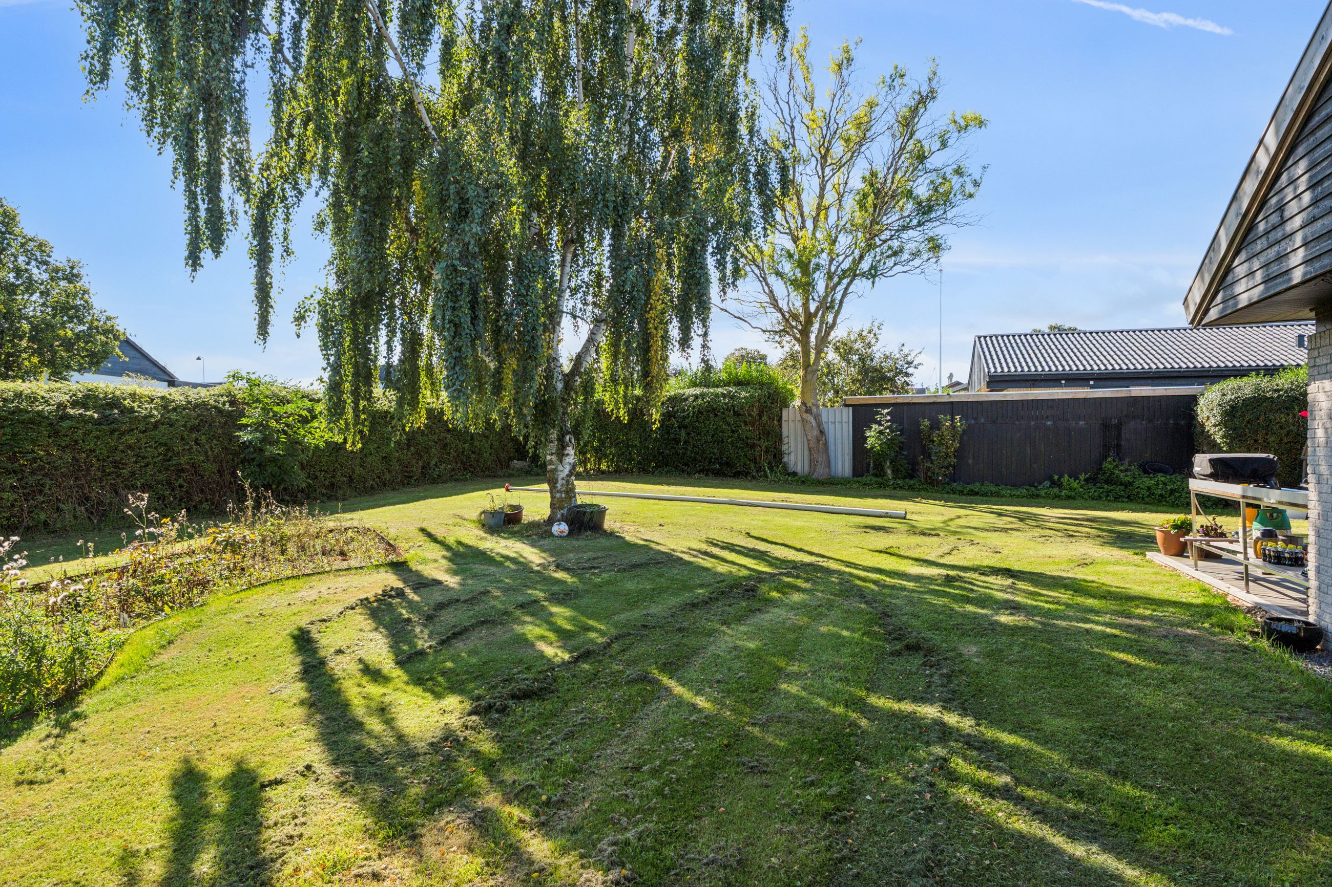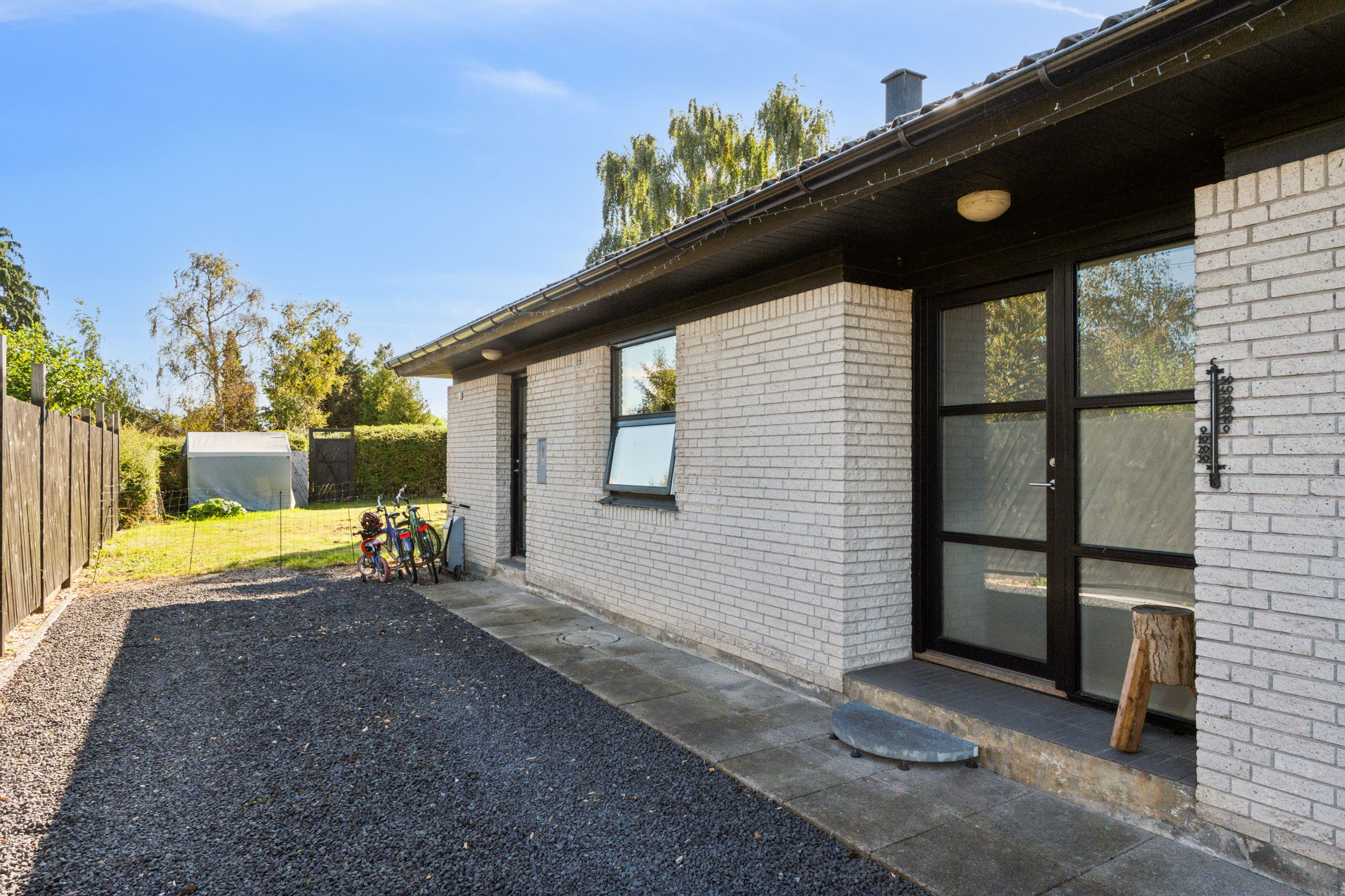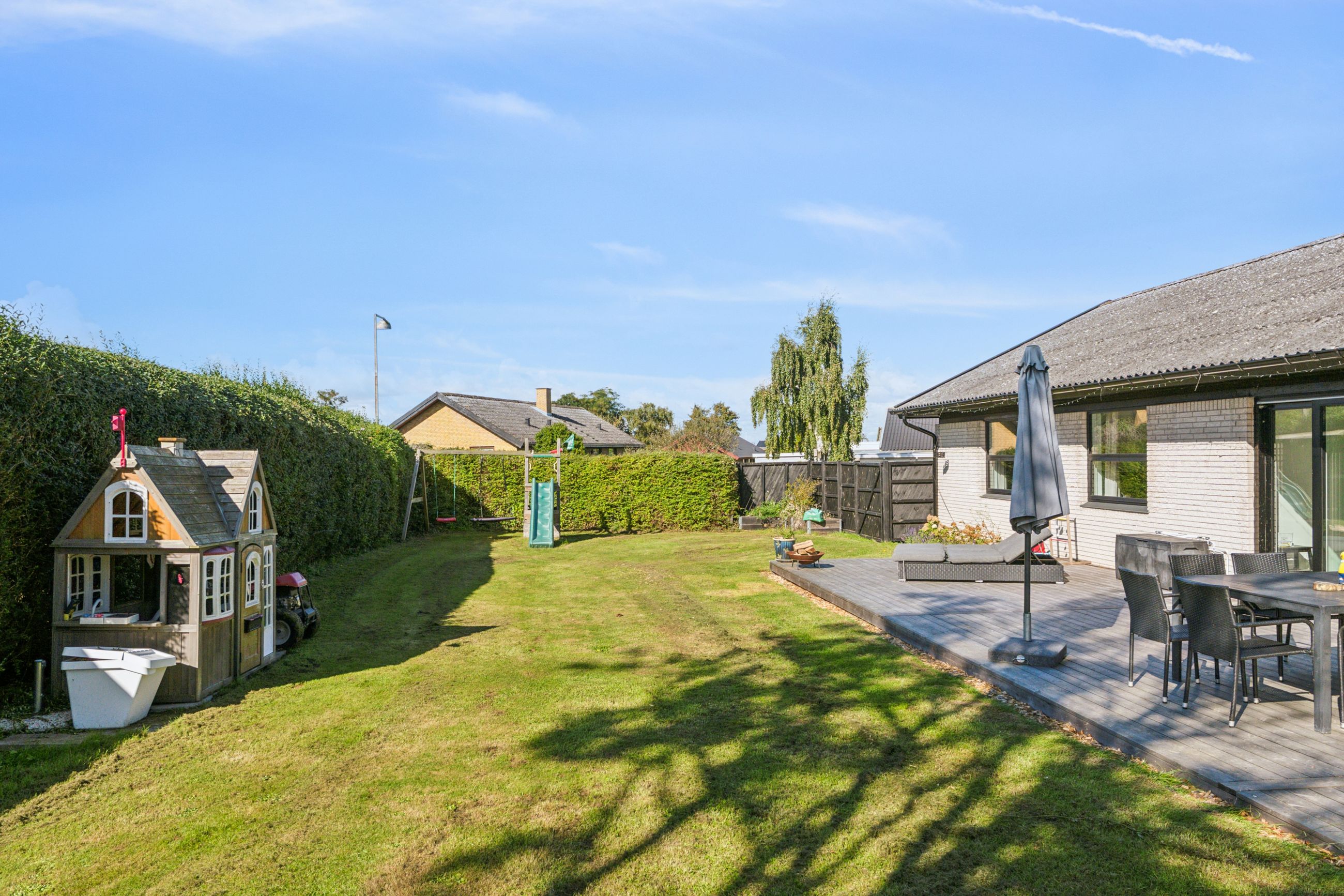 Haven er primært udlagt med græs og kræver minimal vedligeholdelse – der er god plads til leg, boldspil og hyggelige stunder. Foran huset finder du en stor, stenbelagt indkørsel med plads til flere biler.