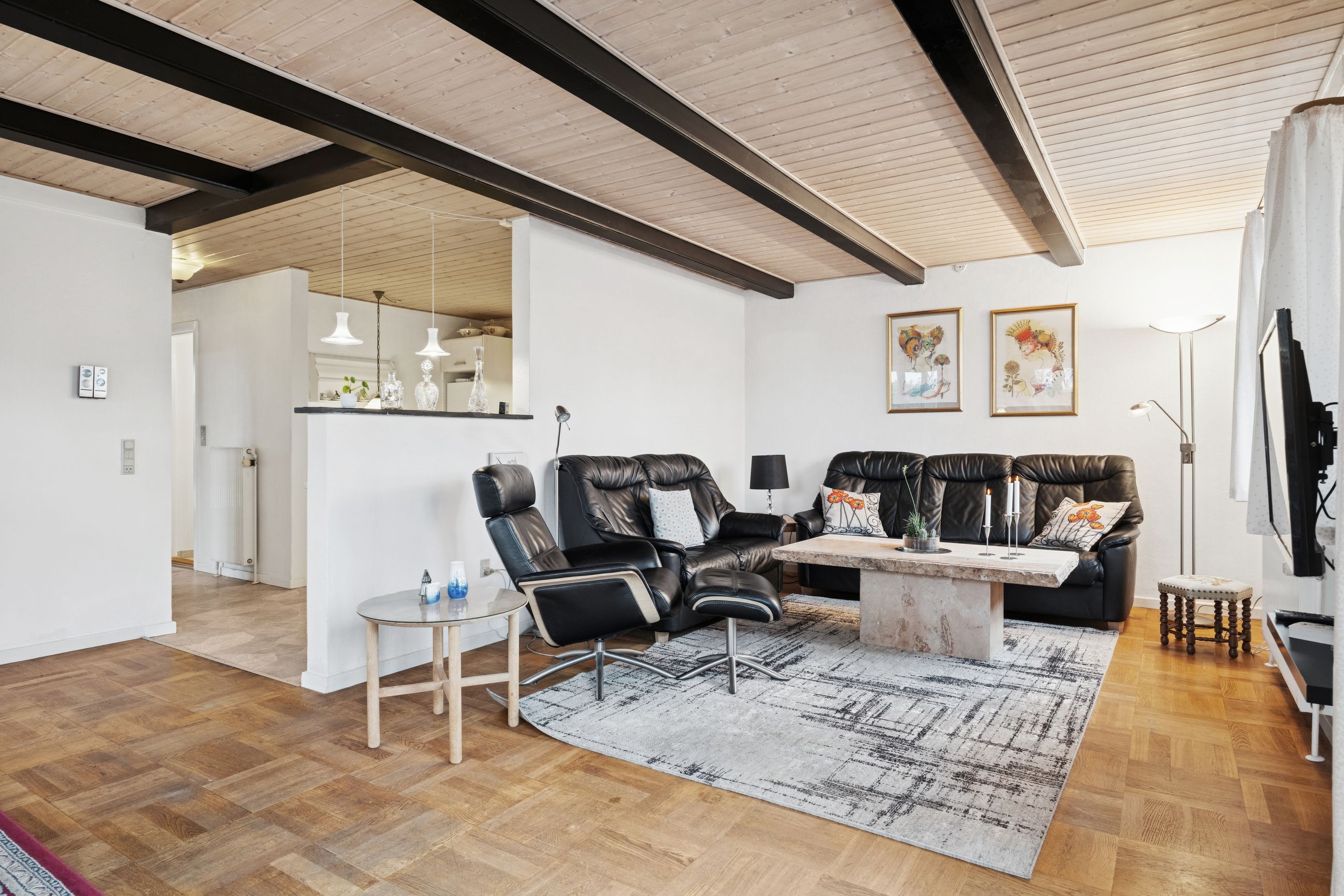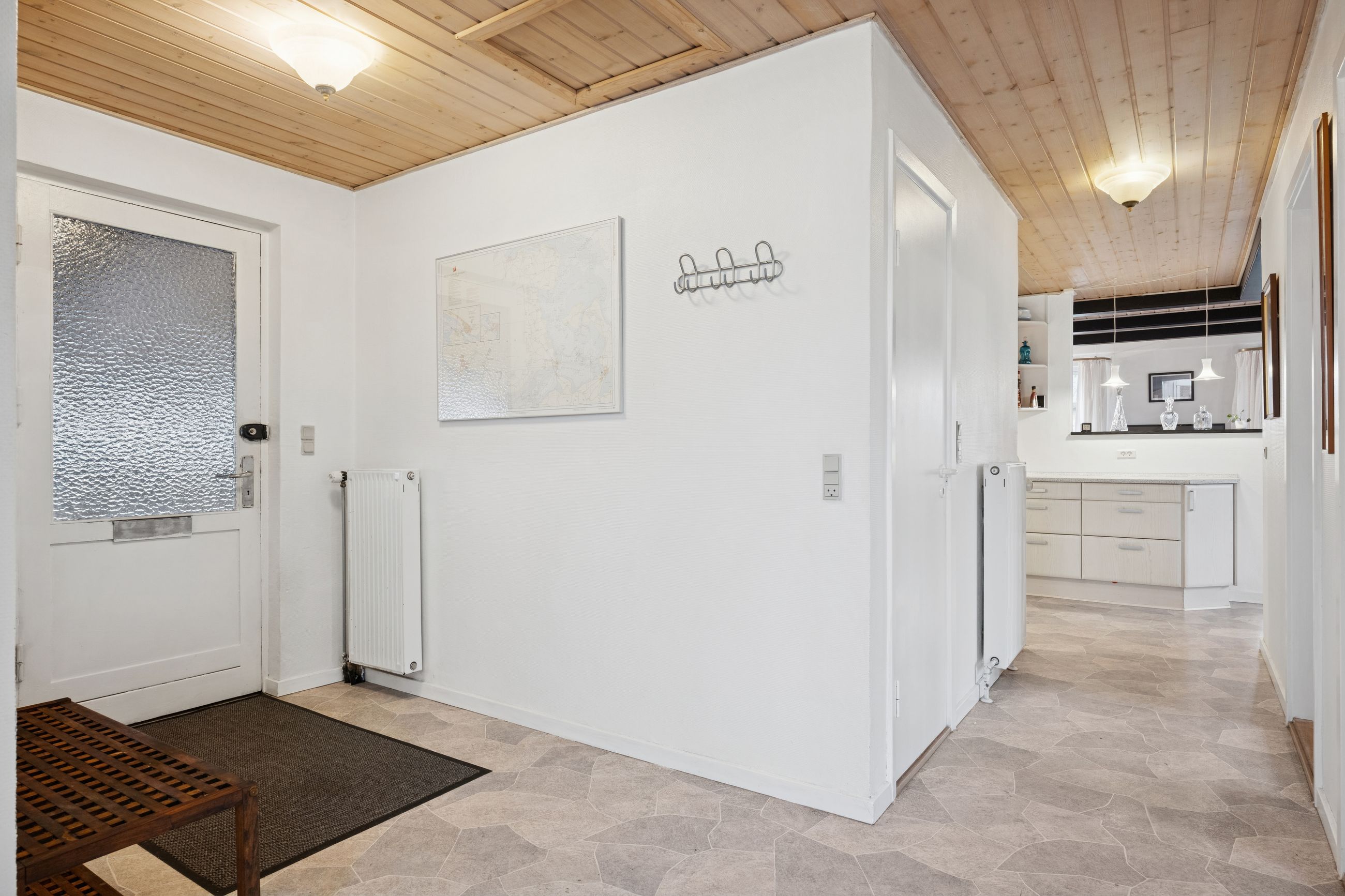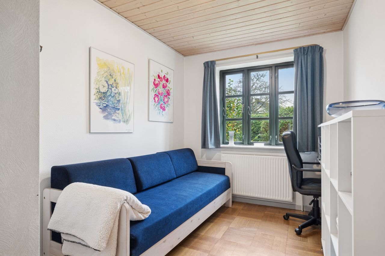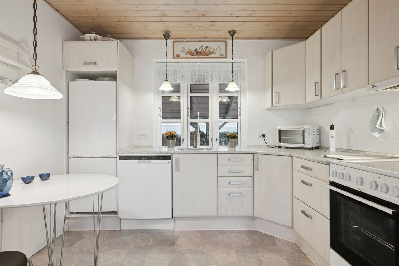 Fra den lyse og rummelige fordelingsgang har du adgang til badeværelset, der er udstyret med gulvvarme, samt et soveværelse og et ekstra værelse, der kan anvendes til børneværelse, kontor eller gæsteværelse. De lyse rum giver en god følelse af luft og plads. Køkkenet ligger i åben forbindelse til både spisestuen og opholdsstuen, hvilket skaber et dejligt og socialt rum, hvor man kan være sammen som familie eller med venner. Køkkenet er funktionelt indrettet og giver mulighed for at tilberede måltider, samtidig med at man kan være en del af samværet i de øvrige opholdsrum.