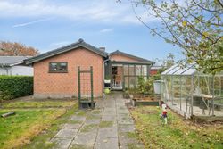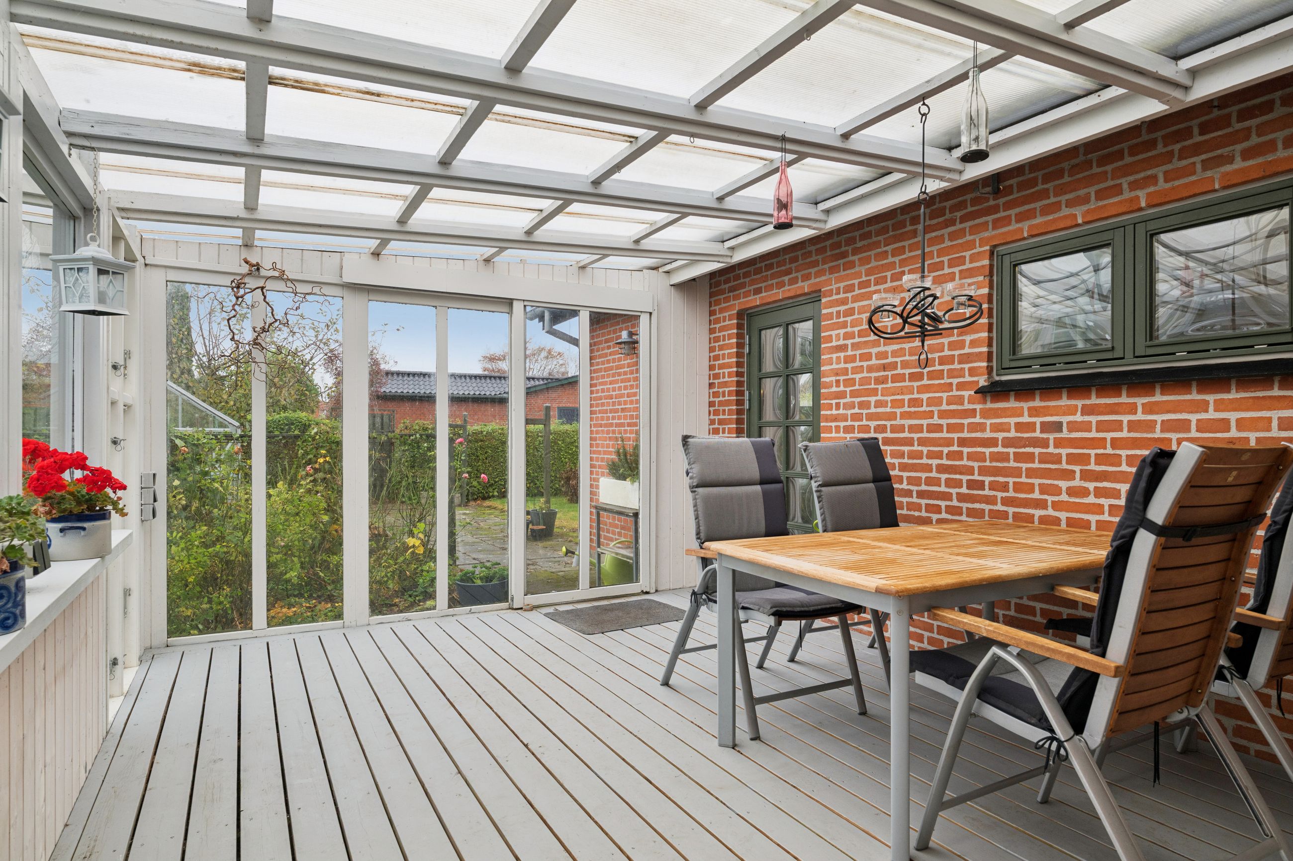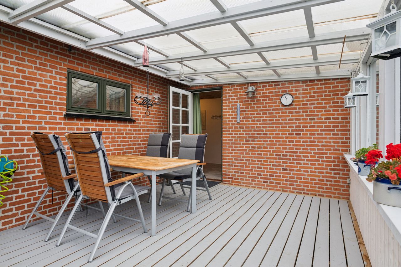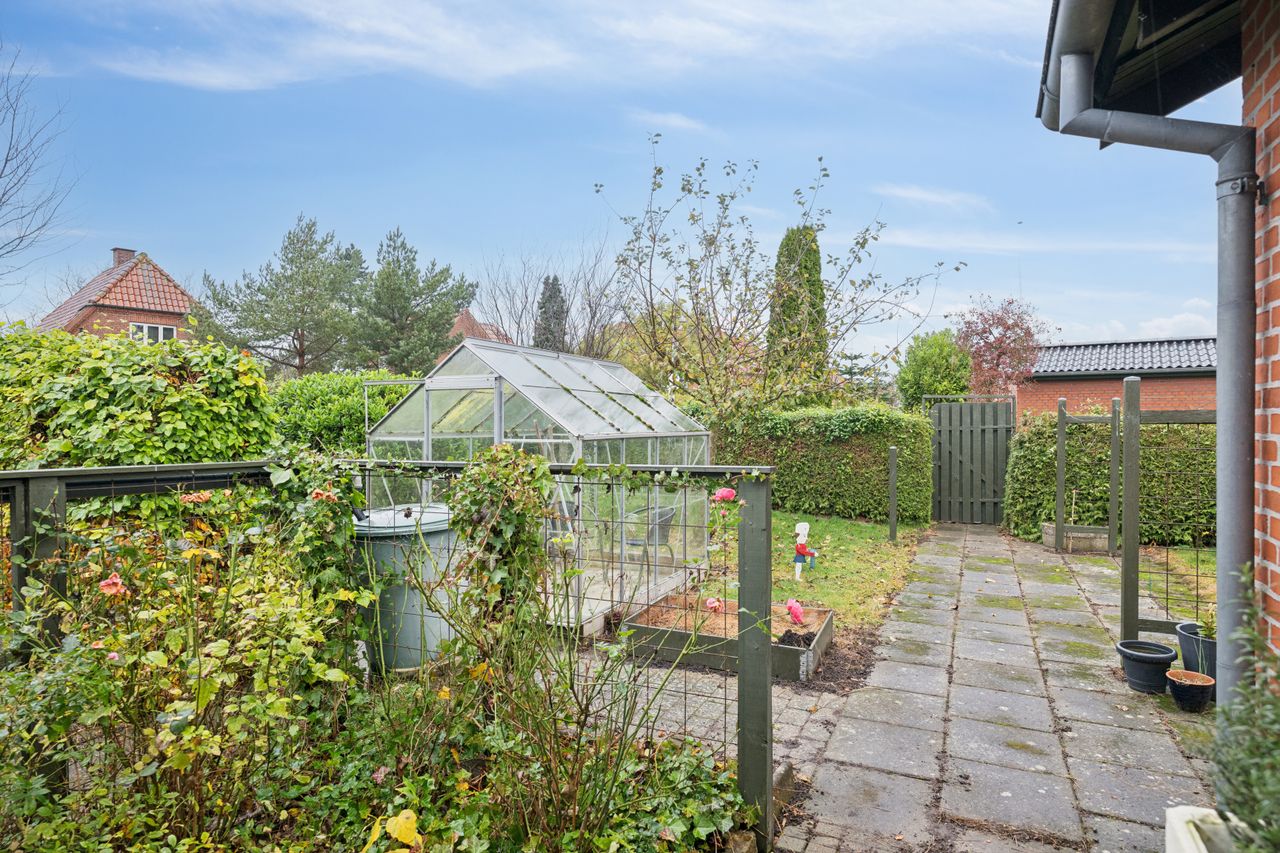 En dejlig udestue binder ude og inde sammen. Uderummet er nemt at vedligeholde og giver gode muligheder for udendørs hygge. Her er både et fint drivhus og flere hyggekroge. Den lukkede have giver både privatliv og en god ramme for afslapning og leg. Desuden en stor carport og udhus.