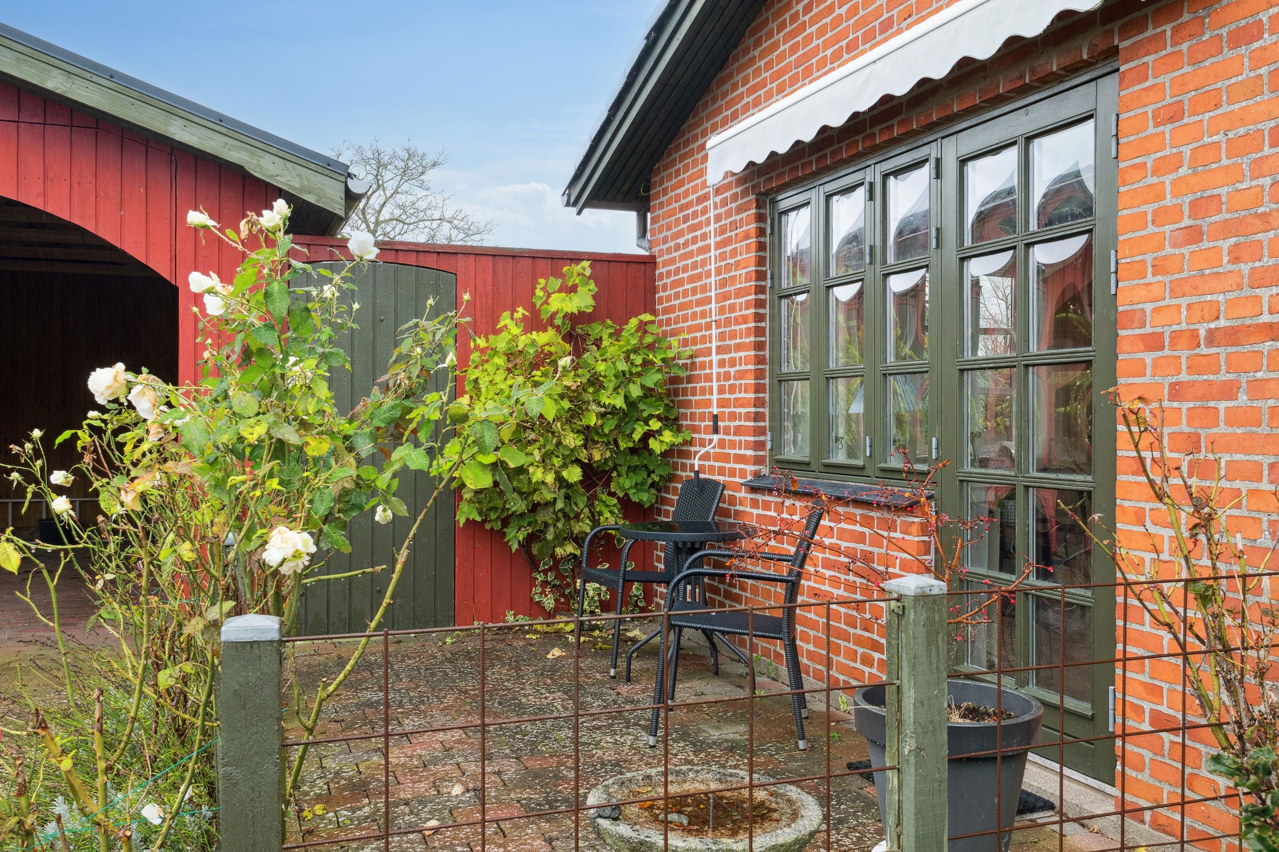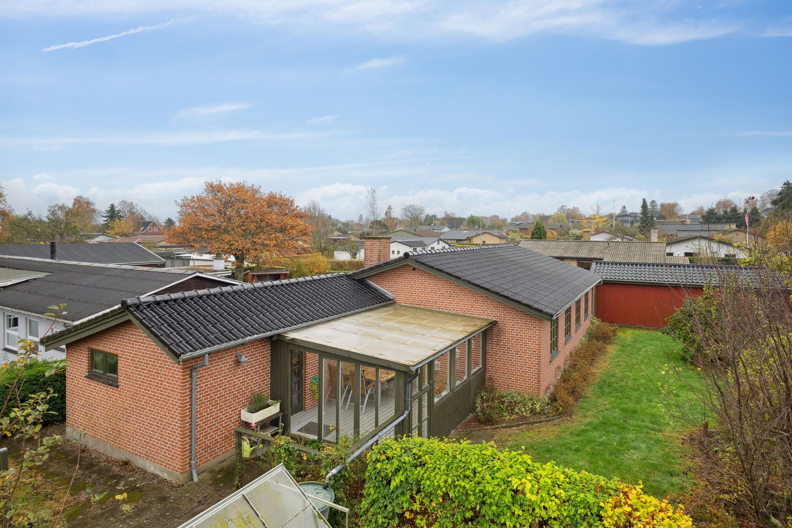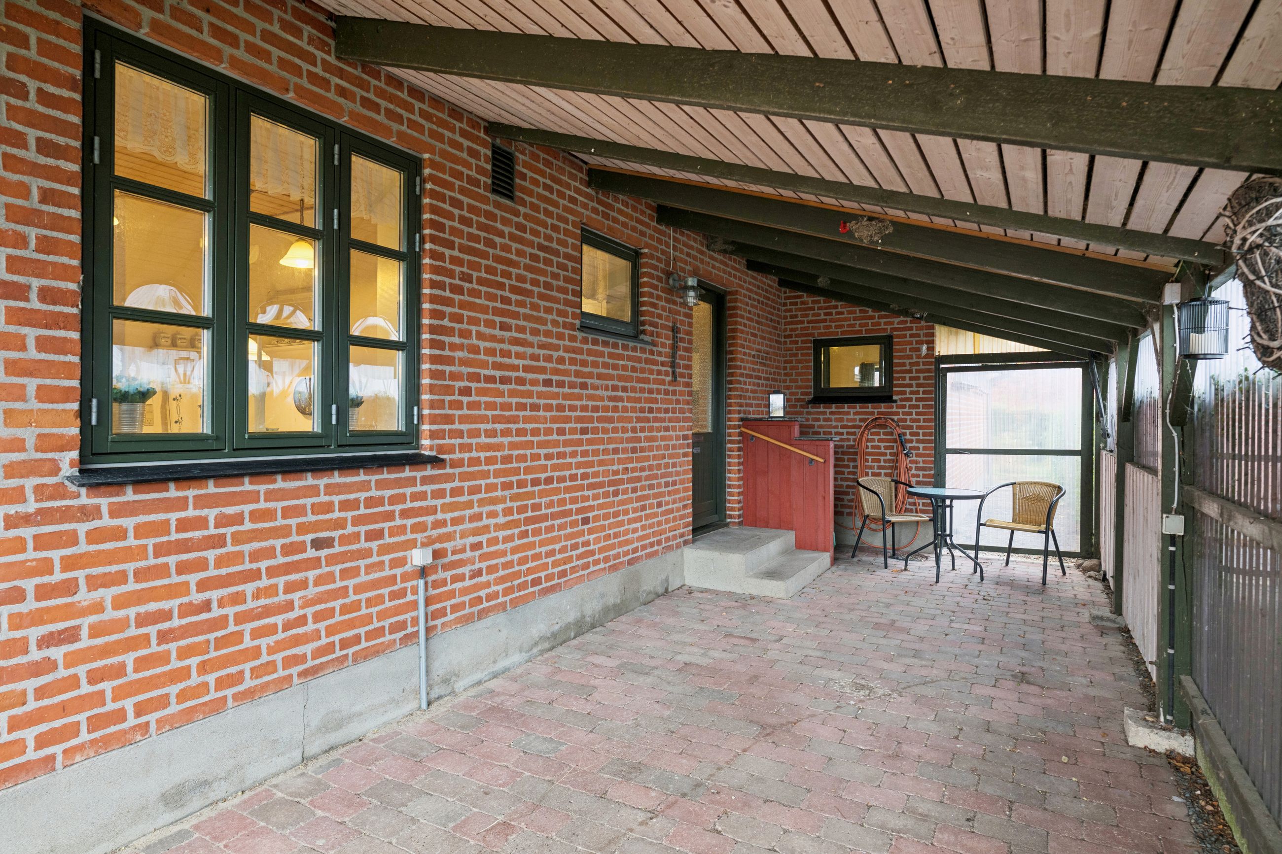 En dejlig udestue binder ude og inde sammen. Uderummet er nemt at vedligeholde og giver gode muligheder for udendørs hygge. Her er både et fint drivhus og flere hyggekroge. Den lukkede have giver både privatliv og en god ramme for afslapning og leg. Desuden en stor carport og udhus.