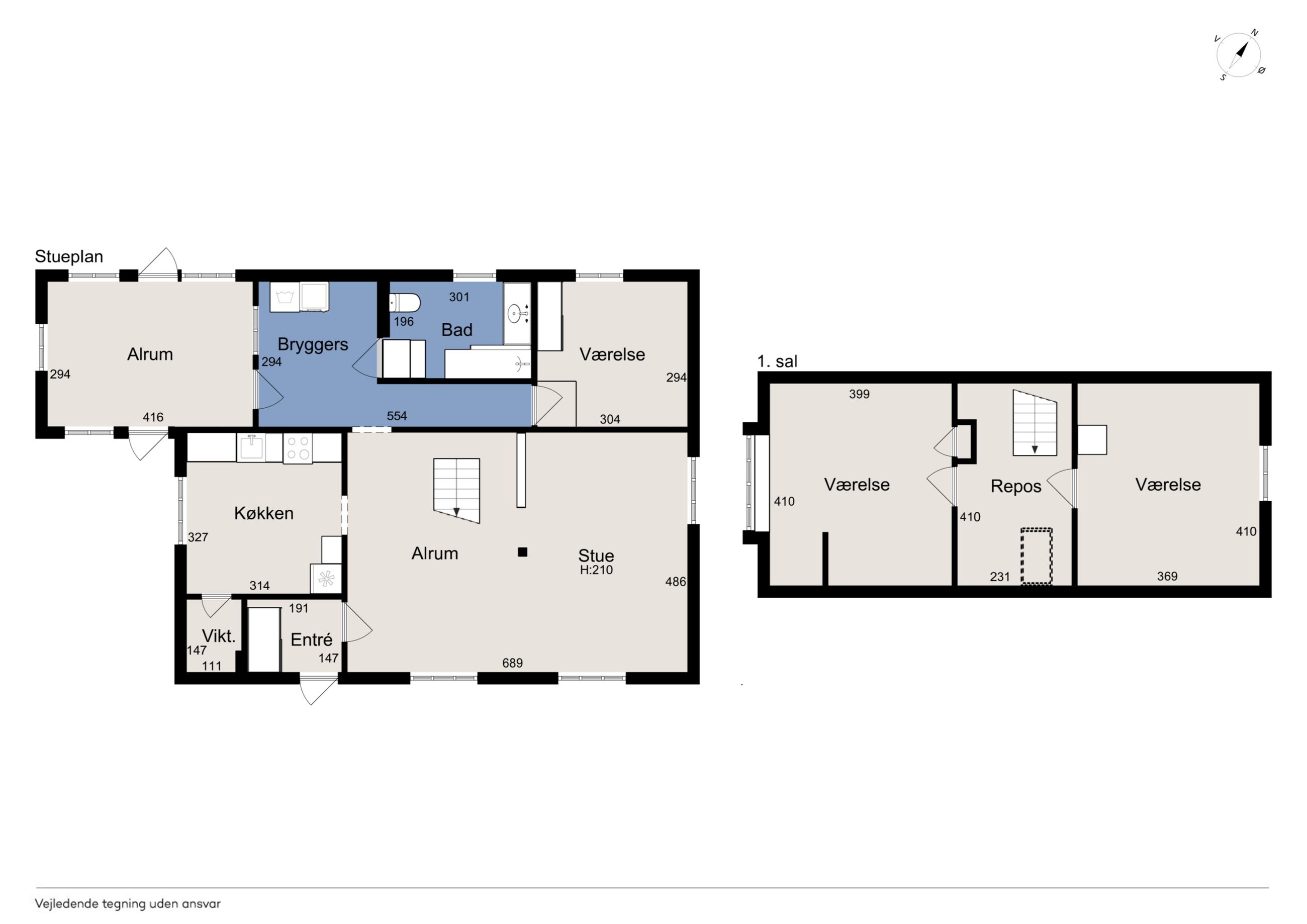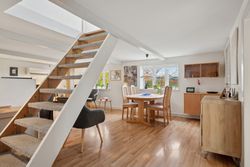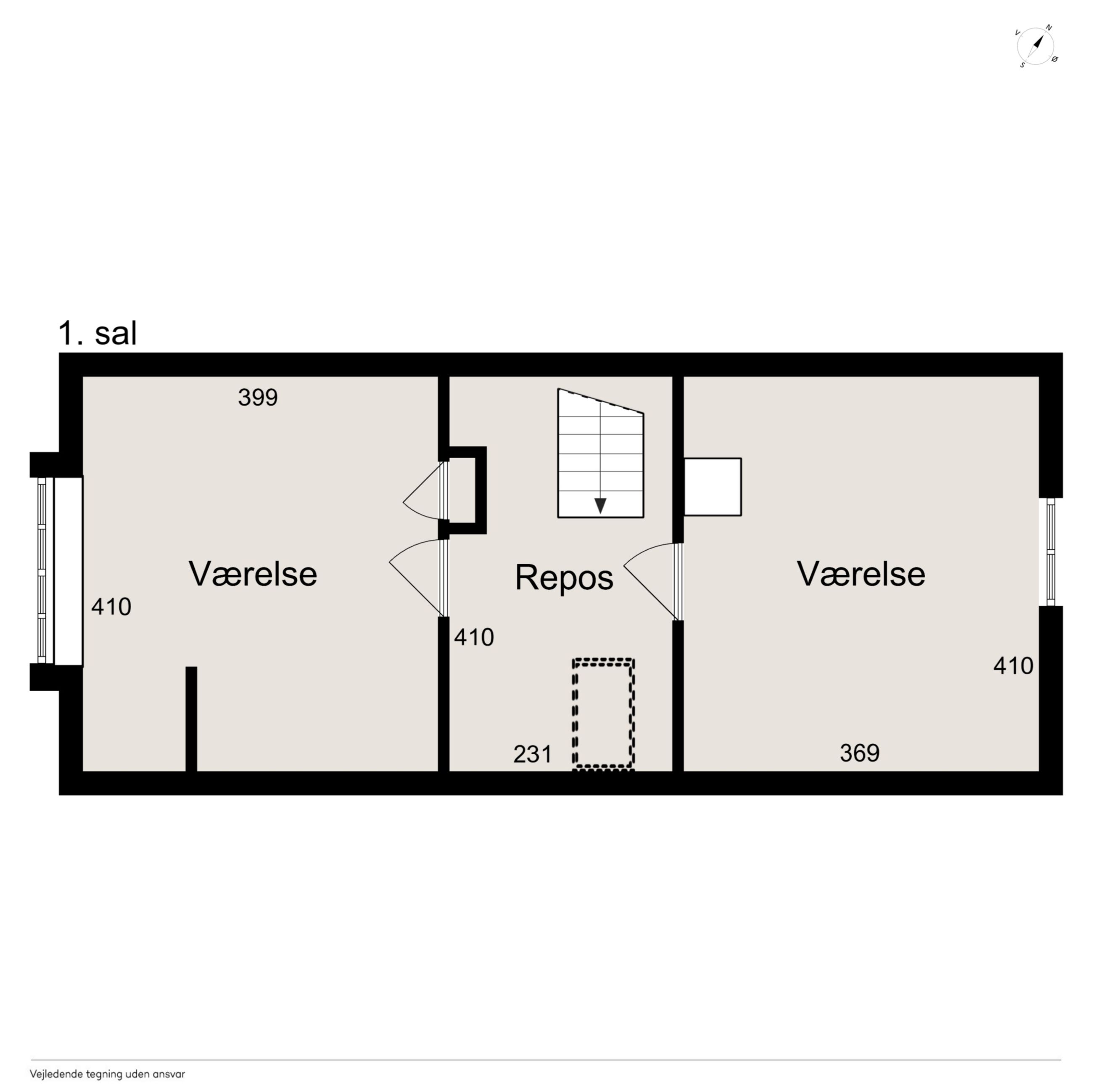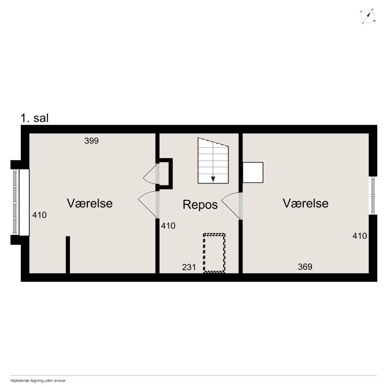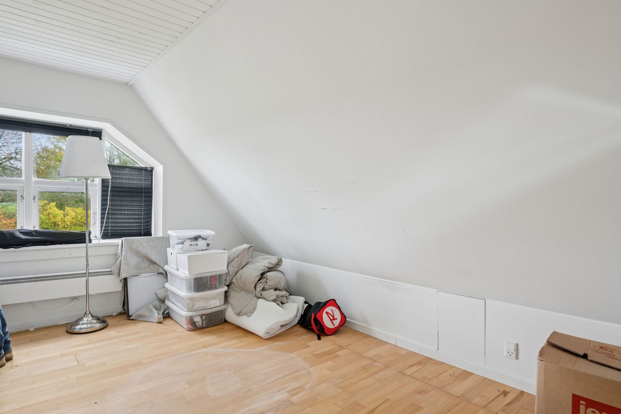 Fra stuen fører en trappe til første sal, hvor der findes et repos og to regulære, indbydende værelser med fint lysindfald.