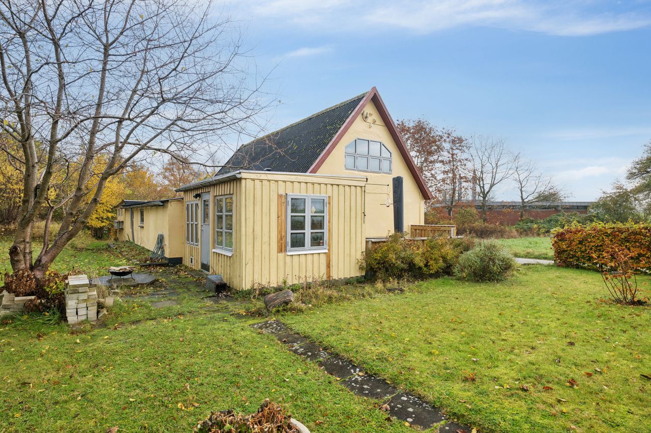 Huset fremstår med sprossevinduer, malede facader og eternittag – en klassisk og velholdt ejendom med masser af atmosfære.