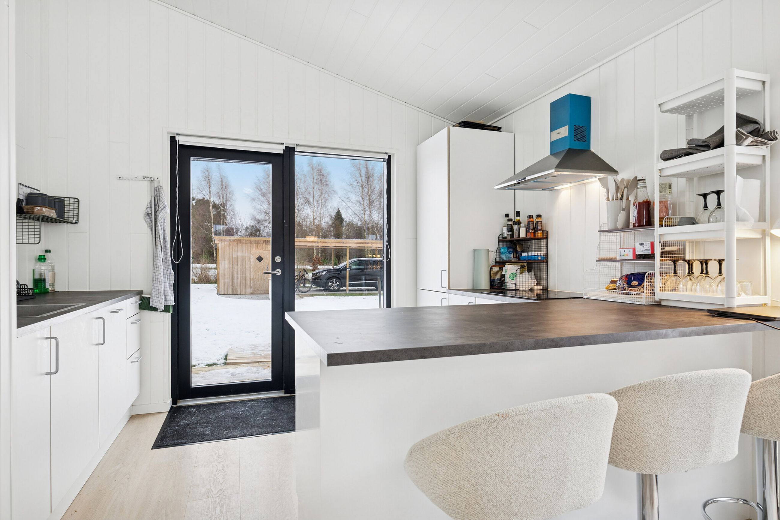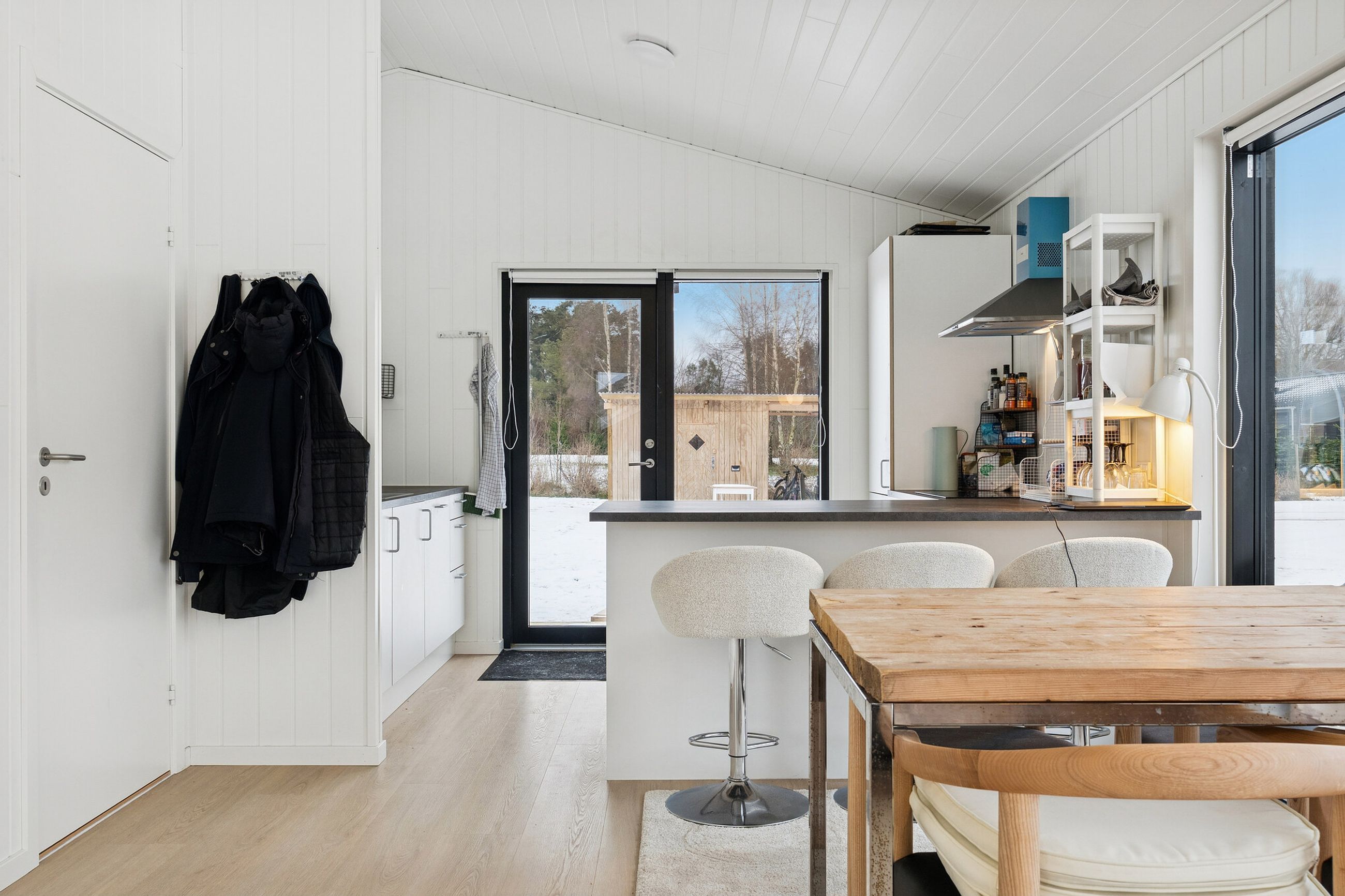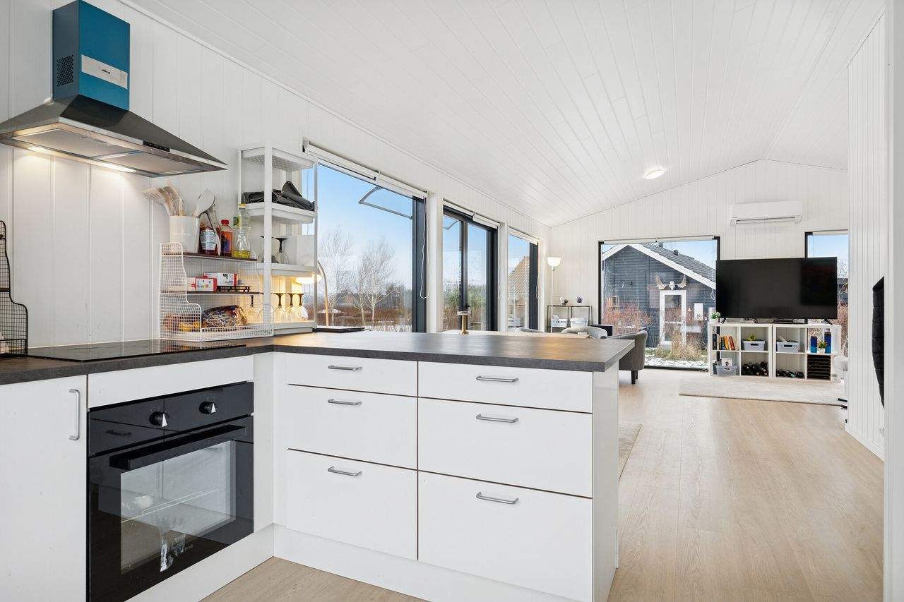 Huset på 60 m2 fremstår lyst og indbydende med store vinduespartier, der skaber et smukt lysindfald og giver kig til vandet i horisonten. Køkken og stue er samlet i et elegant og moderne køkken-alrum med pæne trægulve og et stilrent køkken med hvide elementer.