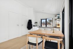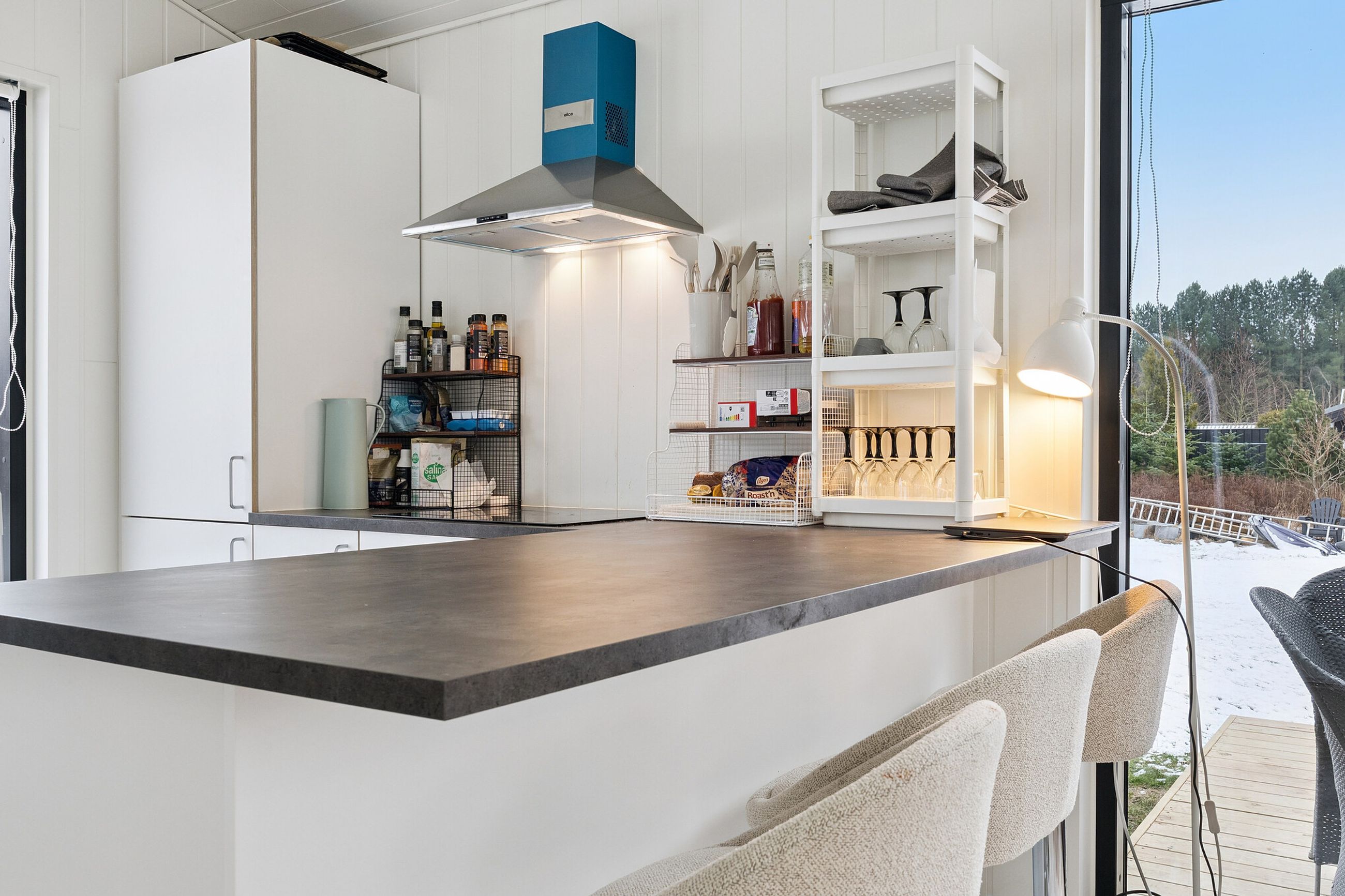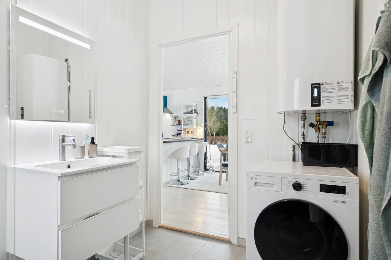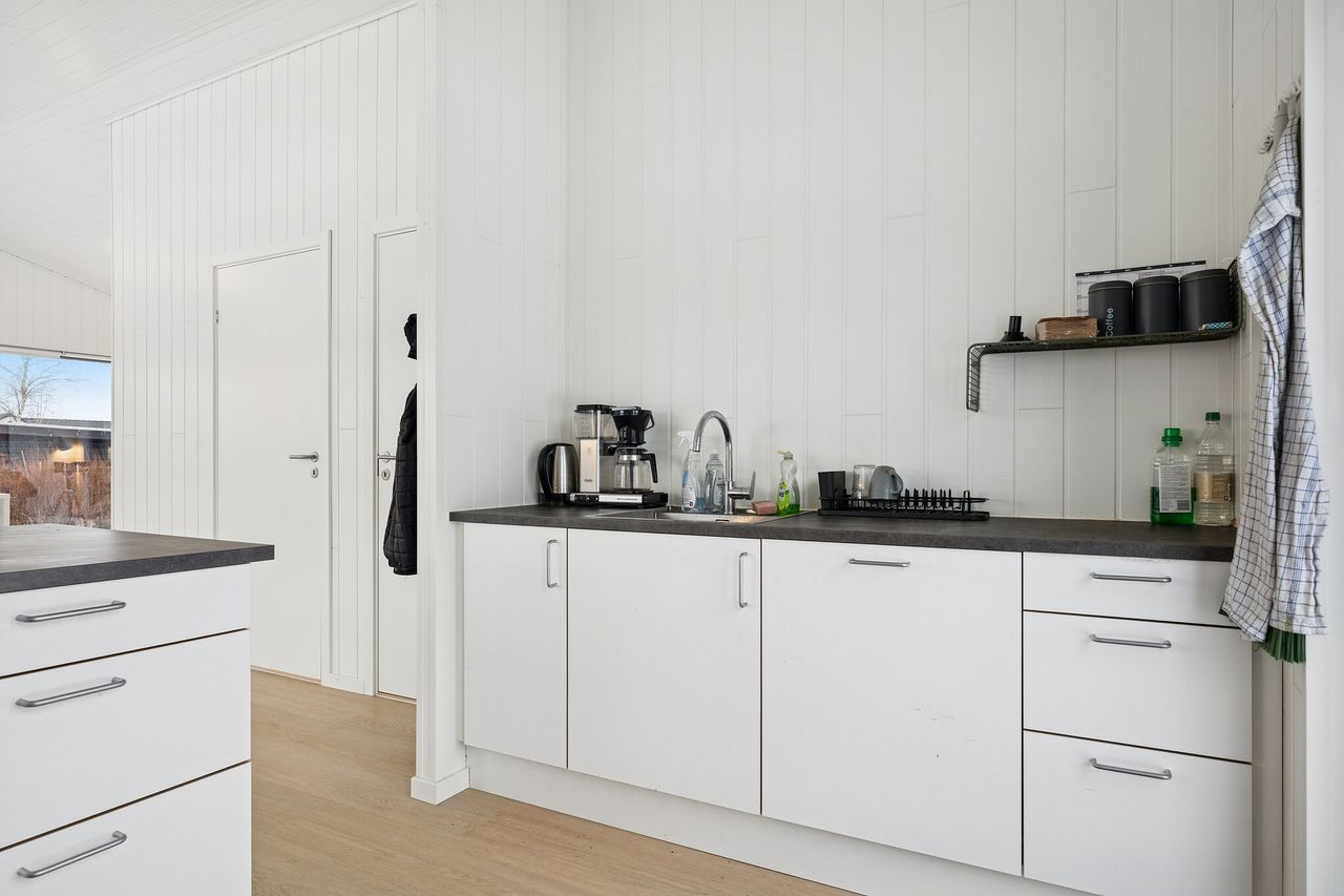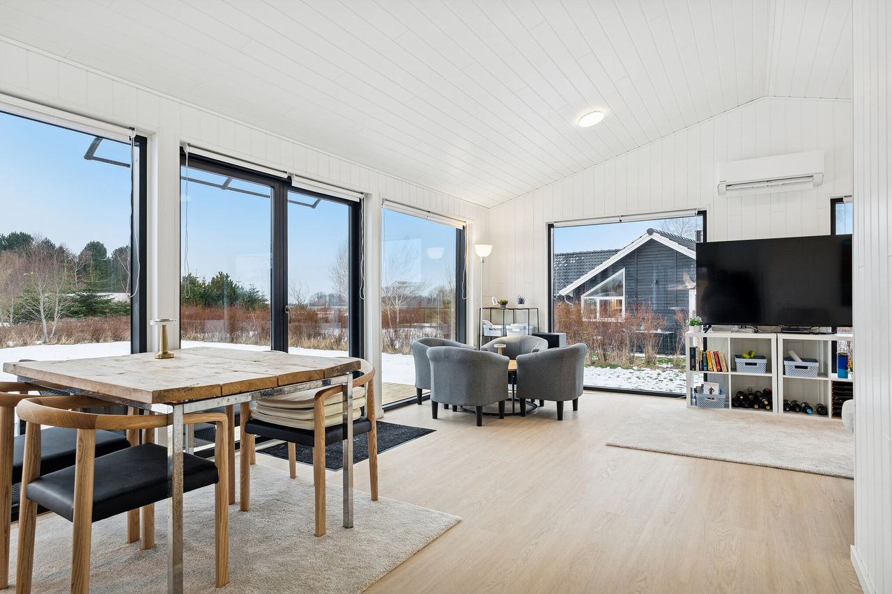Huset på 60 m2 fremstår lyst og indbydende med store vinduespartier, der skaber et smukt lysindfald og giver kig til vandet i horisonten. Køkken og stue er samlet i et elegant og moderne køkken-alrum med pæne trægulve og et stilrent køkken med hvide elementer.