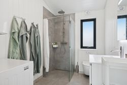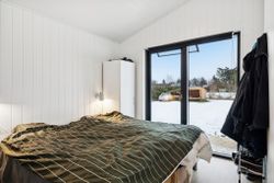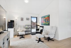 Fra stuen er der direkte udgang til en sydvestvendt terrasse, hvor solen og udsigten kan nydes i rolige omgivelser. Badeværelset er moderne indrettet med gulvvarme og stor bruseniche, og soveværelset er rummeligt med udgang til en østvendt træterrasse – ideel til morgenstunden.