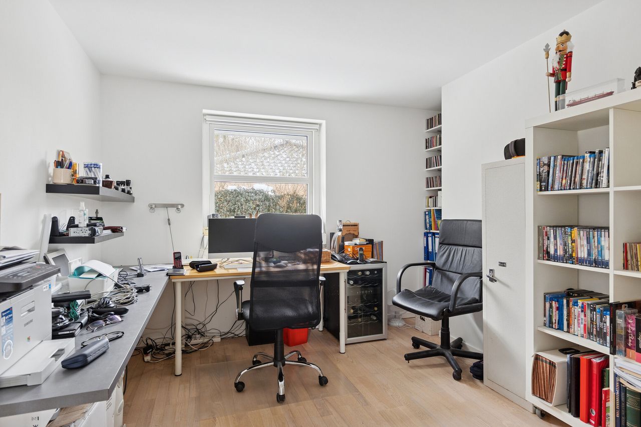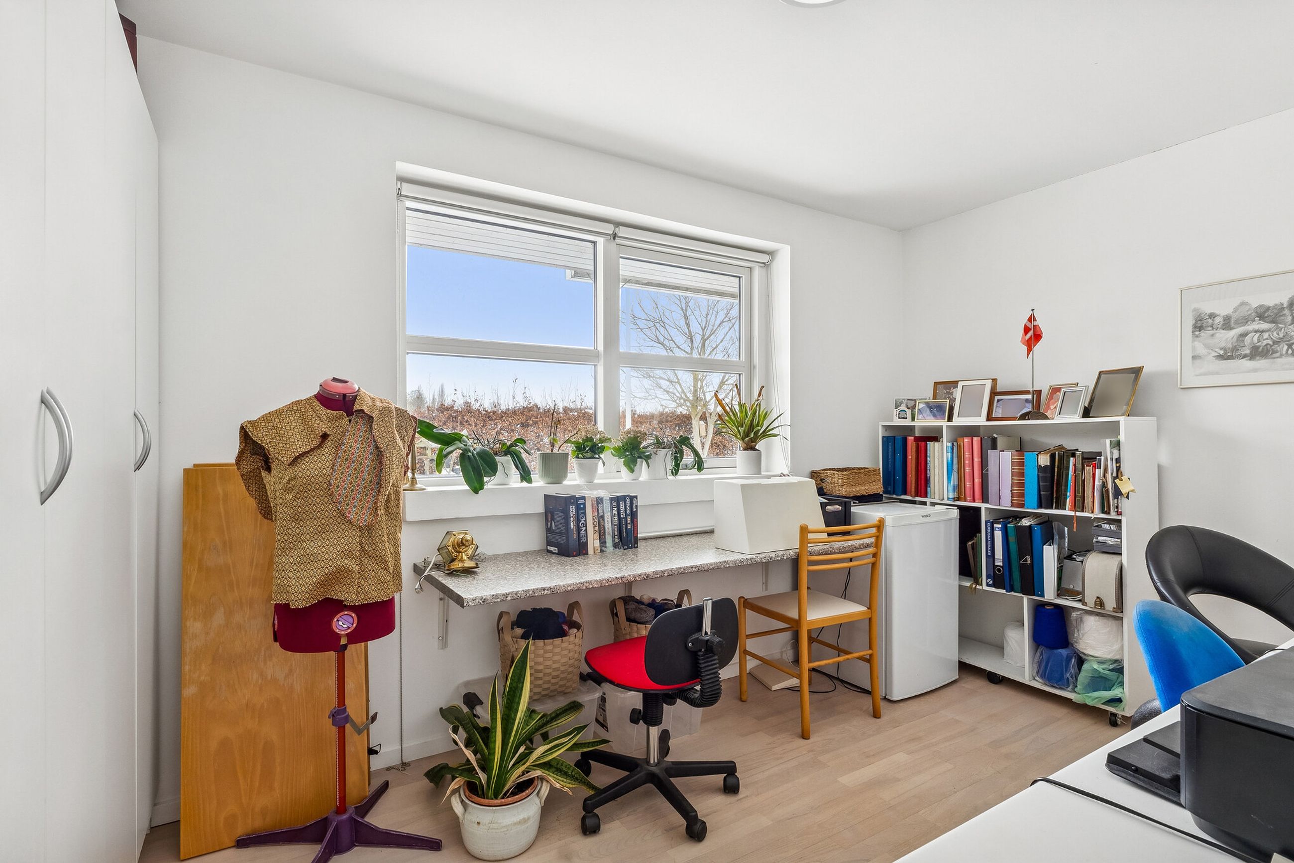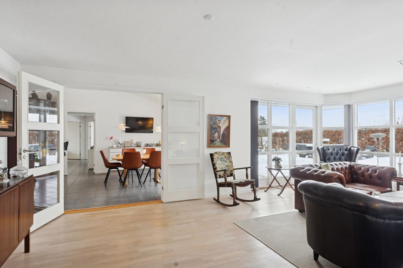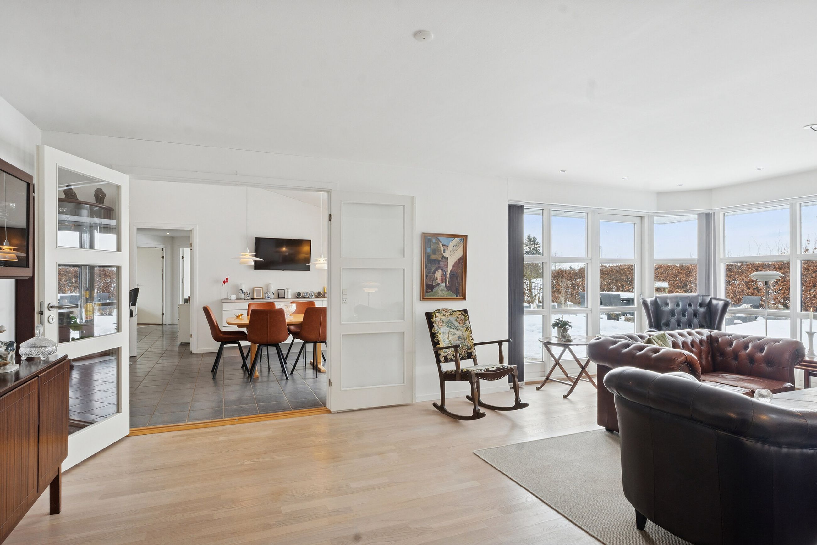 Den tilstødende opholdsstue byder på et skønt lysindfald og udsigt til haven og det omkringliggende område. Fra opholdsstuen er der adgang til kontor/værelse, hvilket giver fleksible indretningsmuligheder – perfekt til hjemmearbejdsplads, hobbyrum eller ekstra soveværelse.