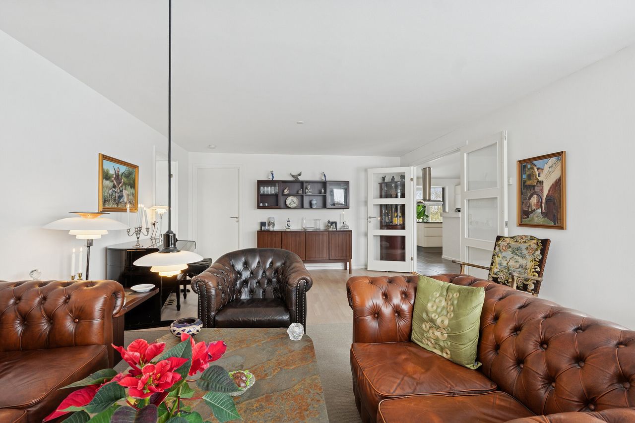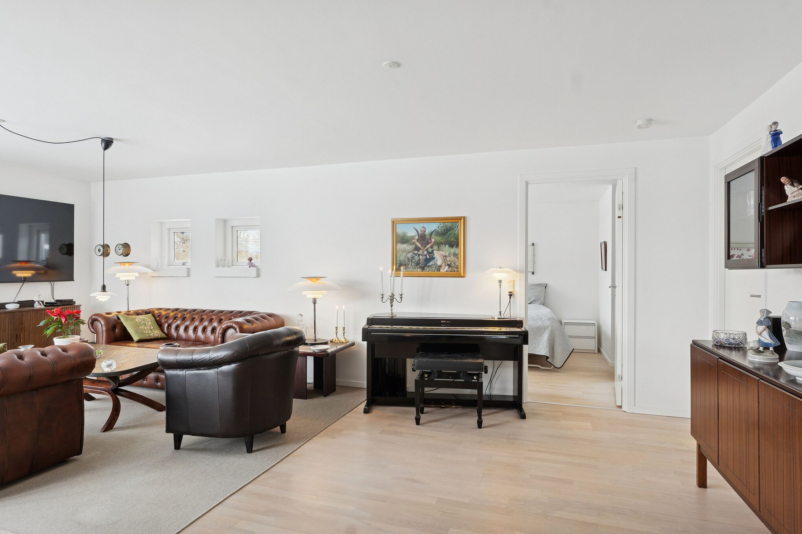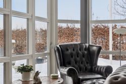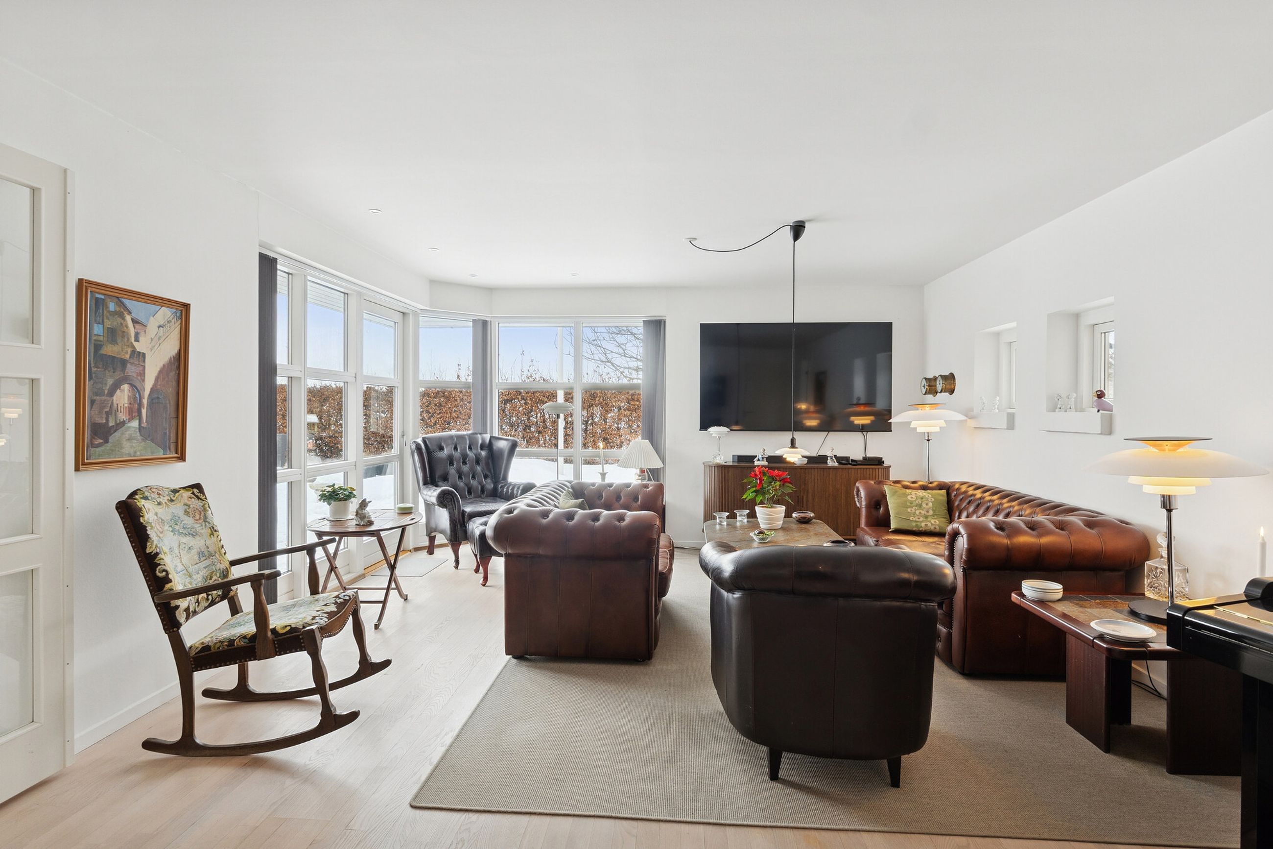 Den tilstødende opholdsstue byder på et skønt lysindfald og udsigt til haven og det omkringliggende område. Fra opholdsstuen er der adgang til kontor/værelse, hvilket giver fleksible indretningsmuligheder – perfekt til hjemmearbejdsplads, hobbyrum eller ekstra soveværelse.