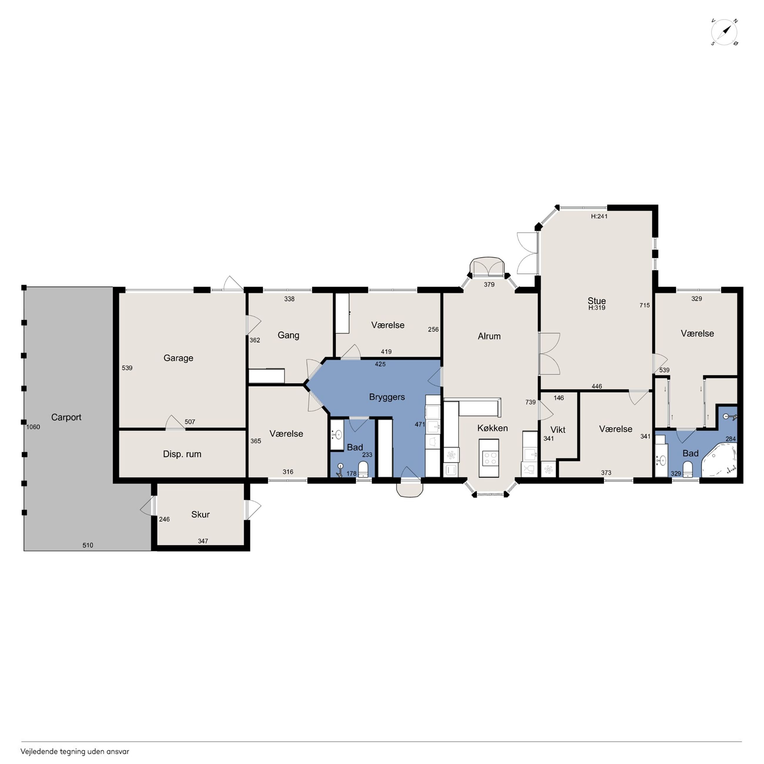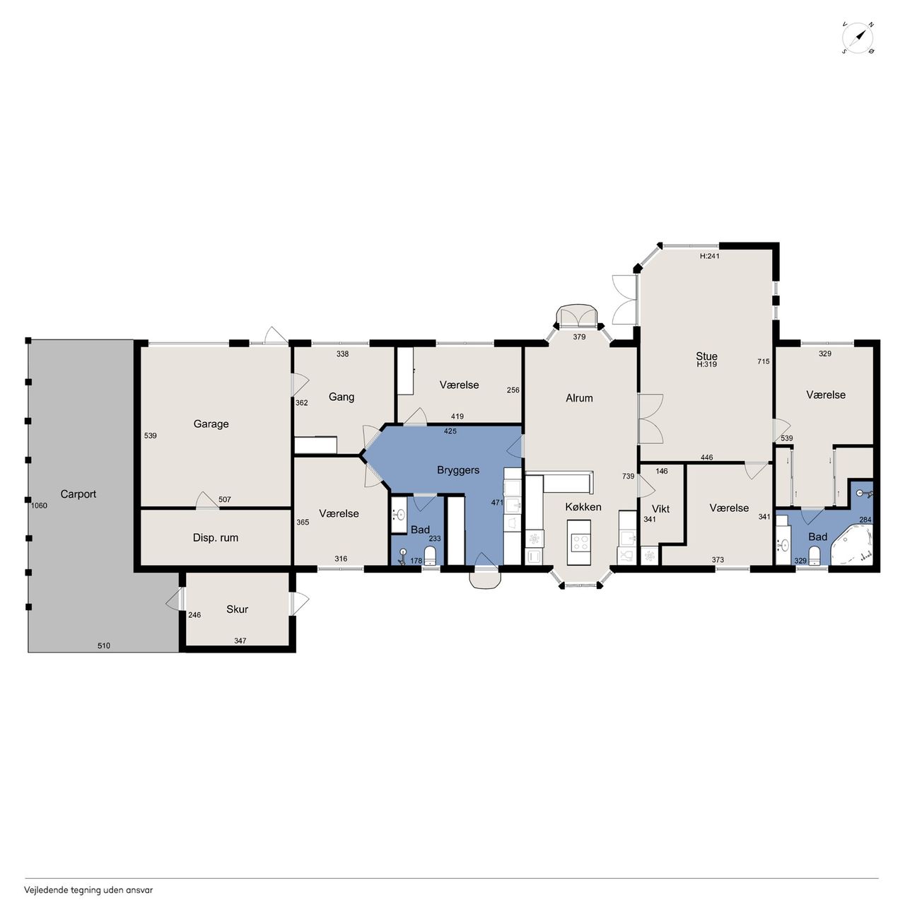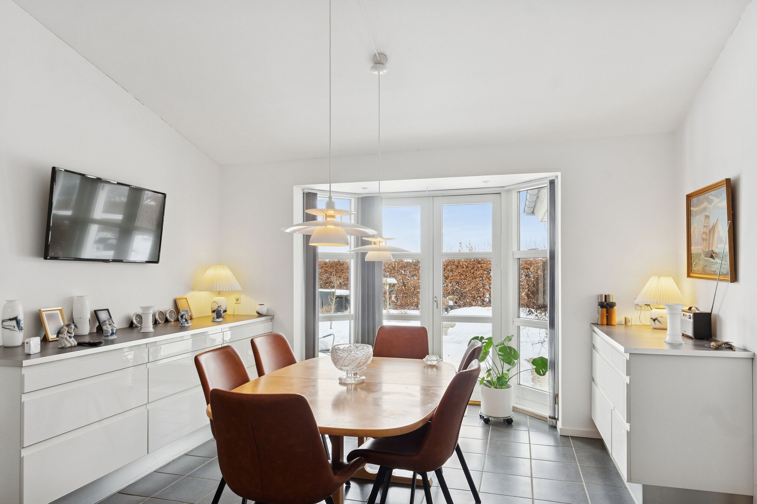 Den integrerede garage giver fine muligheder for hobbyprojekter eller værksted, og den ekstra carport giver plads til endnu en bil eller båd.
