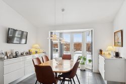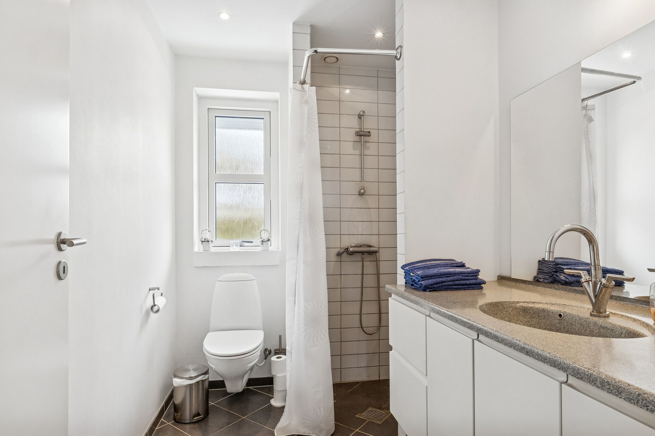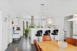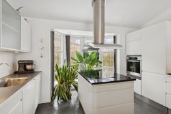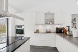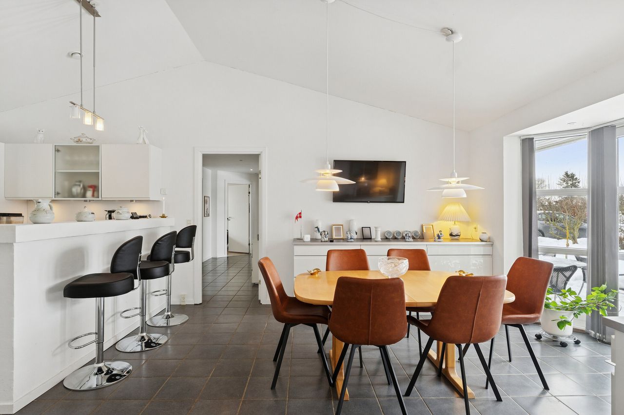 Husets naturlige samlingspunkt er det store, imponerende køkken-alrum med loft til kip og en indbydende samtaleø, hvor familie og gæster kan samles. Køkkenet rummer desuden et praktisk depotrum – ideelt til opbevaring af husholdningsmaskiner og ekstra fornødenheder. Her er god plads til både spiseafdeling og hyggelige stunder.