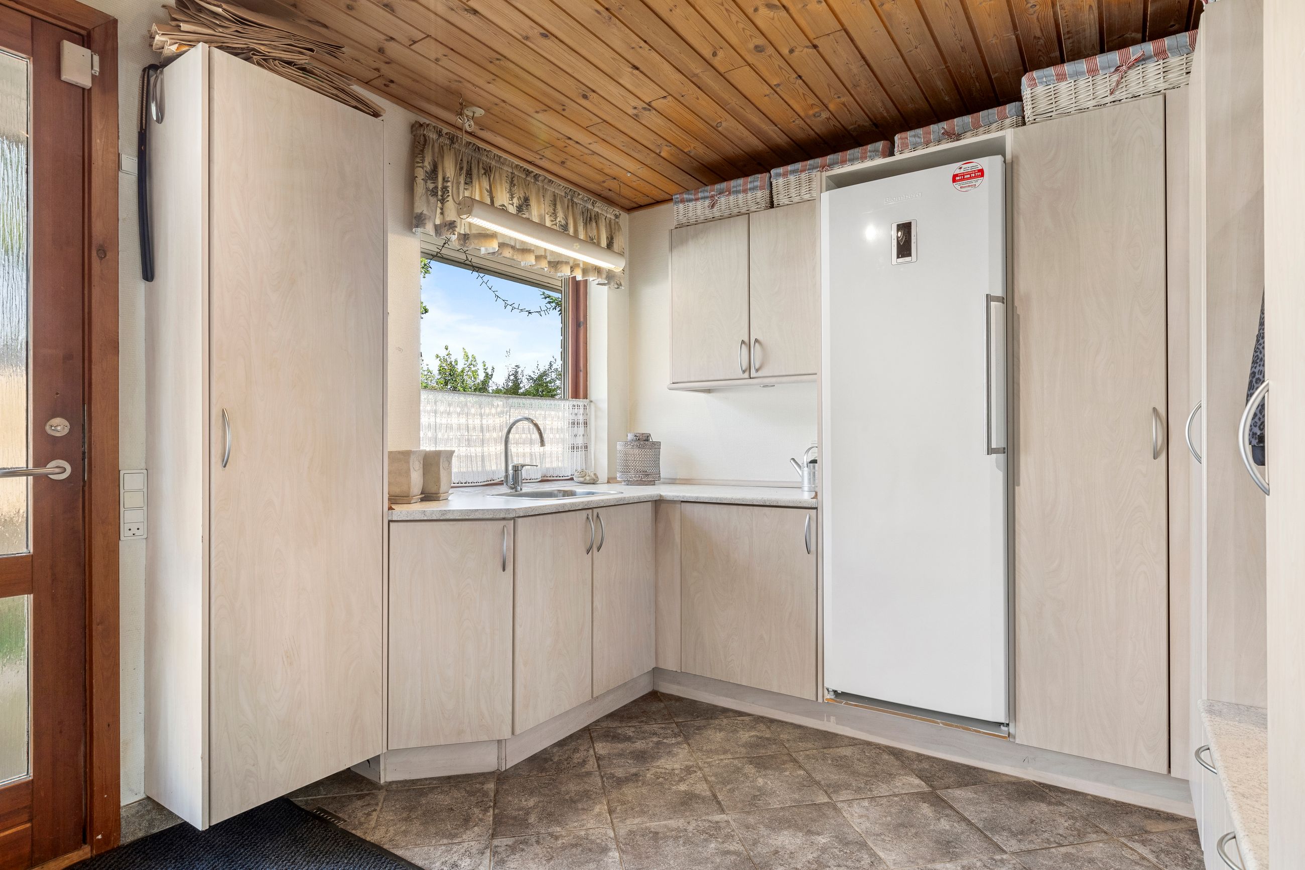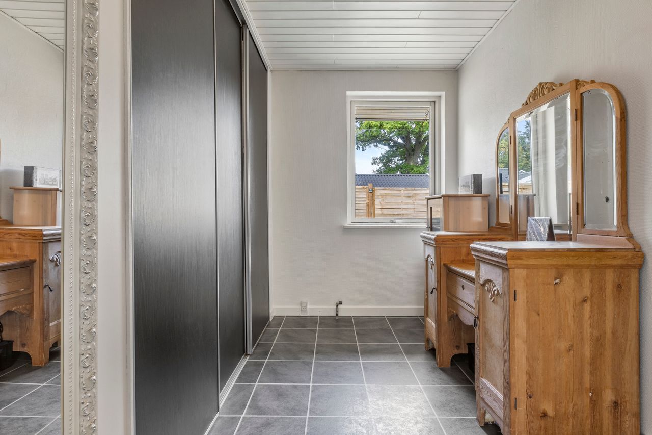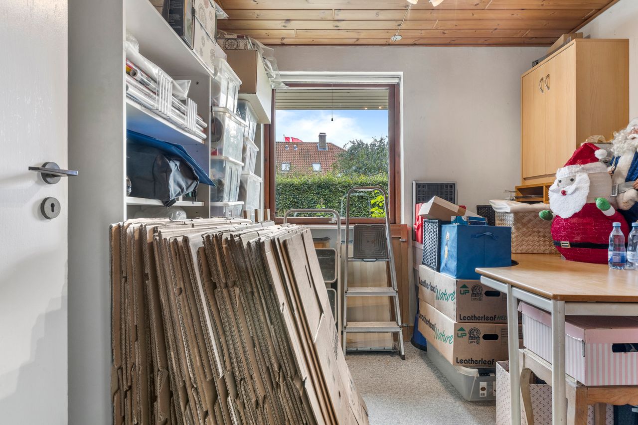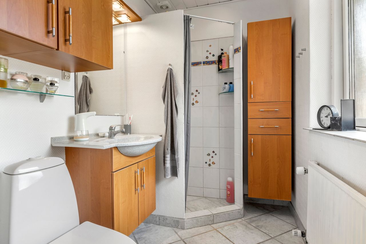 Stort bryggers/fyrrum med indgang, håndvask, masser af skabe og installation til vaskemaskine og tørretumbler, lyst køkken med god spiseplads og udgang til terrasse og haven, 2 værelser, walk-in-closet/gennemgangsrum, badeværelse med bruser, wc, hvidt skabsarrangement med håndvask og gulvvarme, stor vinkel-opholdsstue med pille-brændeovn og udgang til terrasse og haven, soveværelse samt badeværelse med bruser, wc, skabsarrangement med håndvask og gulvvarme.