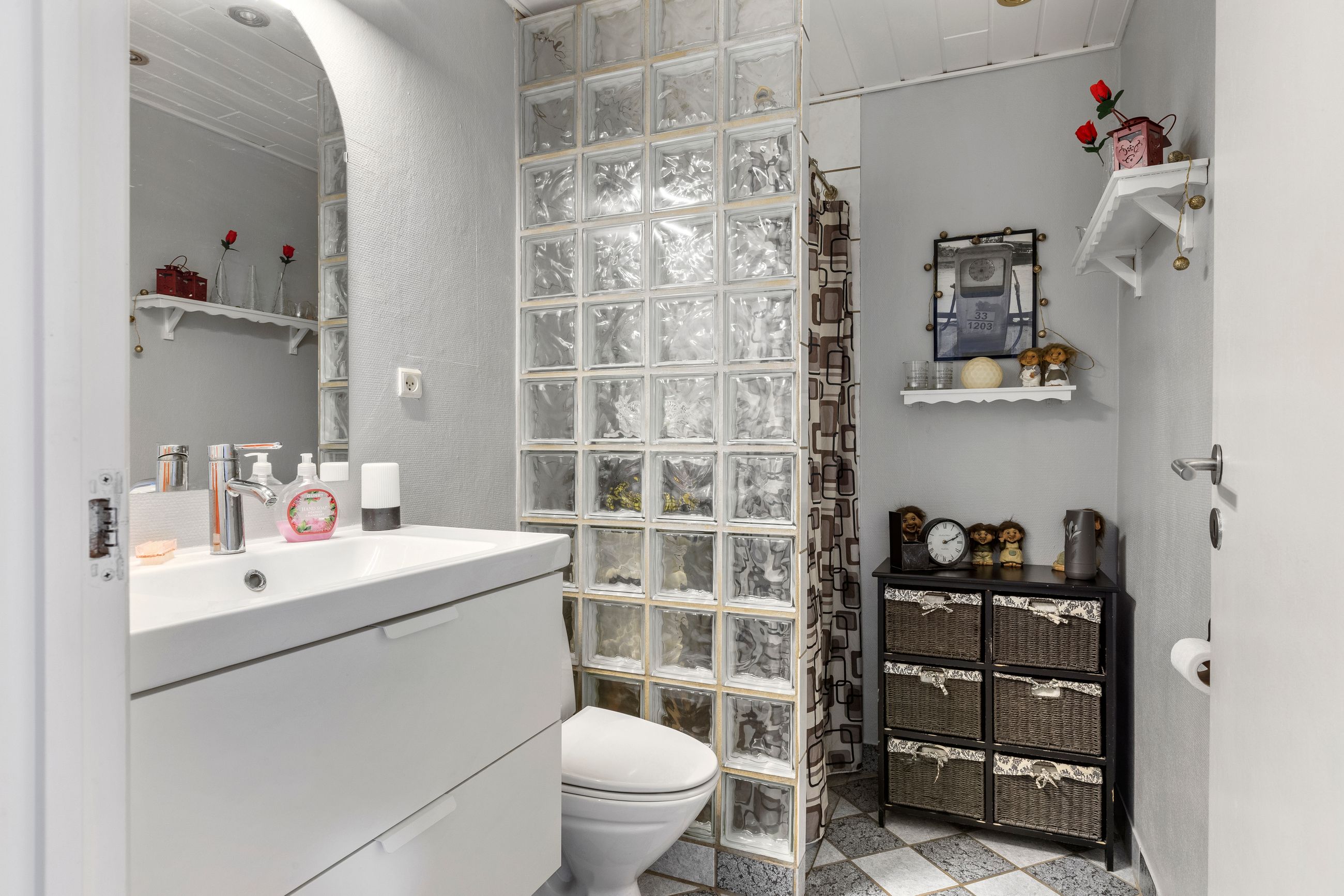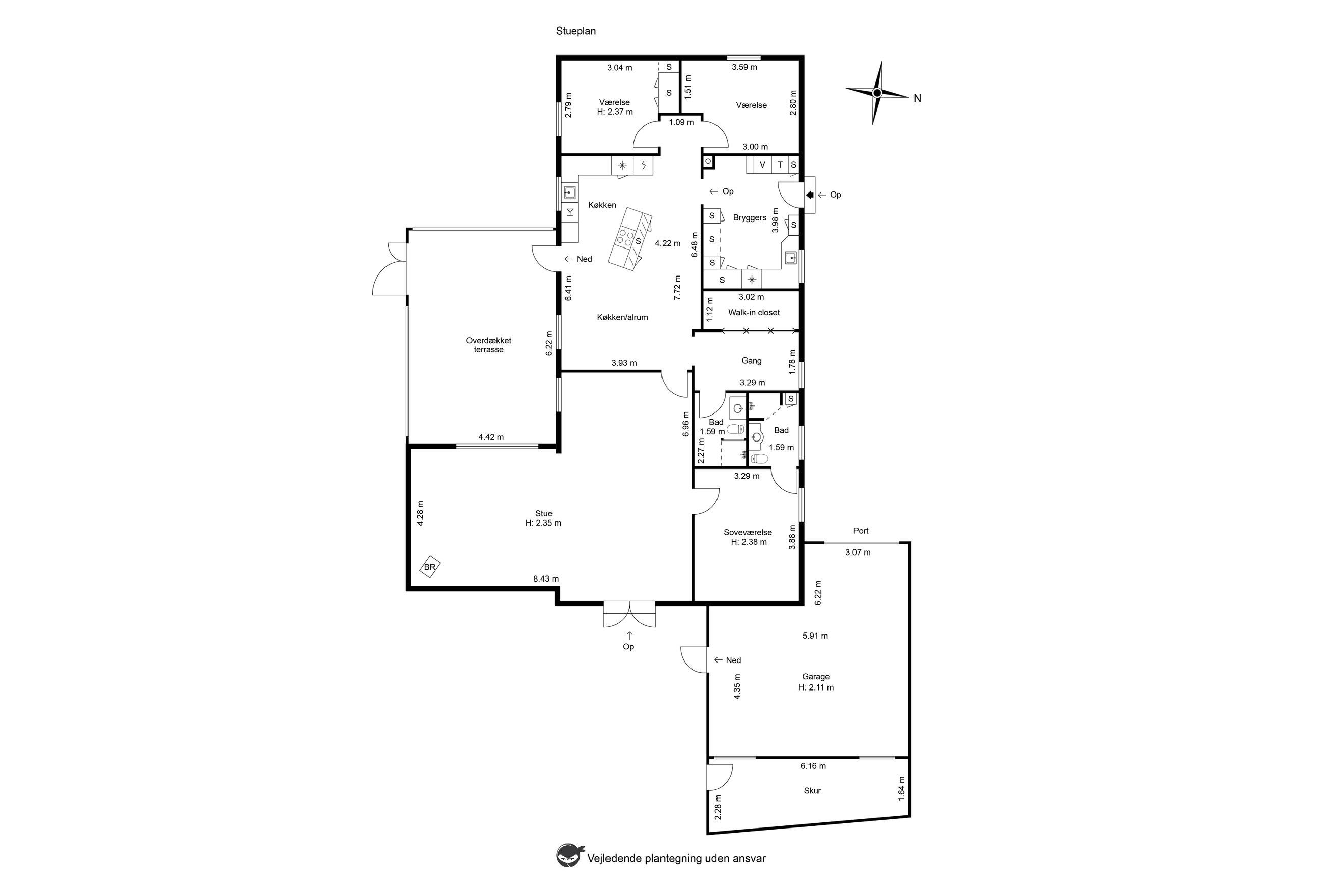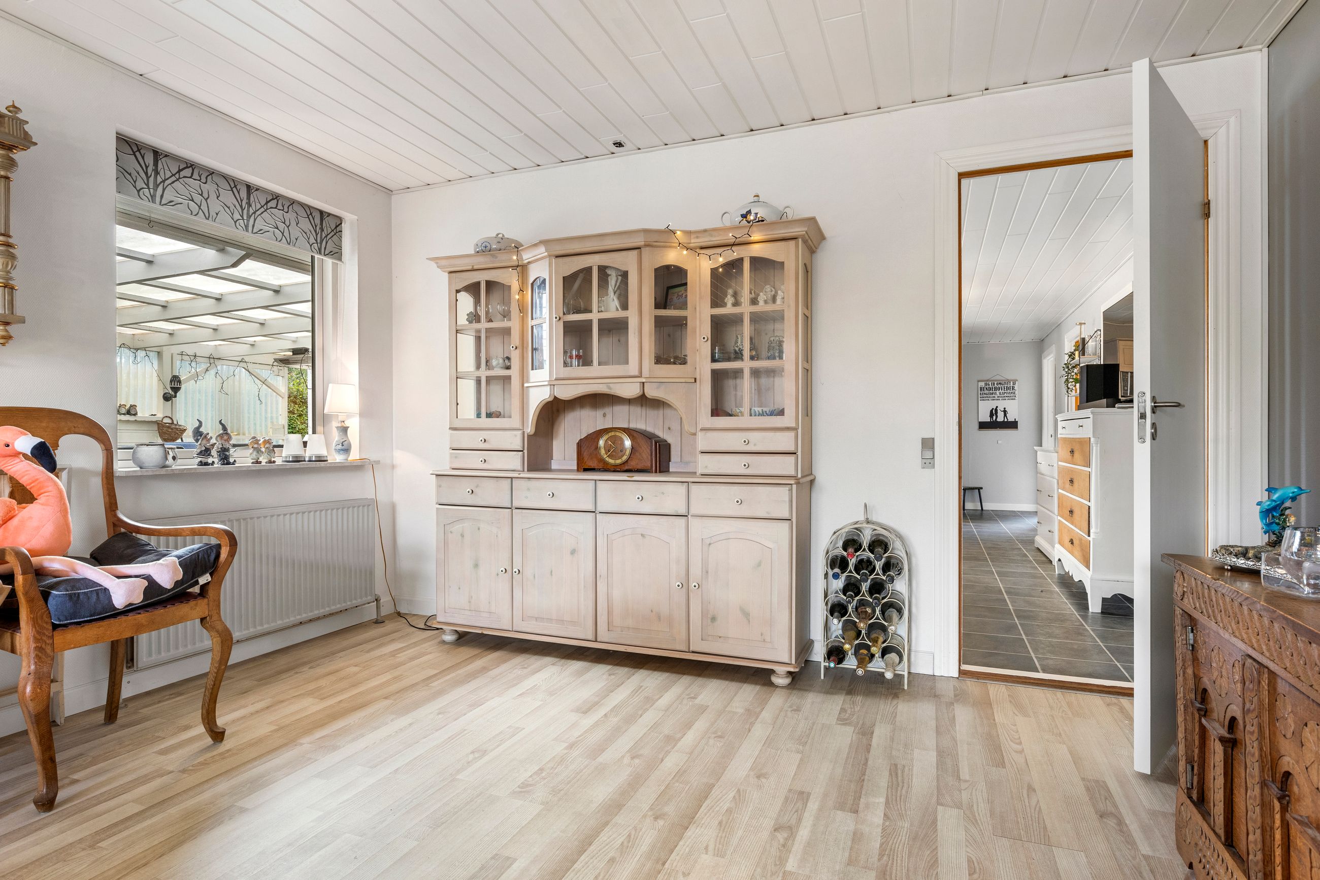 Stort bryggers/fyrrum med indgang, håndvask, masser af skabe og installation til vaskemaskine og tørretumbler, lyst køkken med god spiseplads og udgang til terrasse og haven, 2 værelser, walk-in-closet/gennemgangsrum, badeværelse med bruser, wc, hvidt skabsarrangement med håndvask og gulvvarme, stor vinkel-opholdsstue med pille-brændeovn og udgang til terrasse og haven, soveværelse samt badeværelse med bruser, wc, skabsarrangement med håndvask og gulvvarme.