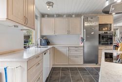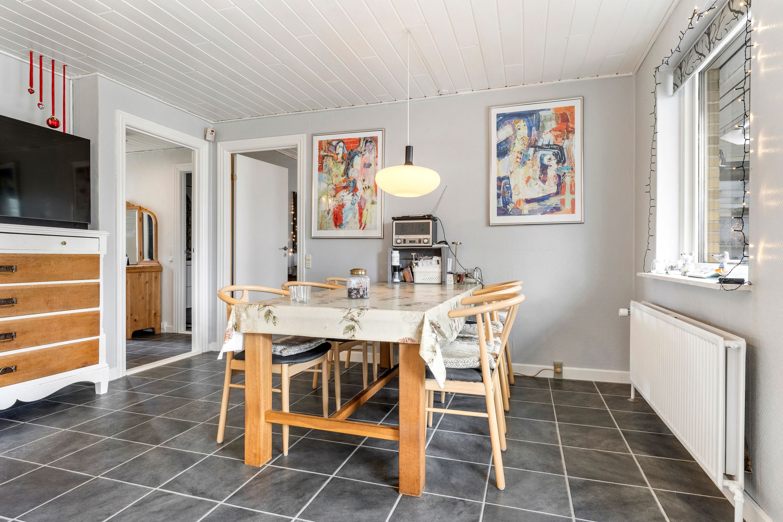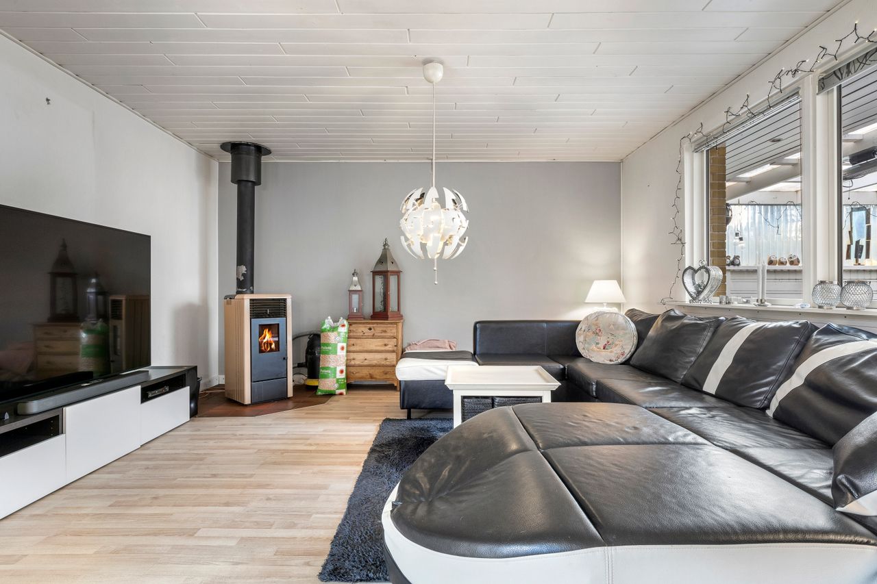 Opvarmes med fjernvarme og pille-brændeovn. 2-lags termovinduer.