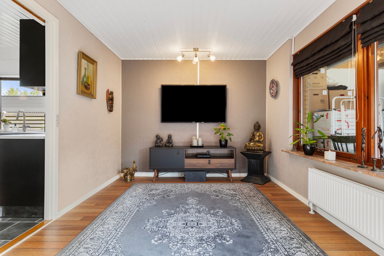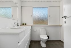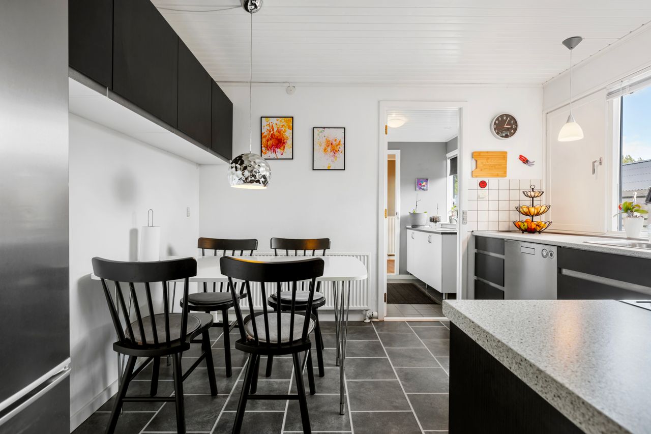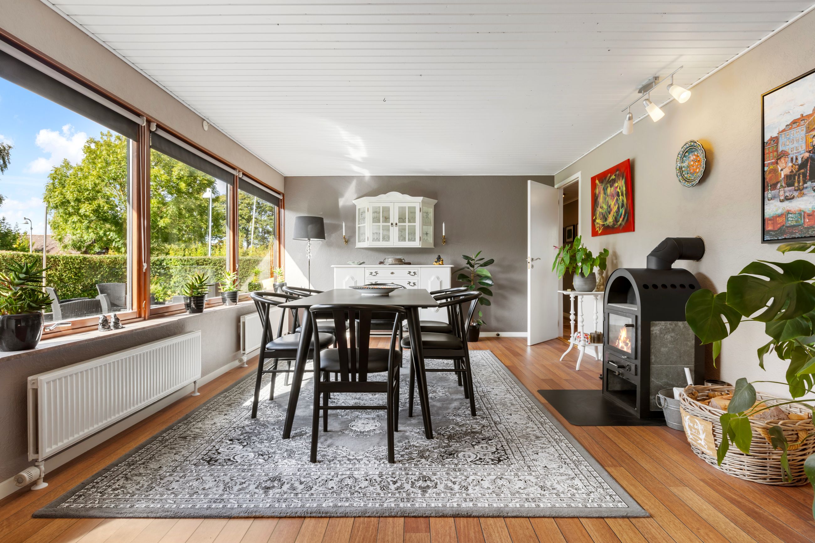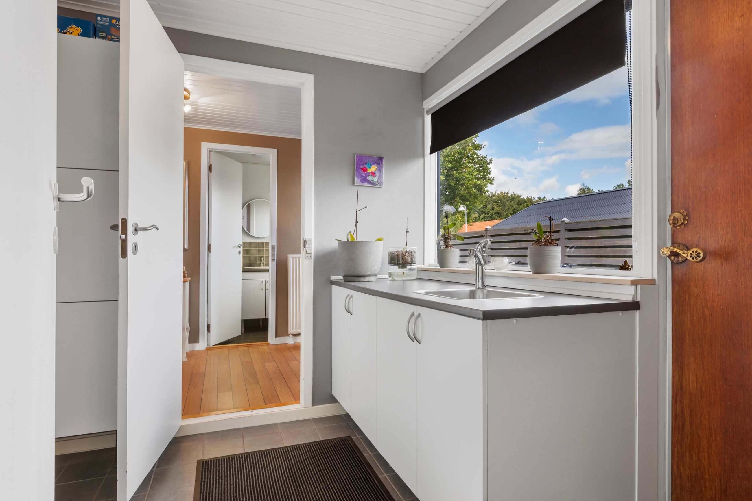 Bryggers/fyrrum med indgang, håndvask og skabe, ca. 9 år gl. sort køkken med god spiseplads, spisestue med udgang til udestue - lys opholdsstue med brændeovn, entre / fordelingsgang, stort værelse med skabe (tidligere 2 værelser), soveværelse med skabe, værelse med skabe, ca. 9 år gl. pænt badeværelse med bruser, wc, hvidt skabsarr. med håndvask og gulvvarme samt pænt toilet med wc, skabsarr. med håndvask, installation til vaskemaskine og tørretumbler samt gulvvarme.
