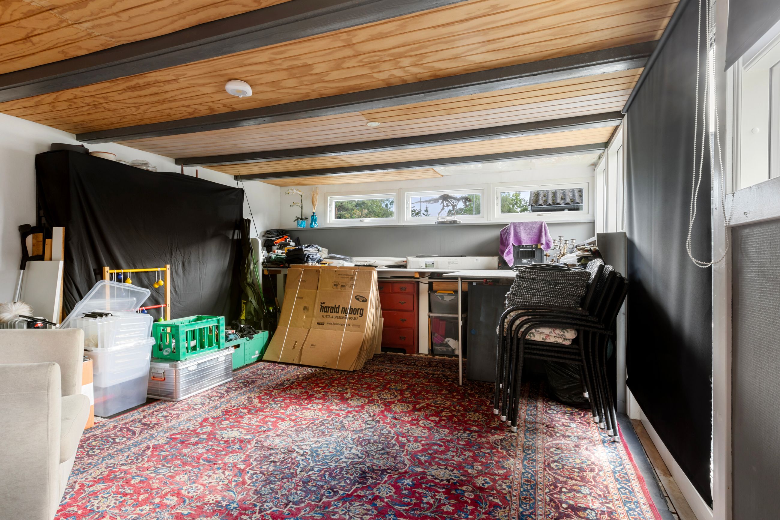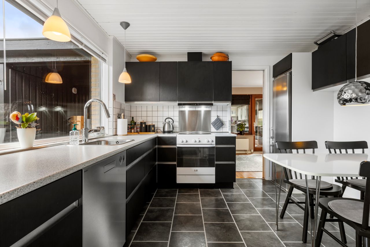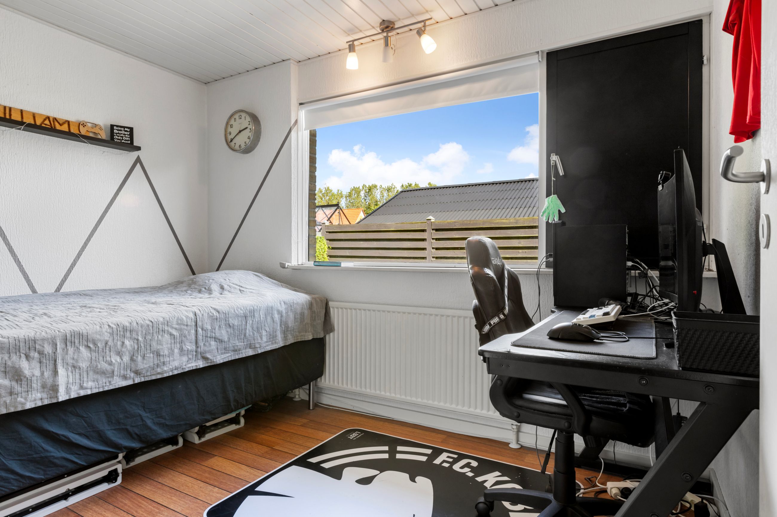 Bryggers/fyrrum med indgang, håndvask og skabe, ca. 9 år gl. sort køkken med god spiseplads, spisestue med udgang til udestue - lys opholdsstue med brændeovn, entre / fordelingsgang, stort værelse med skabe (tidligere 2 værelser), soveværelse med skabe, værelse med skabe, ca. 9 år gl. pænt badeværelse med bruser, wc, hvidt skabsarr. med håndvask og gulvvarme samt pænt toilet med wc, skabsarr. med håndvask, installation til vaskemaskine og tørretumbler samt gulvvarme.