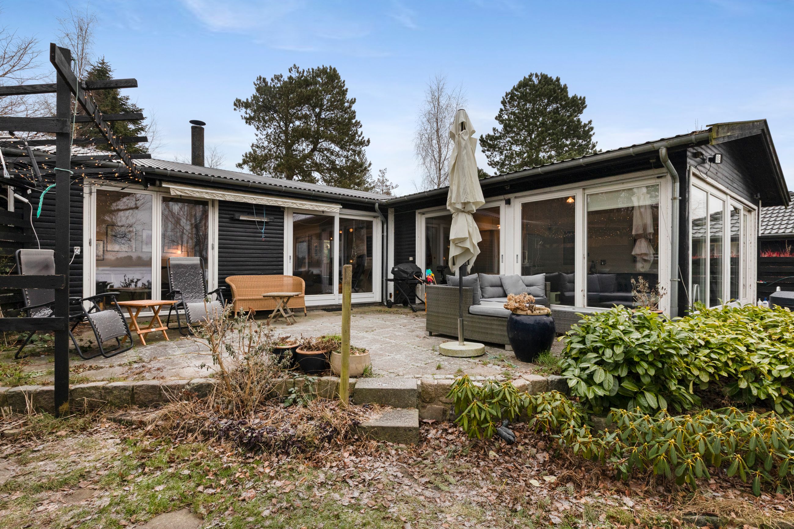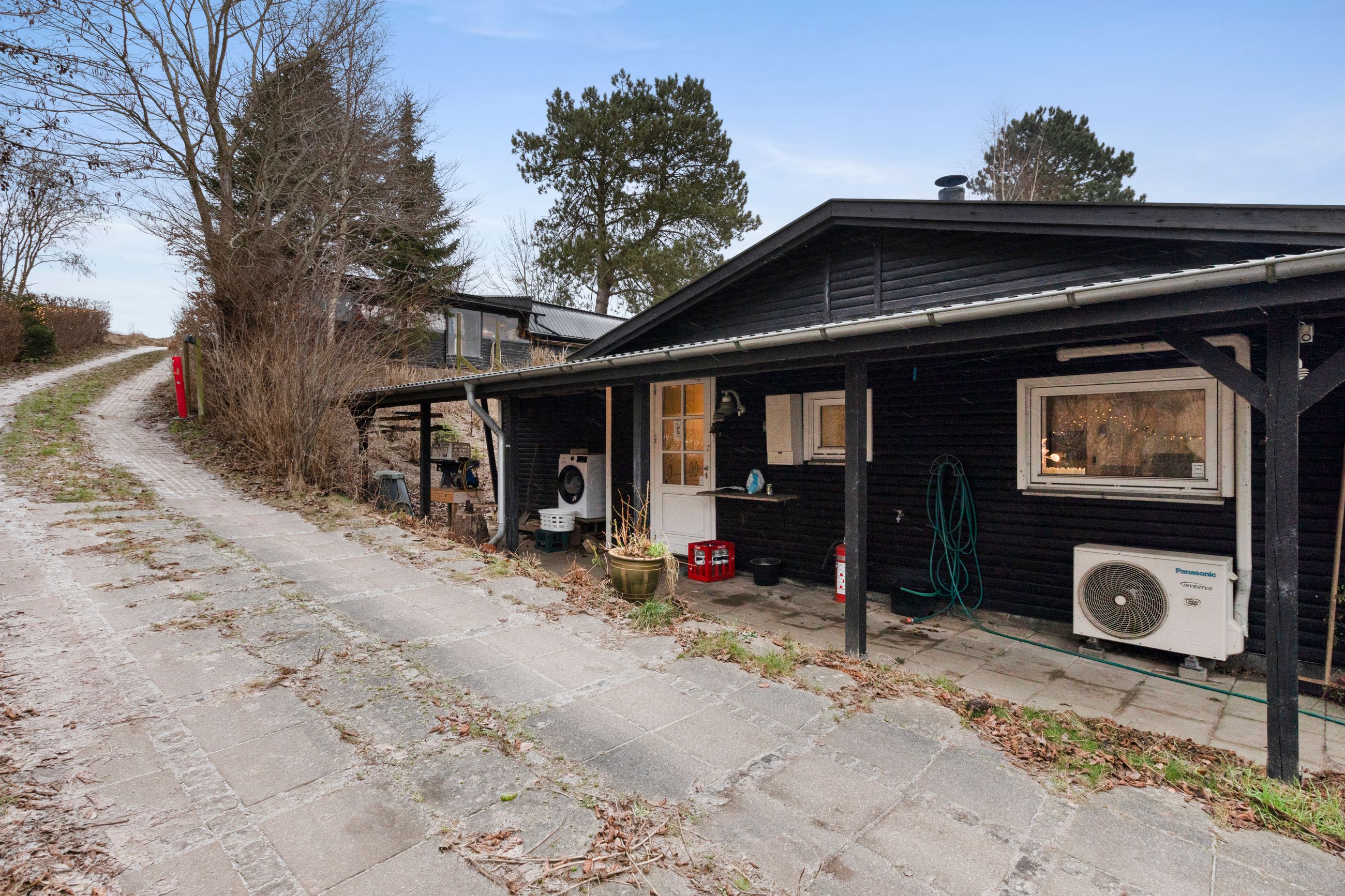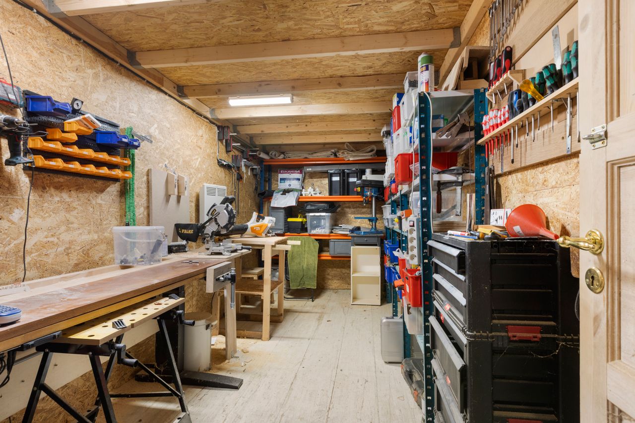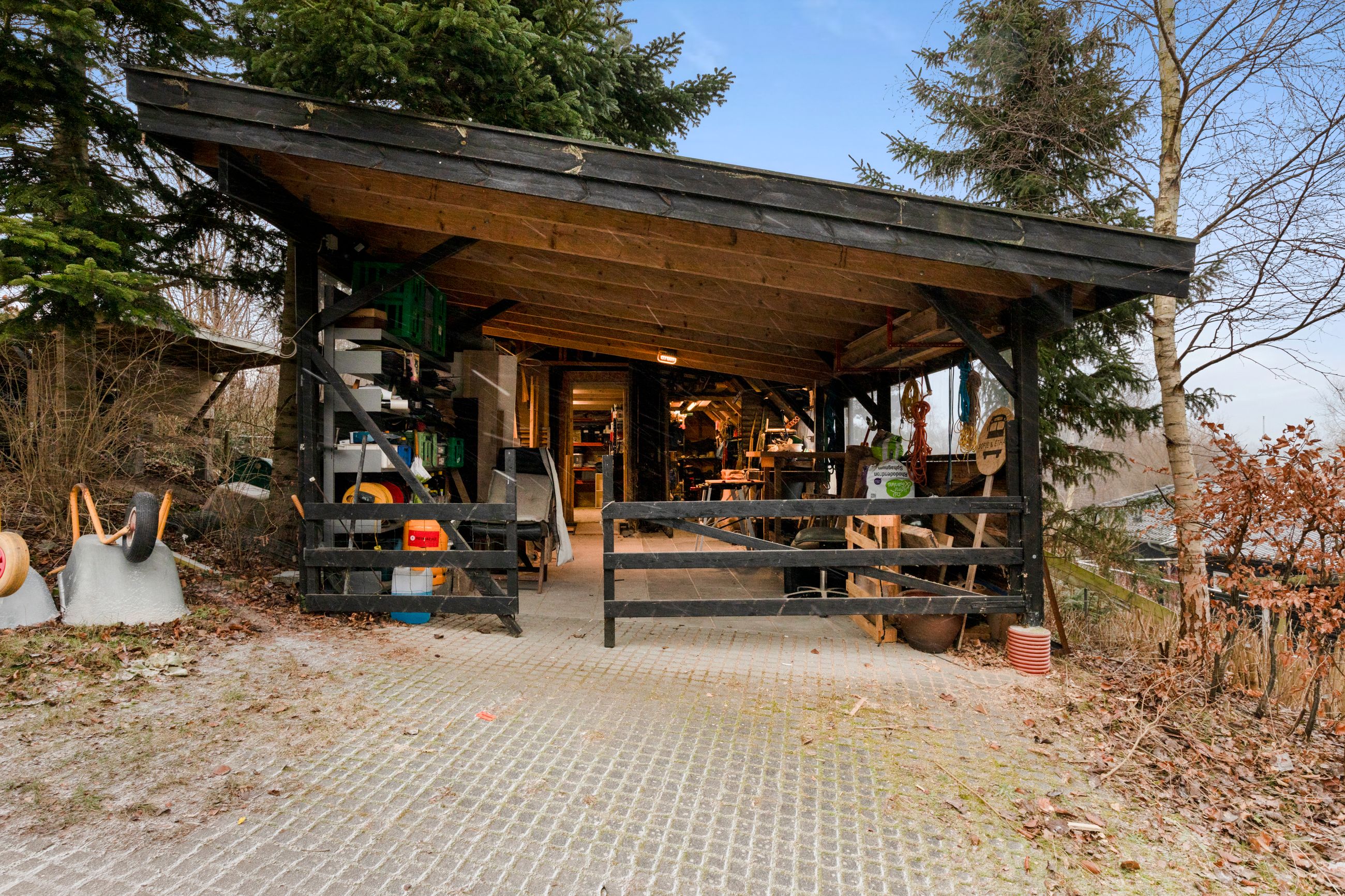 147 kvm bolig + 34 kvm carport med indbygget atelier + 26 kvm carport + 32 kvm udhus (isoleret container)+ 11 kvm overdækning