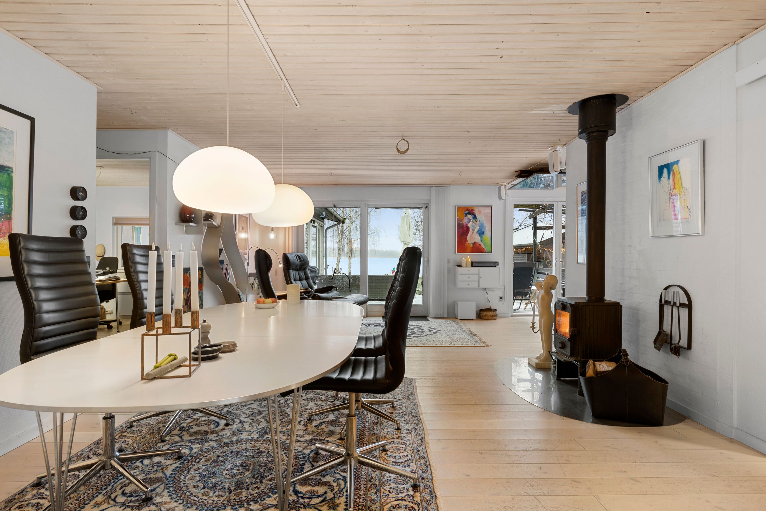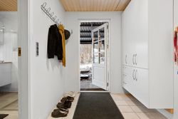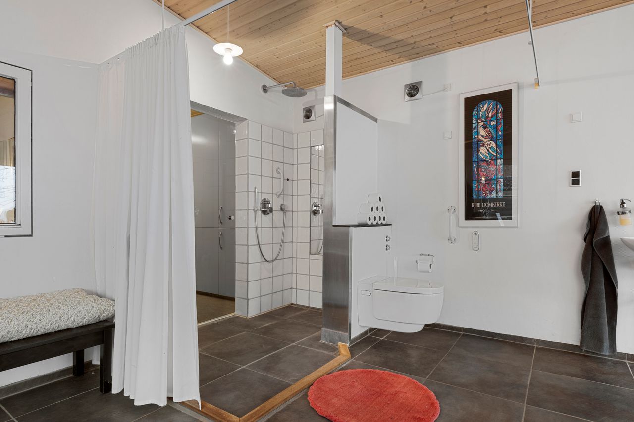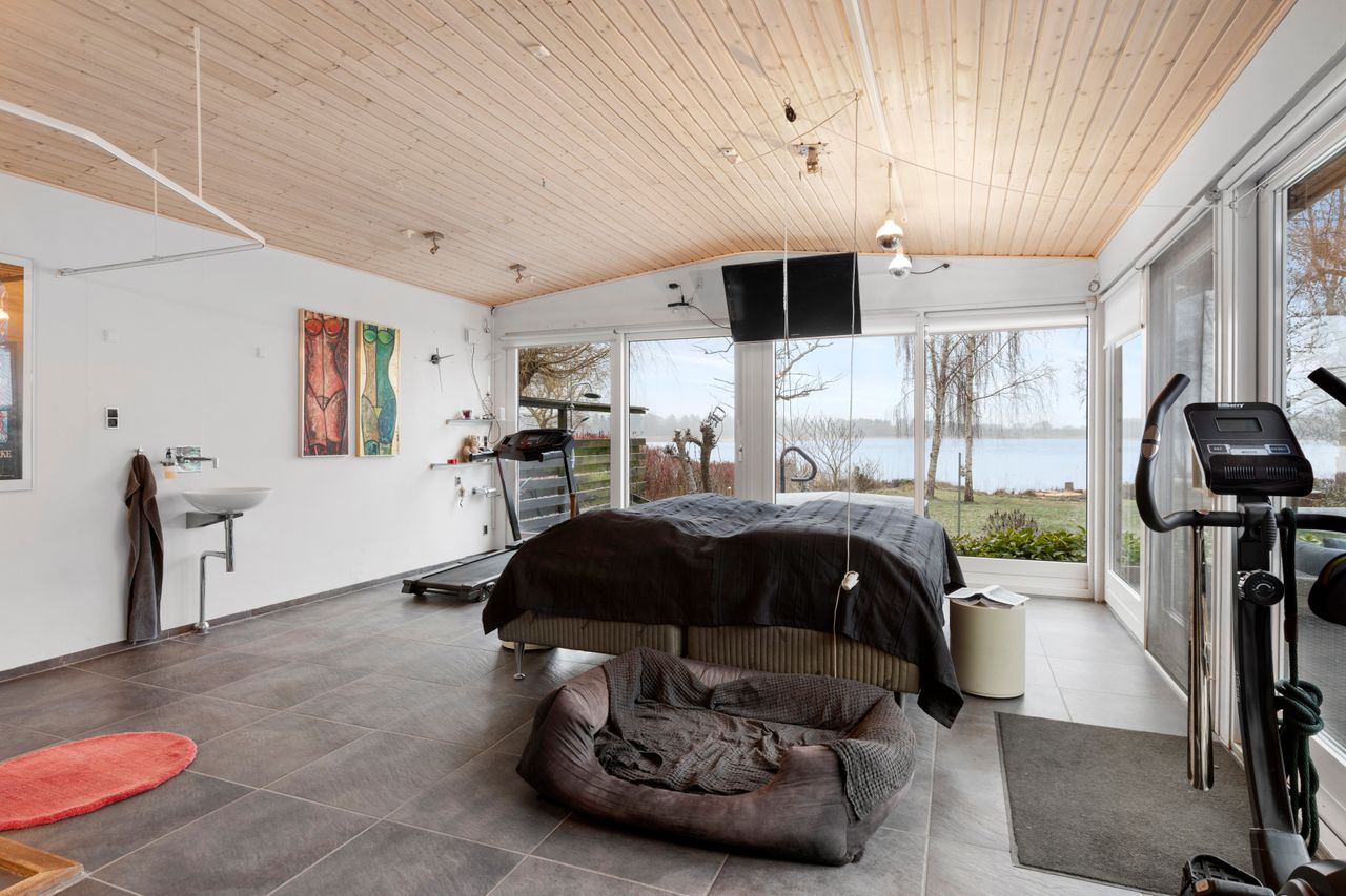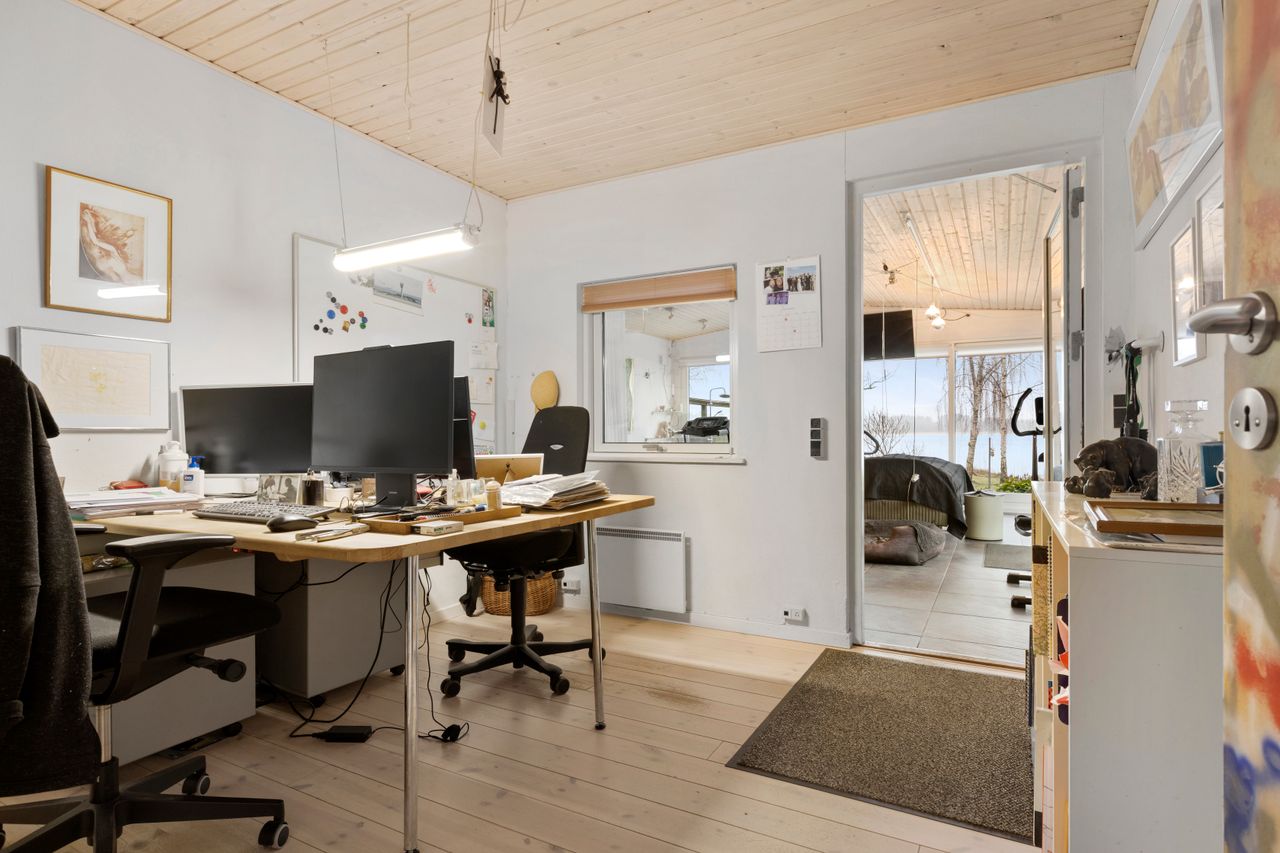 Lys entre med garderobe, stort lyst garderobe/bryggers med installation til vaskemaskine og gulvvarme, badeværelse med bruser, wc og skabsarr. med håndvask, vinkel-opholdsstue med brændeovn og udgang til terrasse, have og søen (evt. mulighed for ekstra værelse i vinkel), hvidt køkken med udgang til østvendt terrasse/gårdhave, værelse, kontor/værelse/gennemgangsrum, depotrum (forberedt til mulighed for sauna) samt stort lyst disponibelt rum med bruser, håndvask, væghængt aquatoilet, klinkegulv og gulvvarme.