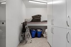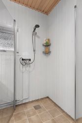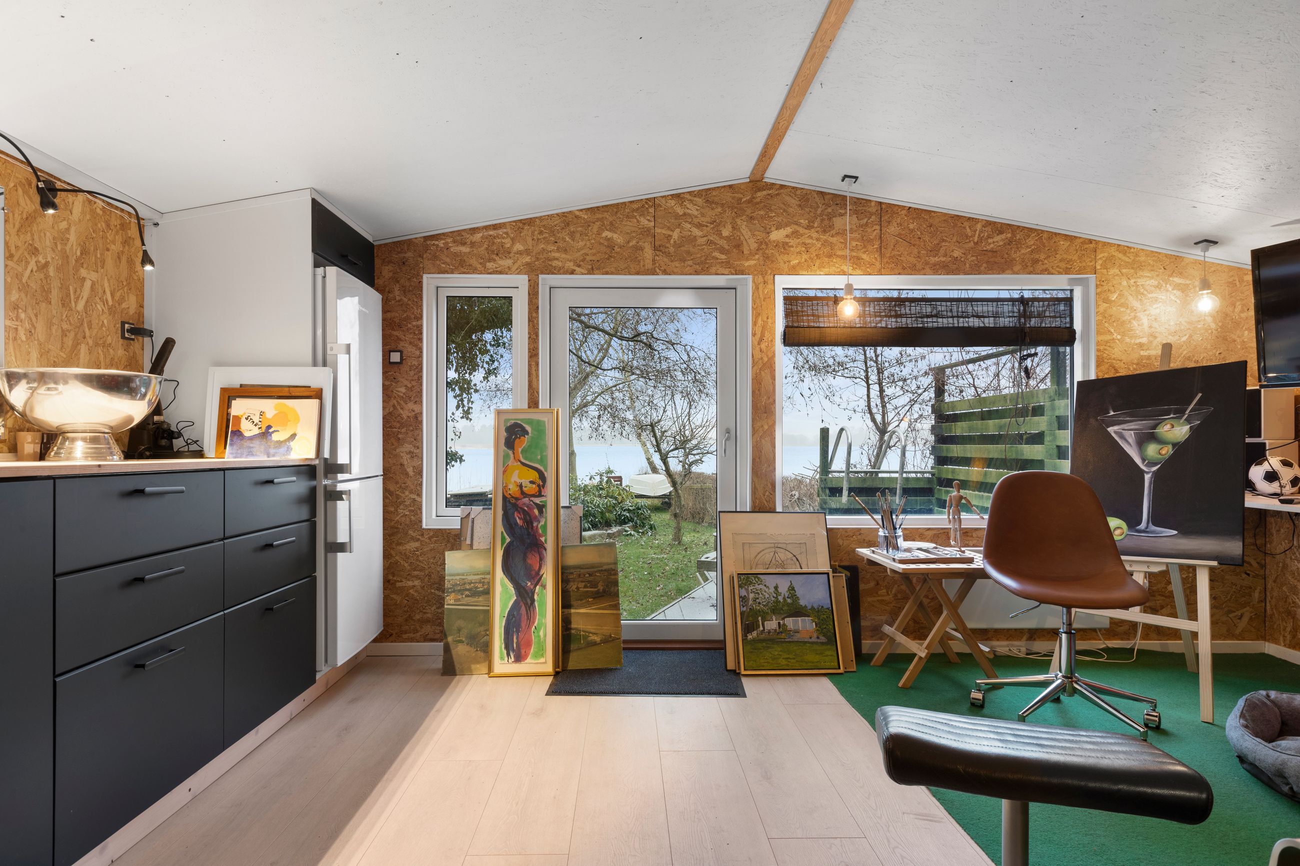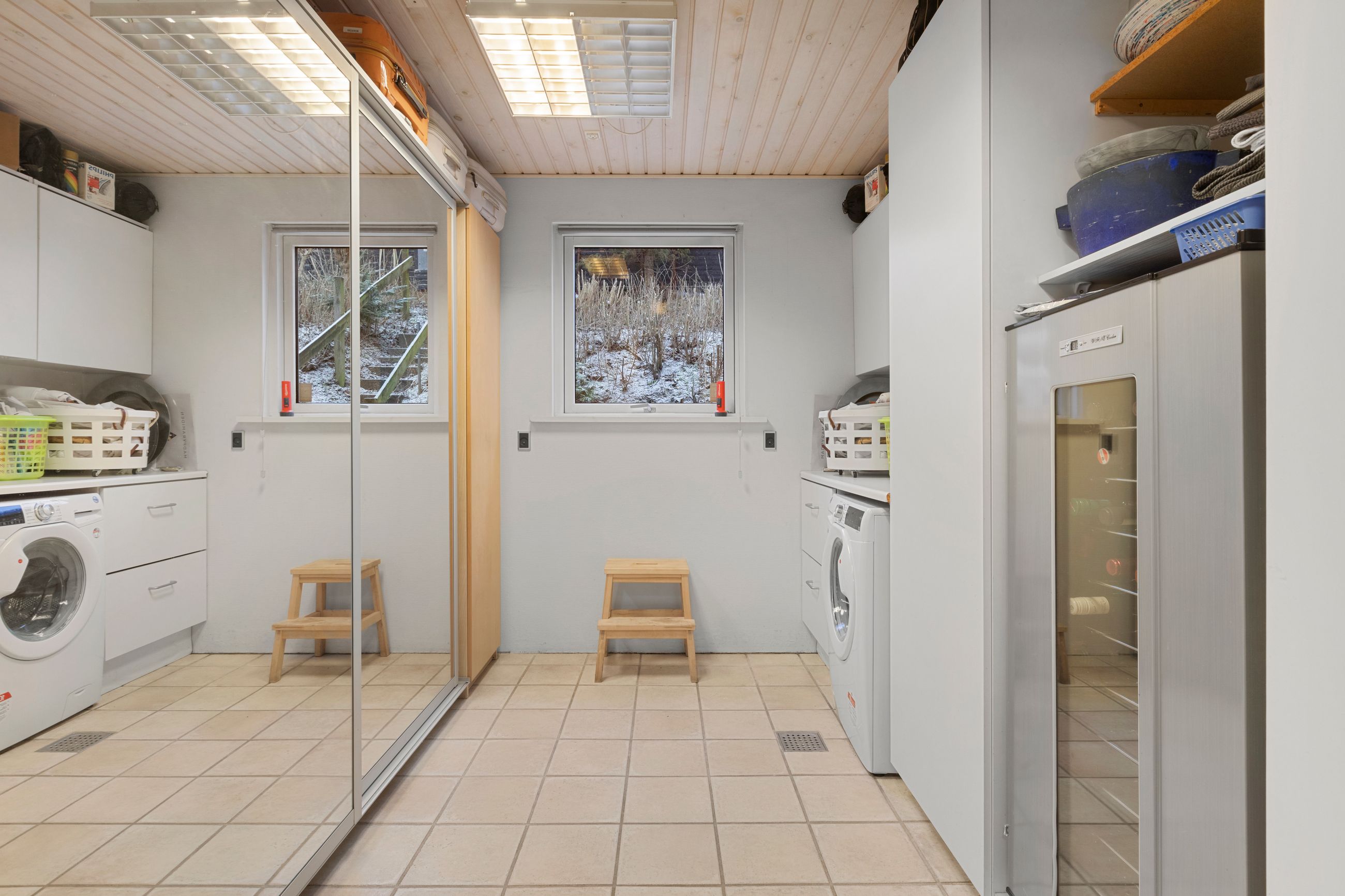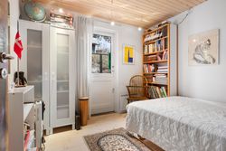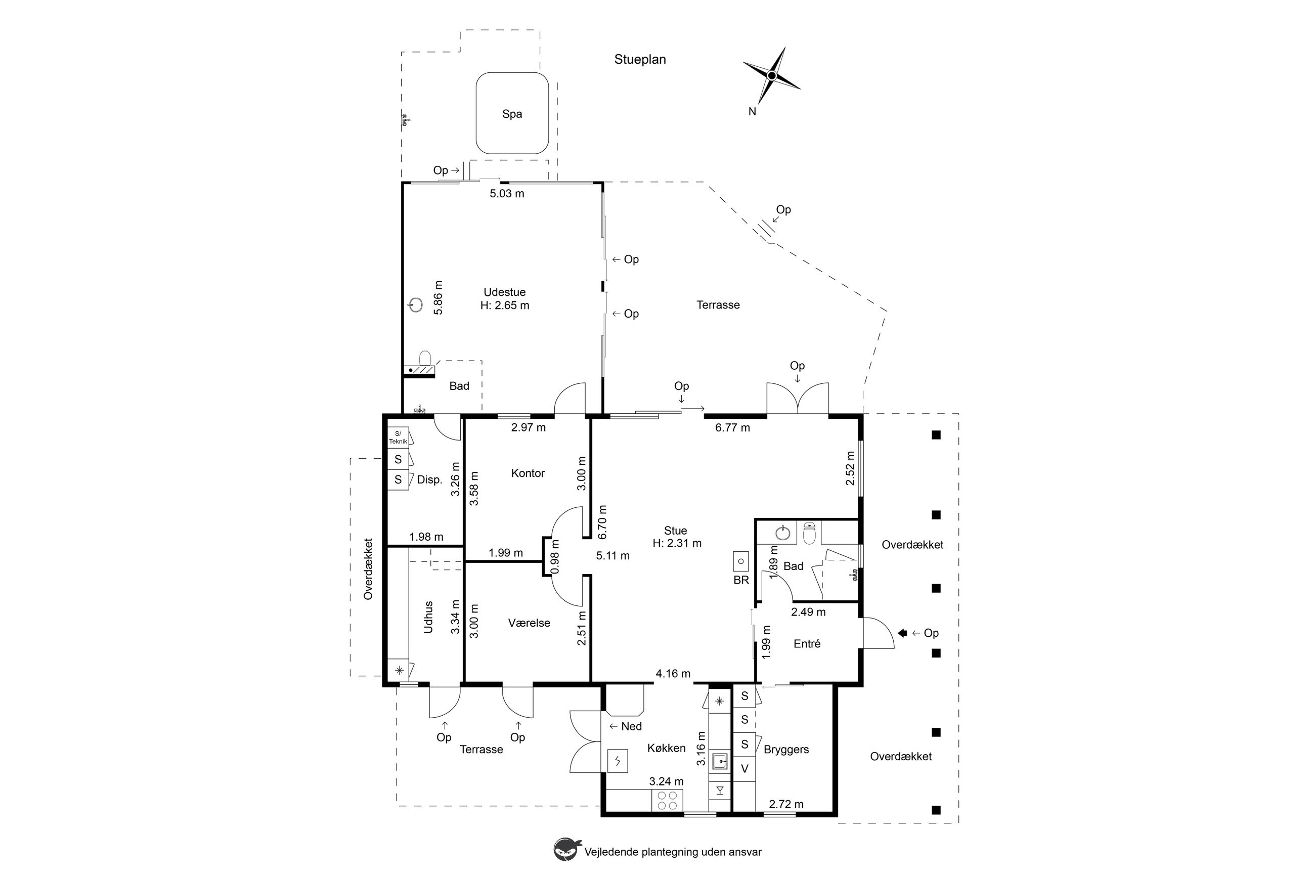 Lys entre med garderobe, stort lyst garderobe/bryggers med installation til vaskemaskine og gulvvarme, badeværelse med bruser, wc og skabsarr. med håndvask, vinkel-opholdsstue med brændeovn og udgang til terrasse, have og søen (evt. mulighed for ekstra værelse i vinkel), hvidt køkken med udgang til østvendt terrasse/gårdhave, værelse, kontor/værelse/gennemgangsrum, depotrum (forberedt til mulighed for sauna) samt stort lyst disponibelt rum med bruser, håndvask, væghængt aquatoilet, klinkegulv og gulvvarme.