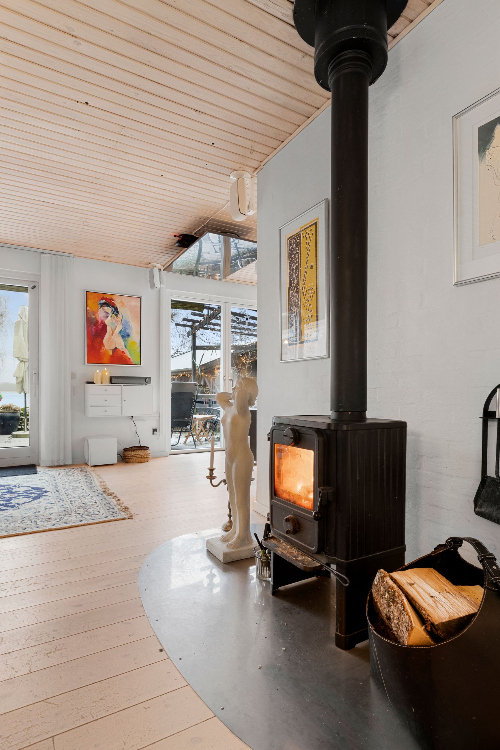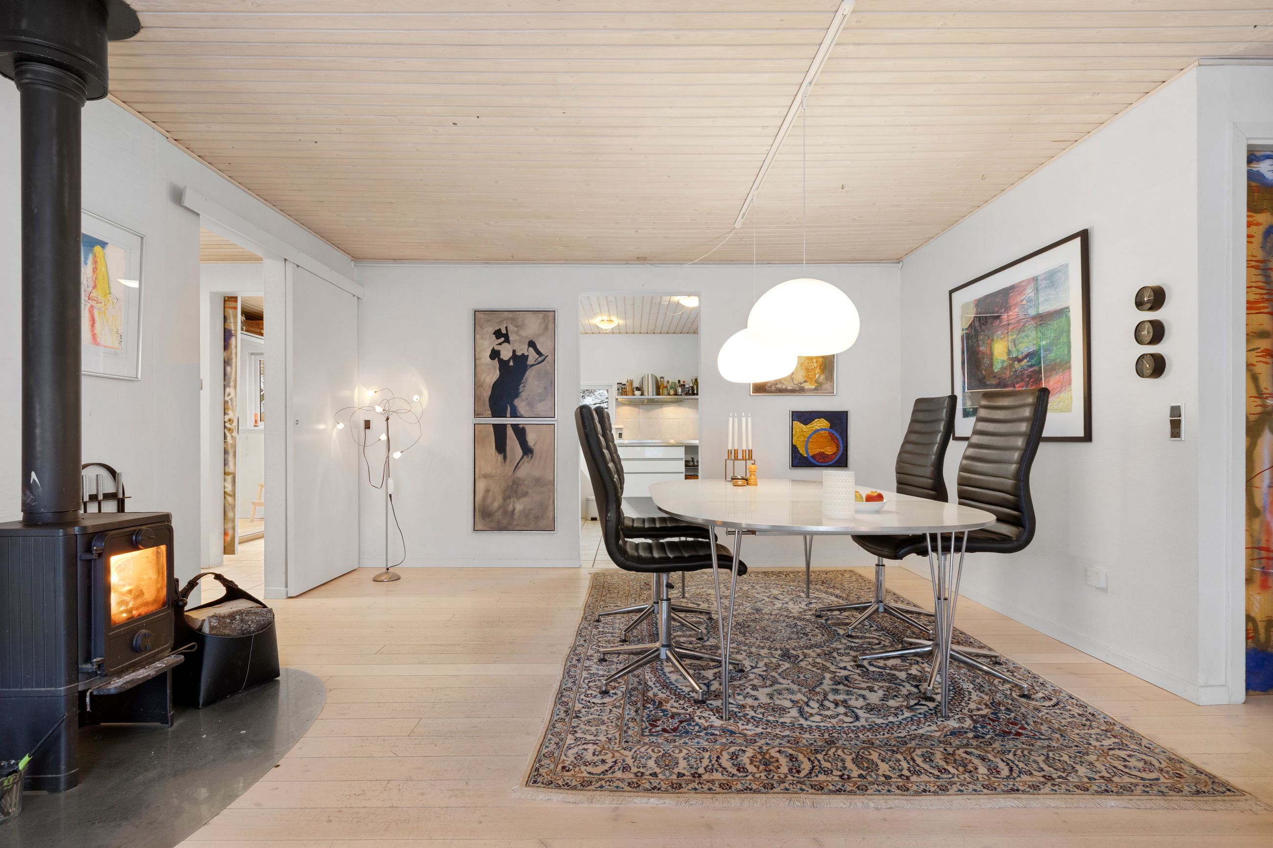 Opvarmes med varmepumpe, brændeovn og elvarme.
