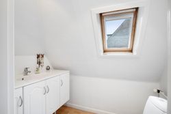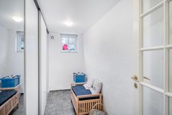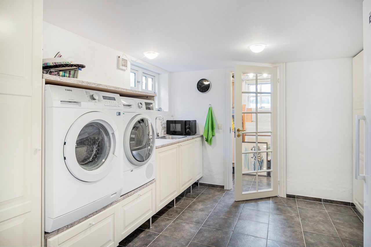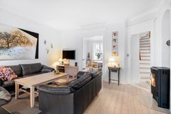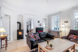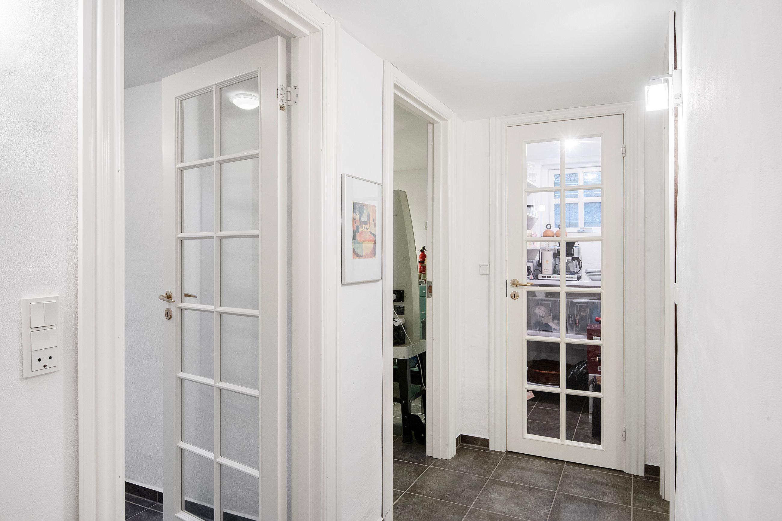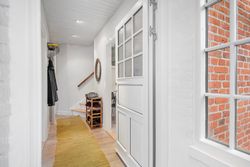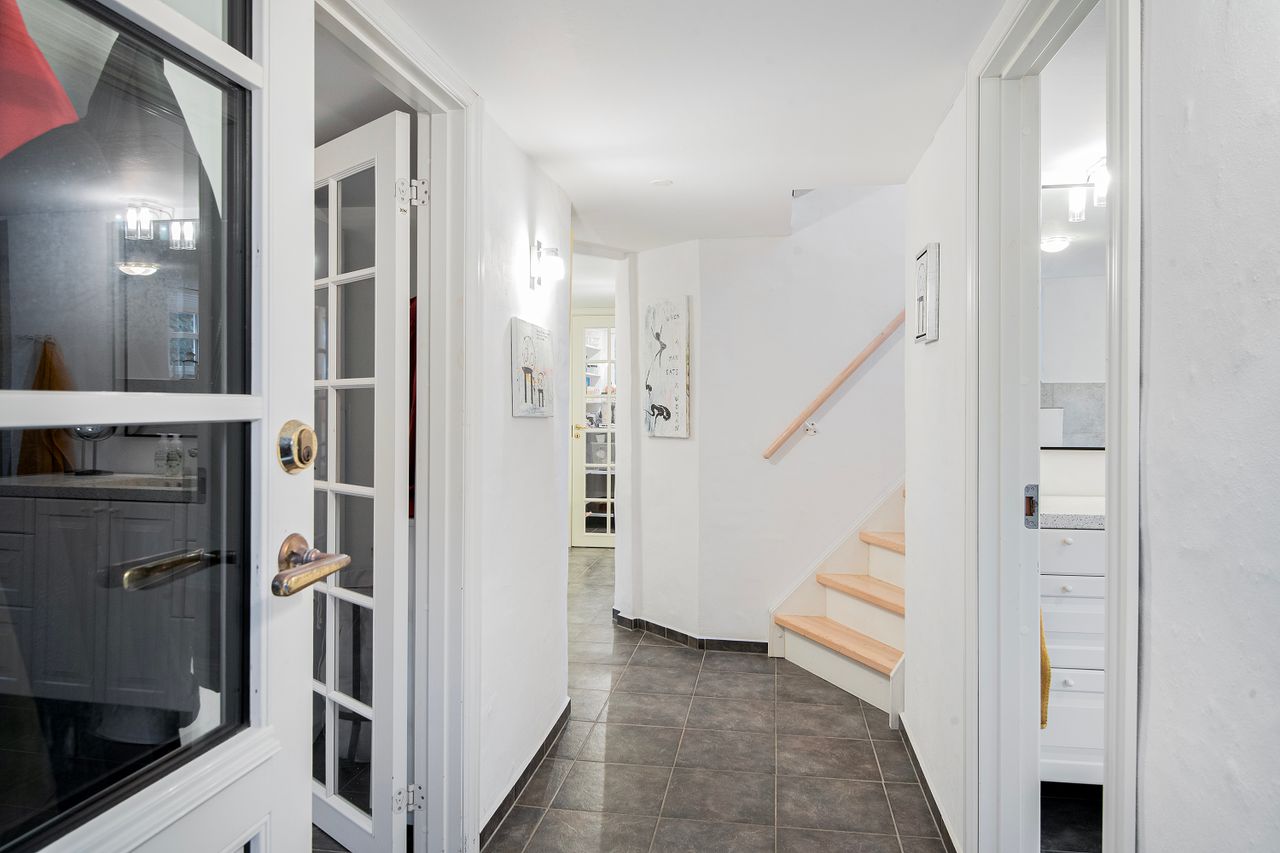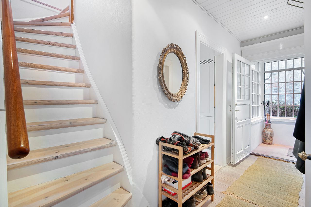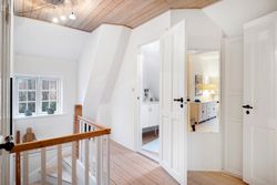stuklofter, store vinduespartier og brændeovn i det ene rum. Førstesalen rummer et gæstetoilet og