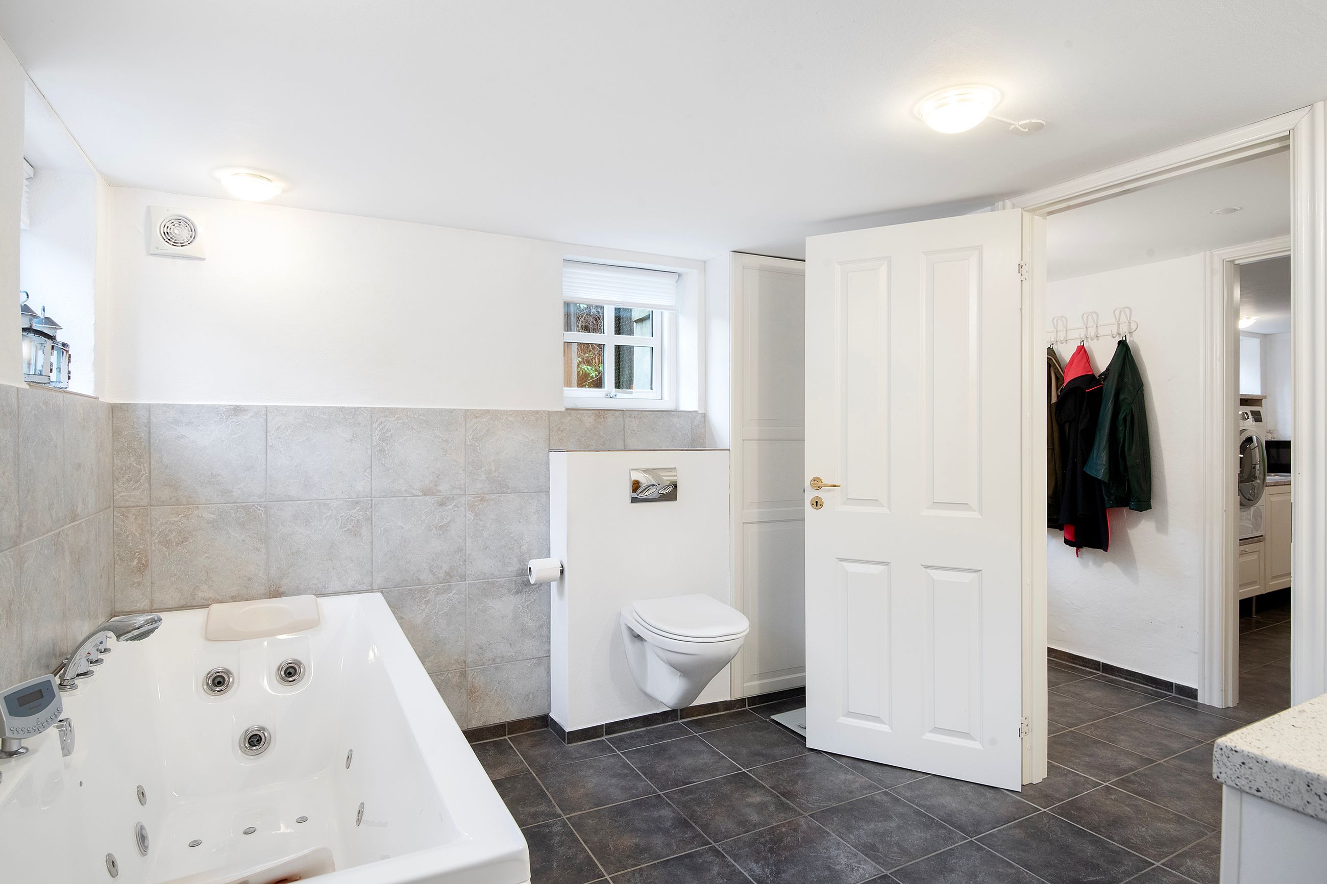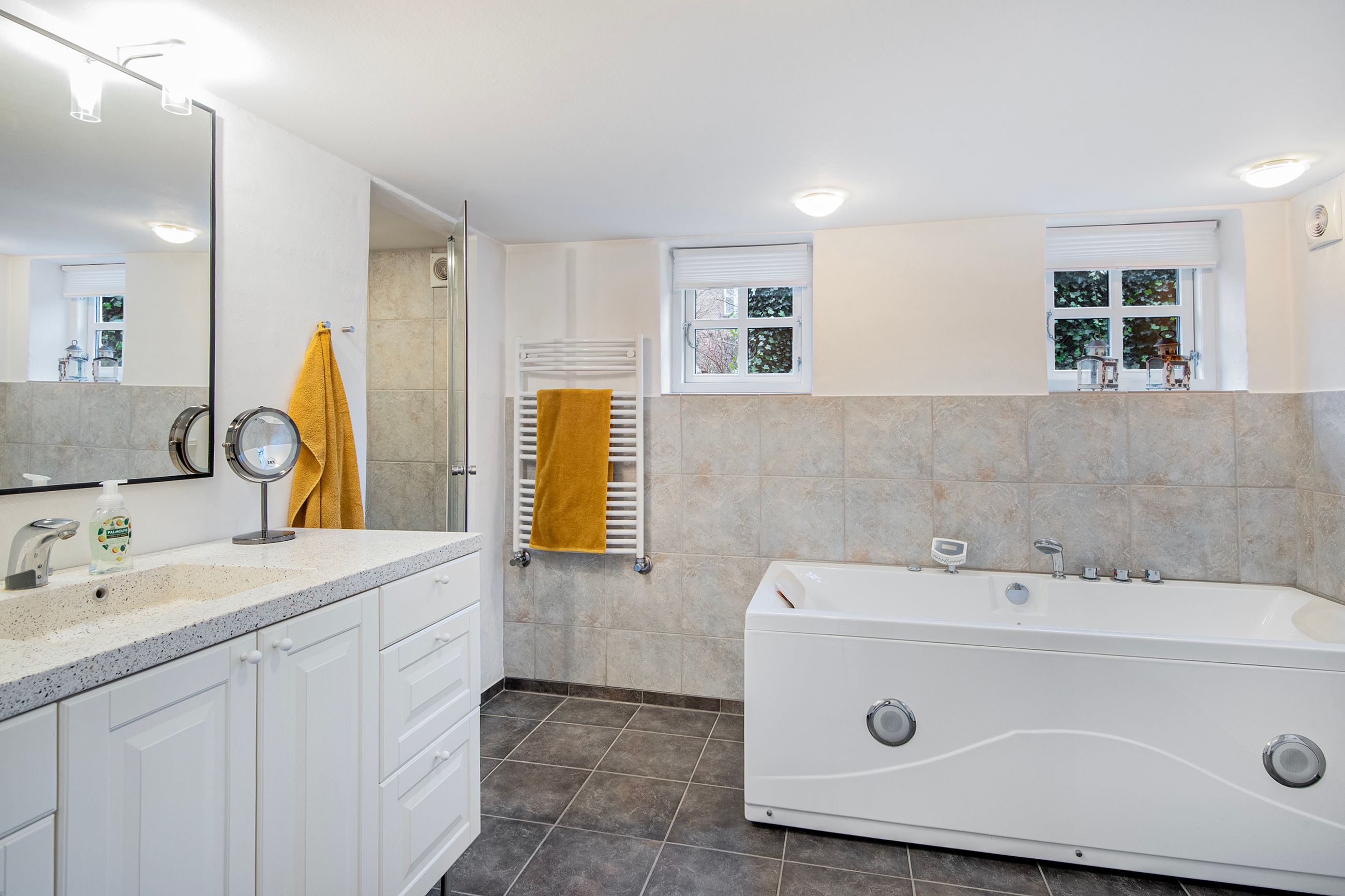 lækkert badeværelse med både bruseniche og spabad samt diverse disponible rum, der kan