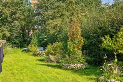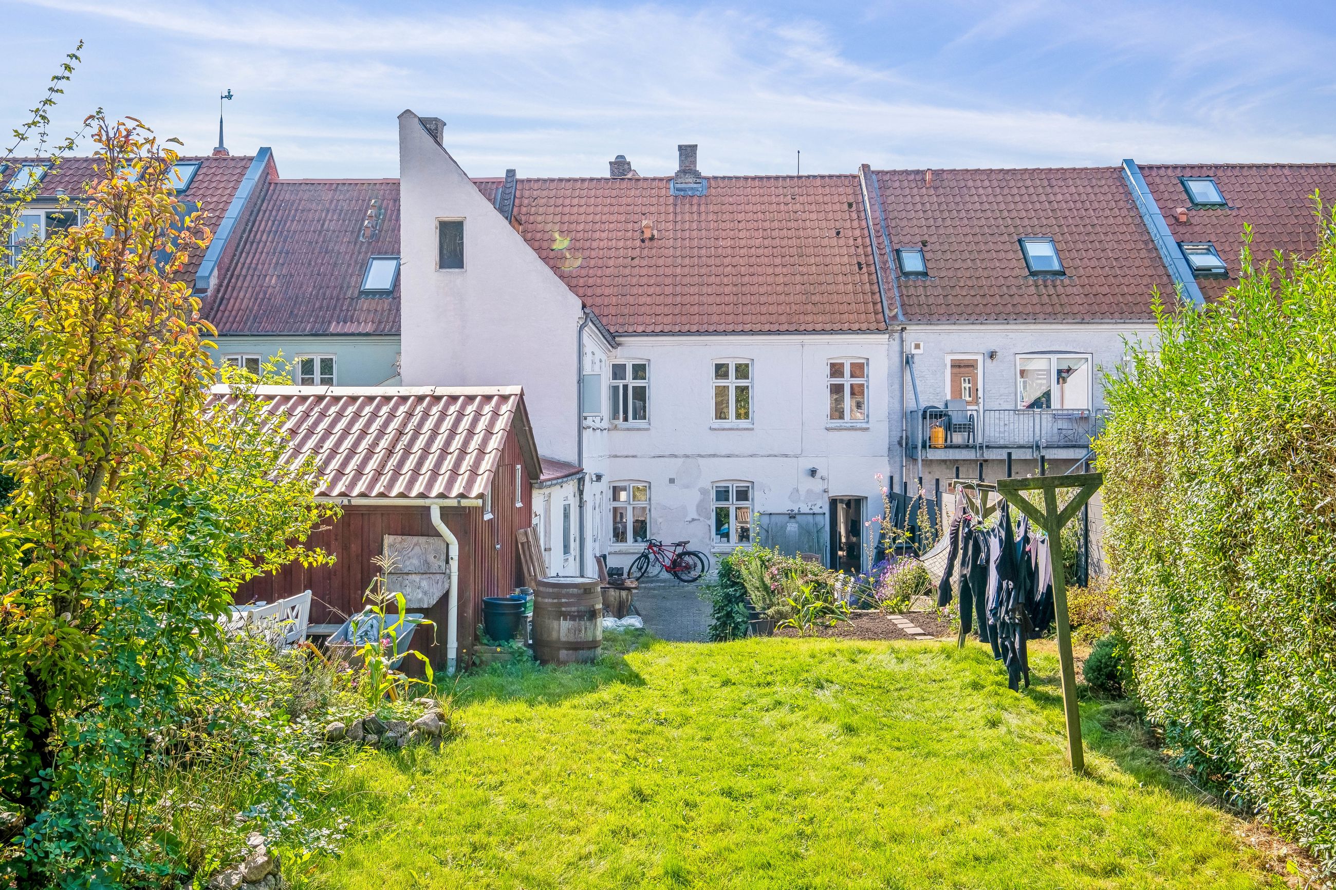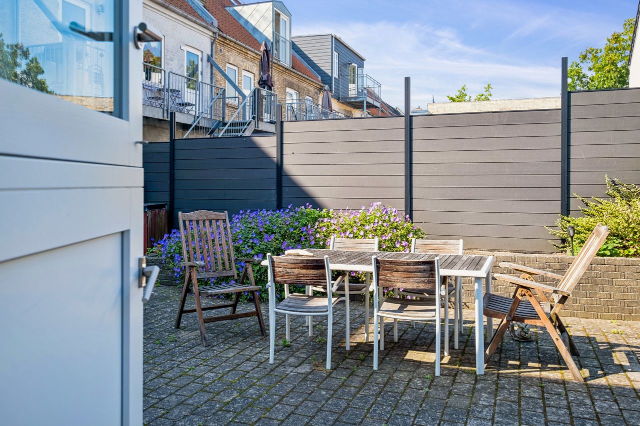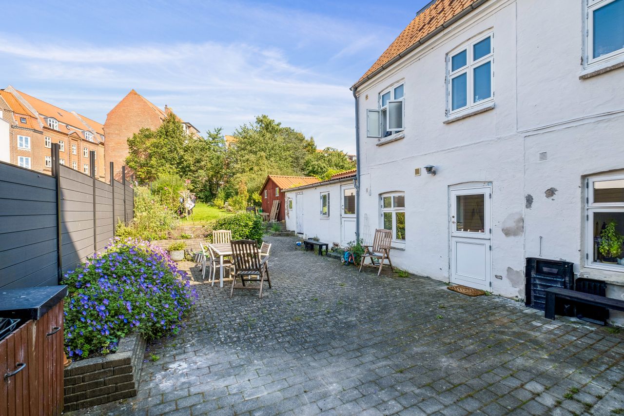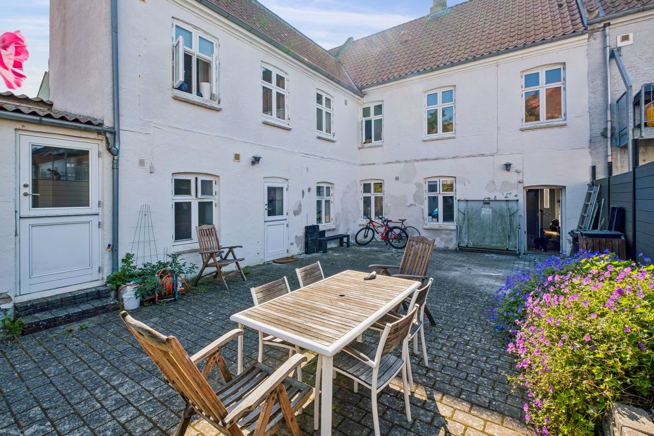 Gårdhaven er et frodigt miljø med masser af muligheder for afslapning og udendørs aktiviteter. Her kan du nyde de varme sommerdage, lufte vasketøjet, eller bygge en snemand når sneen er faldet. Her er stille og roligt og du bemærker knapt at du befinder dig helt centralt i Horsens midtby. Du deler herlighederne med kun én overbo, da der kun er to lejligheder i ejendommen.