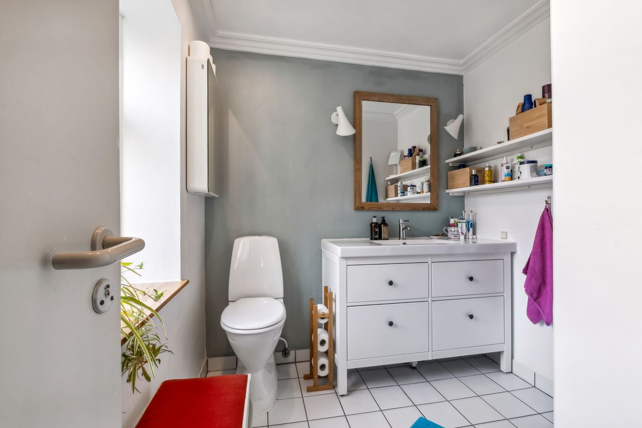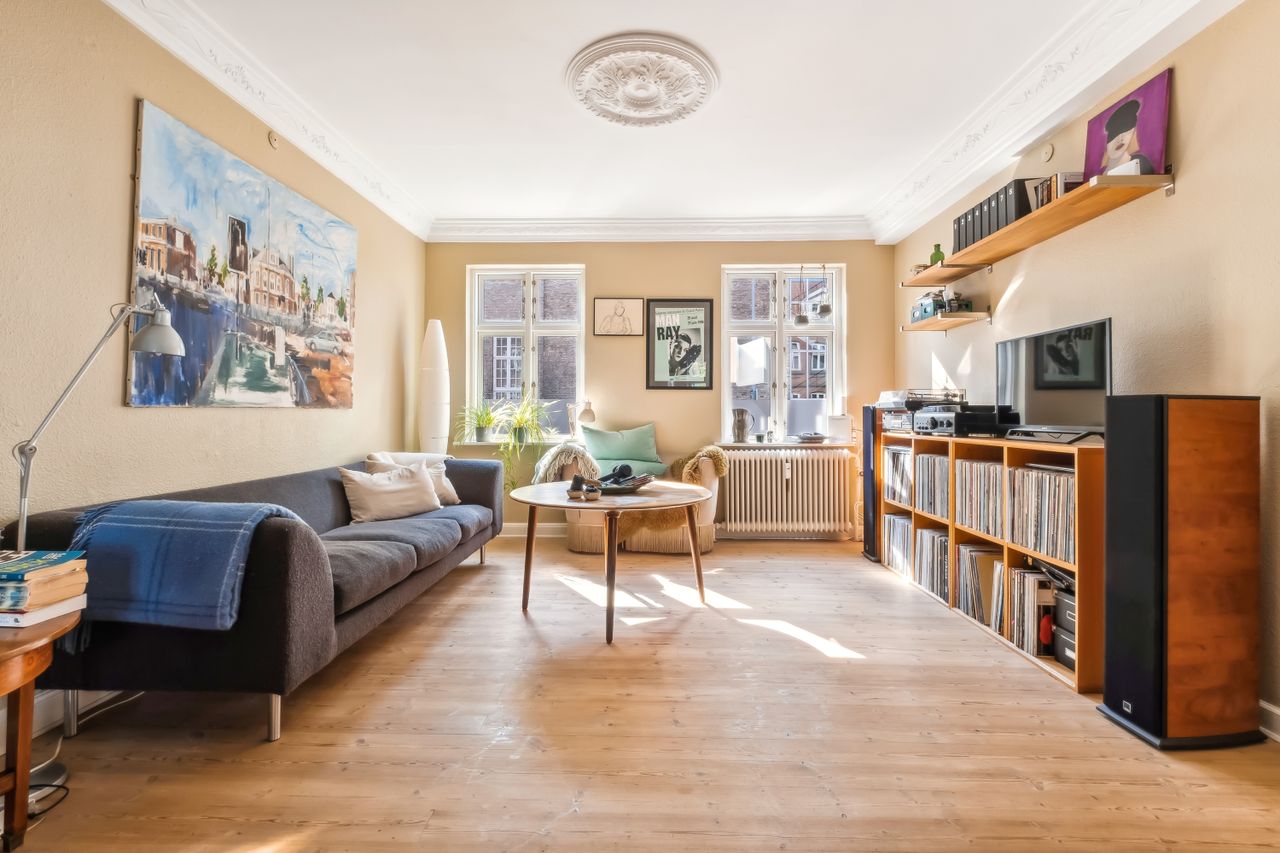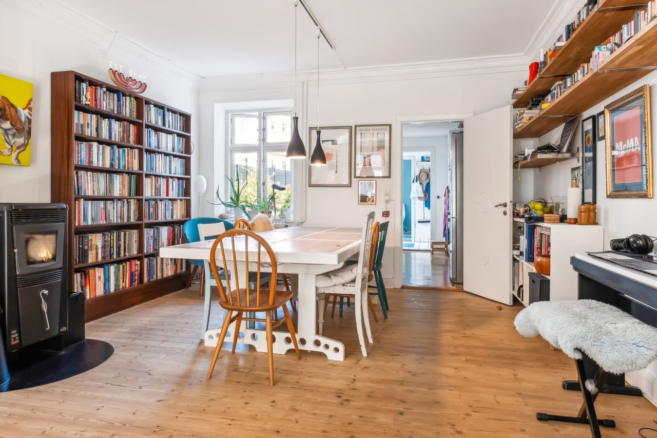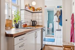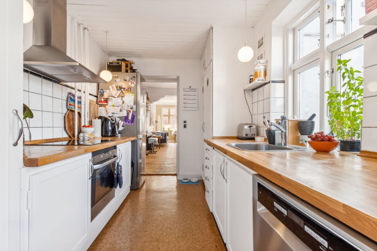 Når du træder ind i lejligheden, bliver du mødt af en rummelig entre med fordeling til lejlighedens 2 gode værelser. Herefter træder du ind i de lyse stuer med god plads og smukke plankegulve. Her er tilmed en praktisk pillebrændeovn. Køkkenet er funktionelt indrettet og med kig til gårdhaven. Fra køkkenet går du i bryggerset som har direkte udgang til den hyggelige gårdhave og installation til vaskemaskine og tørretumbler. I forbindelse med bryggers ligger badeværelset fra 2018 fra Ikea med el-gulvvarme og bruser.