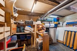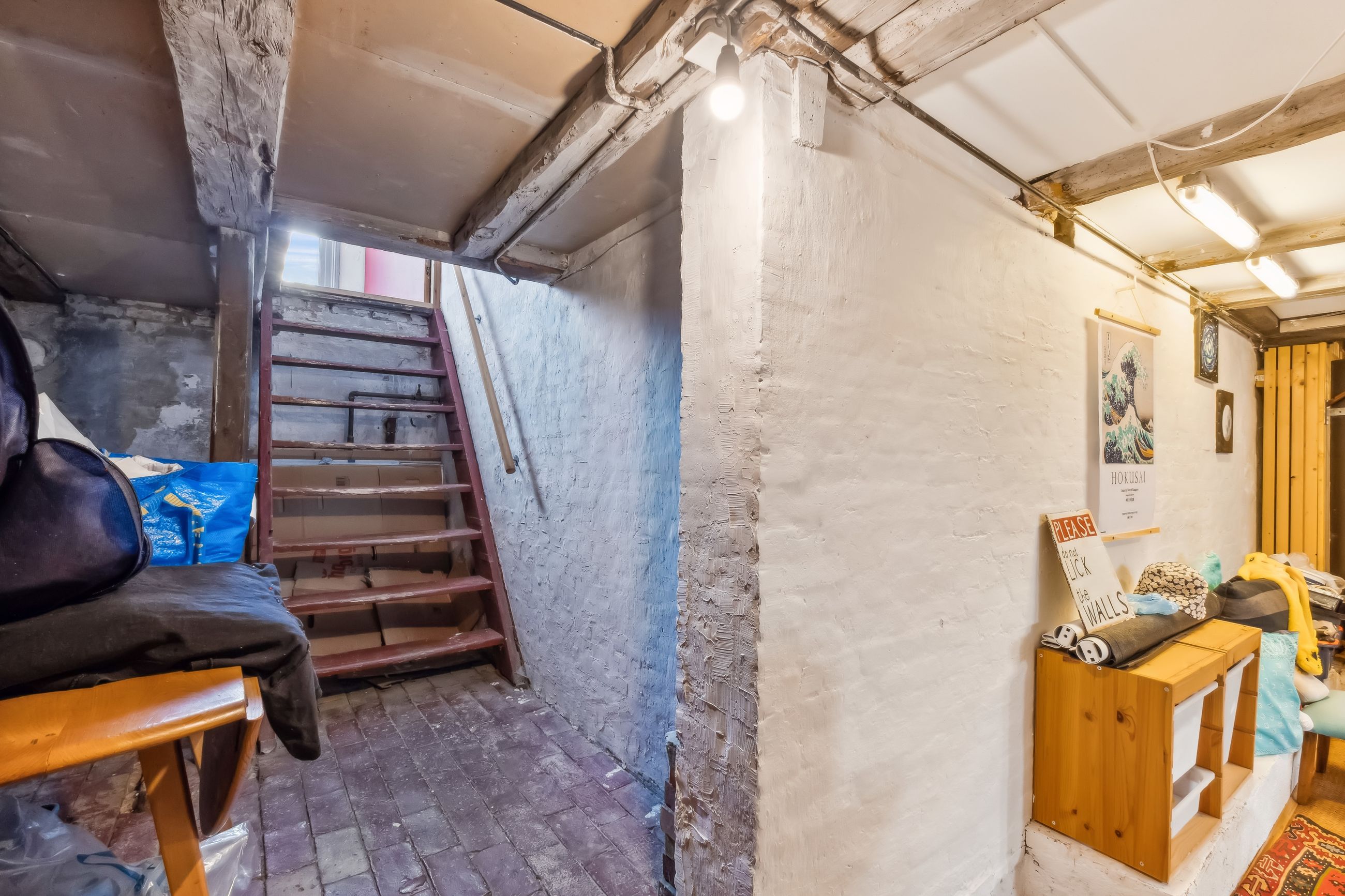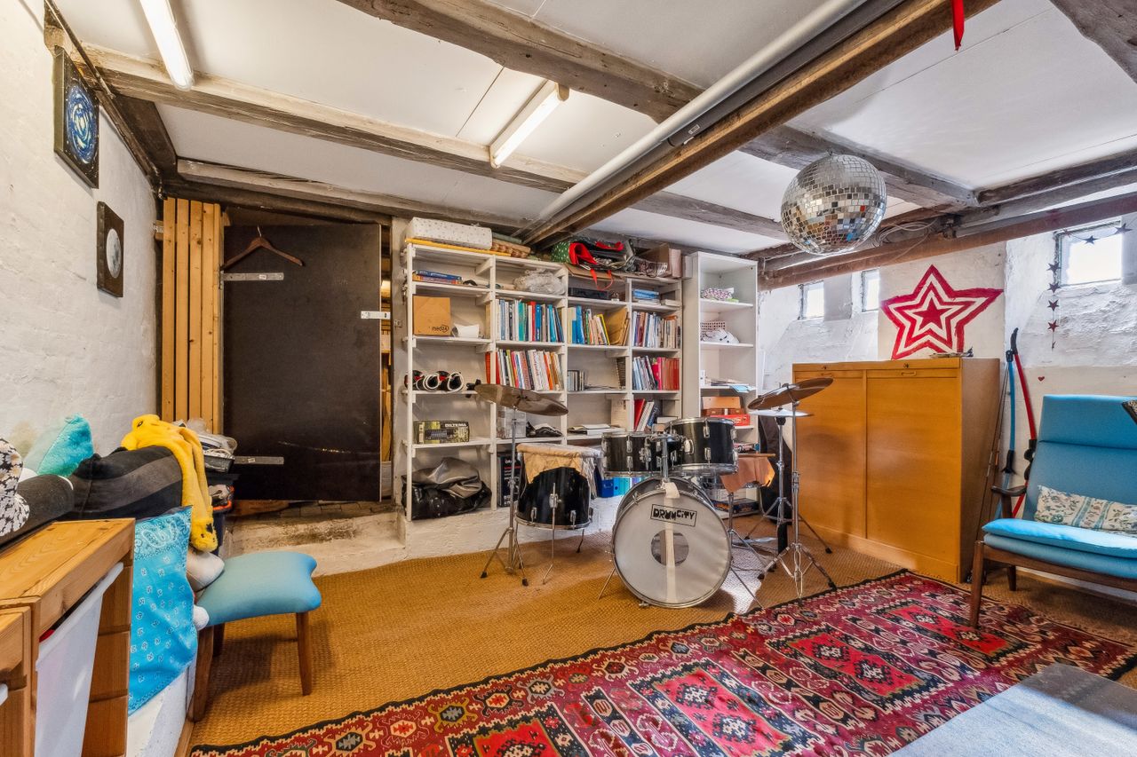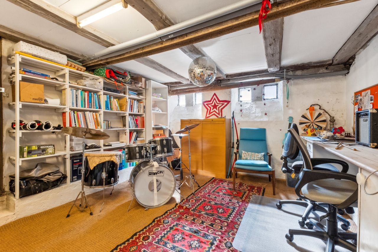 Gode ekstra kvadratmeter findes der også i den meget anvendelige kælder på 50 m2 som i dag er rammerne for et hyggeligt kreativt rum med plads til hygge, musik og kontorarbejde.