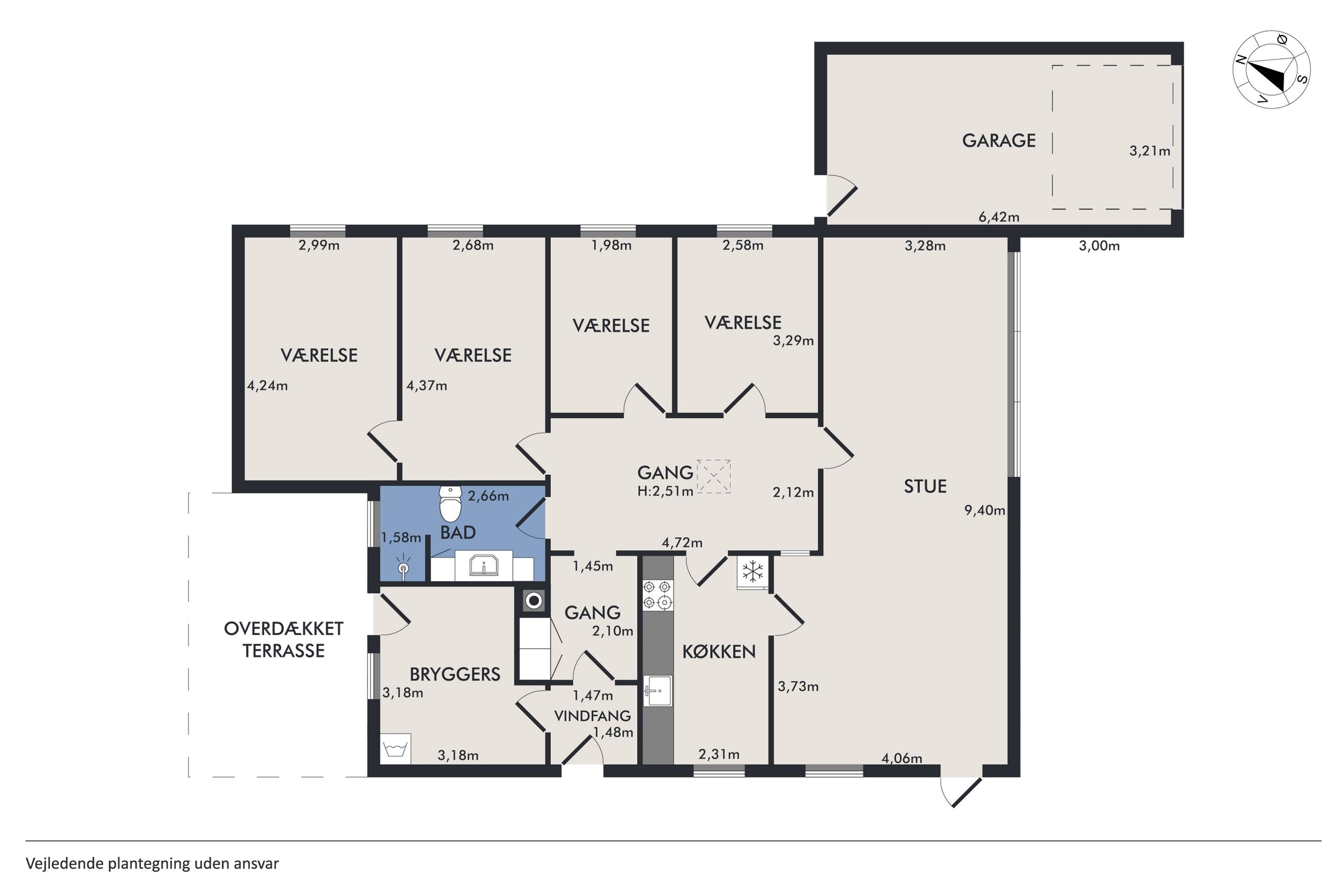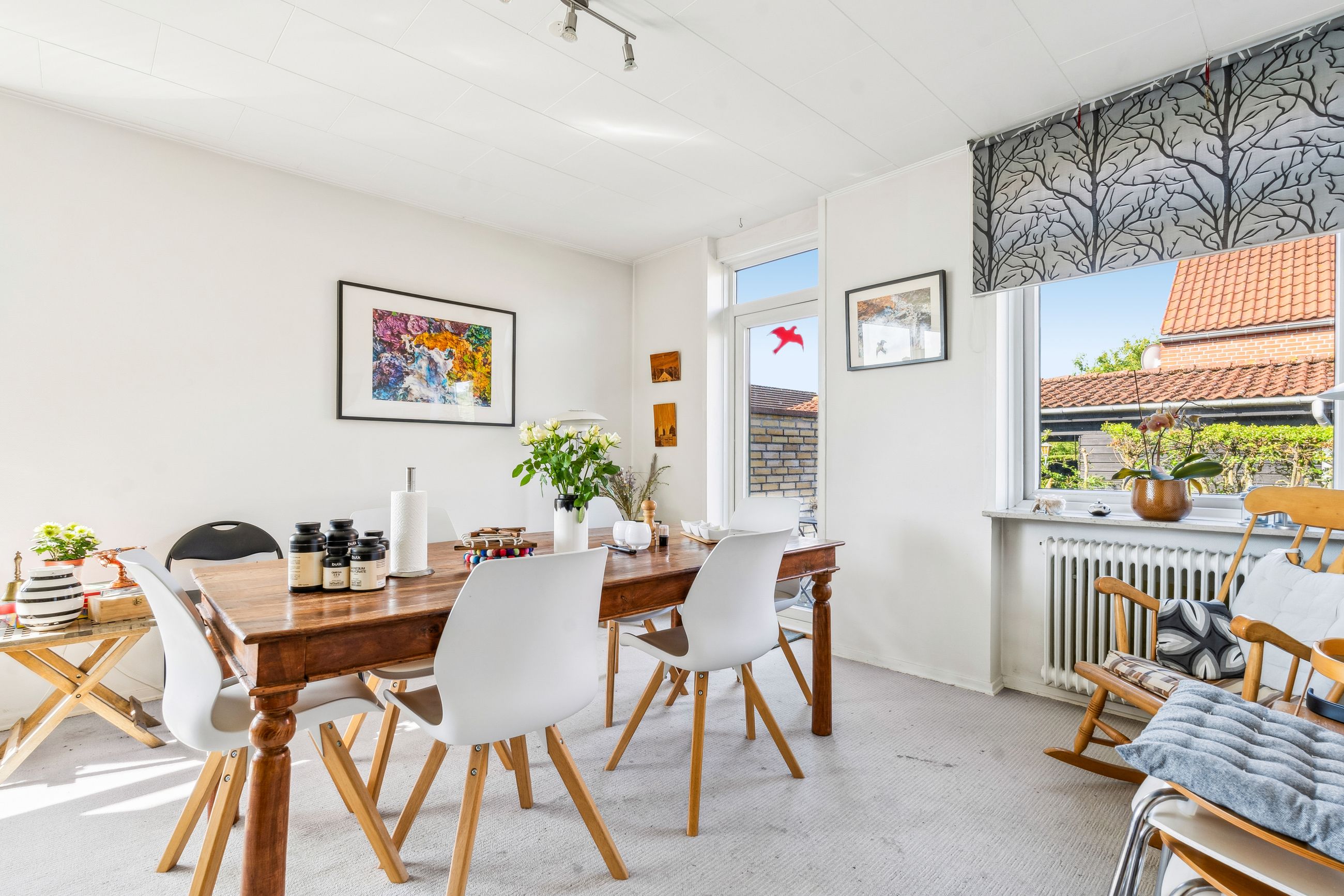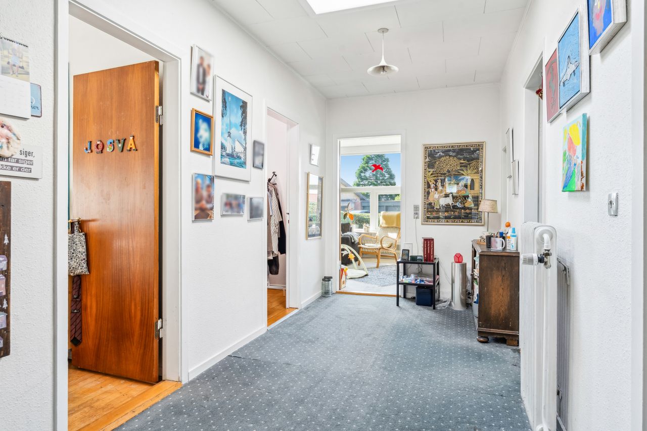 Boligens planløsning fordeler sig med entre/vindfang, bryggers med udgang til haven, rummelig fordelingsgang med ovenlys og fordeling til 4 værelser med parketgulve gemt under de nuværende tæpper. Endvidere stor lys stue - igen med parketgulve under tæppe samt udgang til terrasse. Køkkenet er af ældre dato, men rummer potentiale for at blive omdannet til et moderne madlavningsparadis efter dine egne ønsker og med mulighed for at åbne op mod stuen. Badeværelset blev renoveret i 1996 og inkluderer gulvvarme for ekstra komfort på kolde morgener.