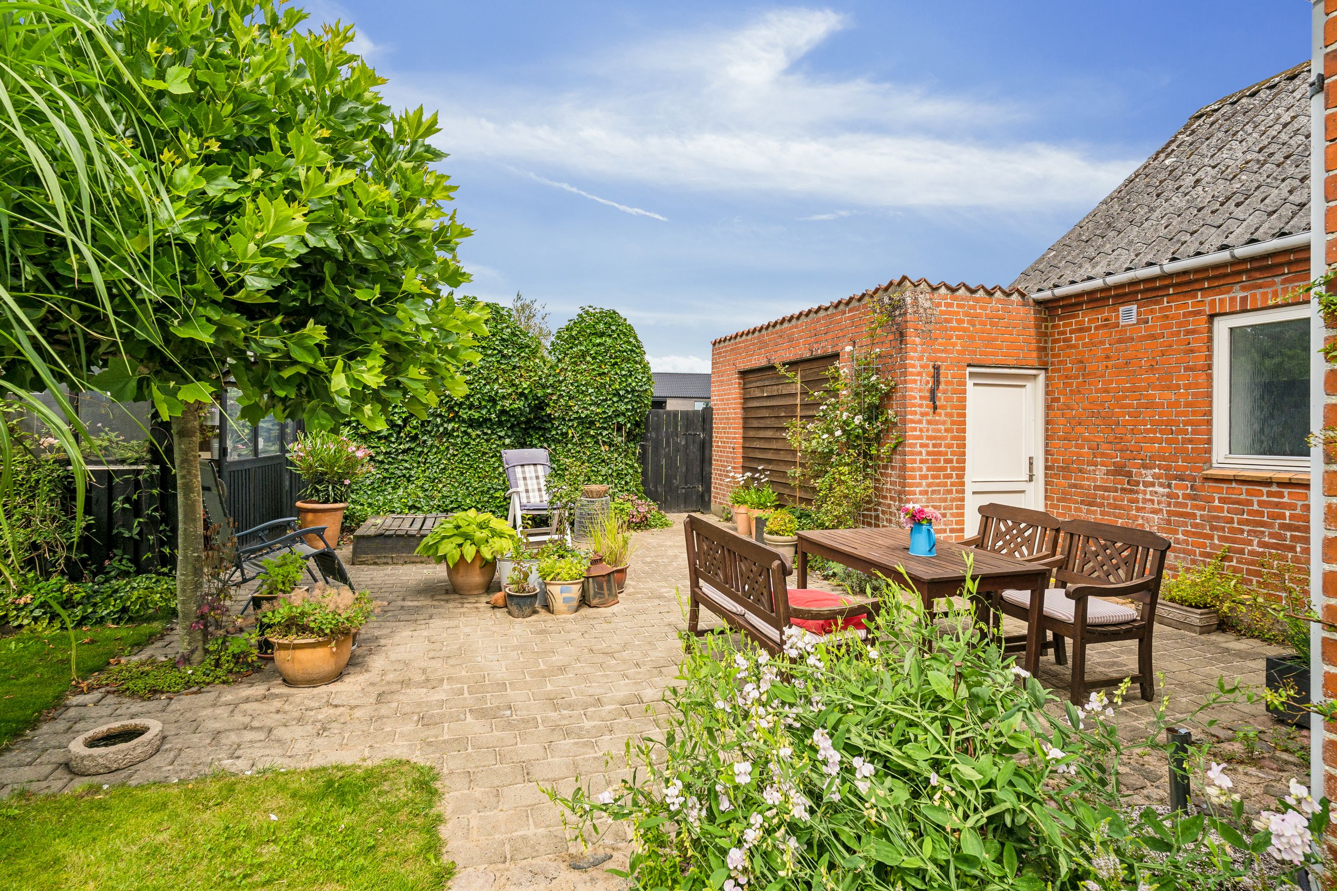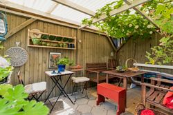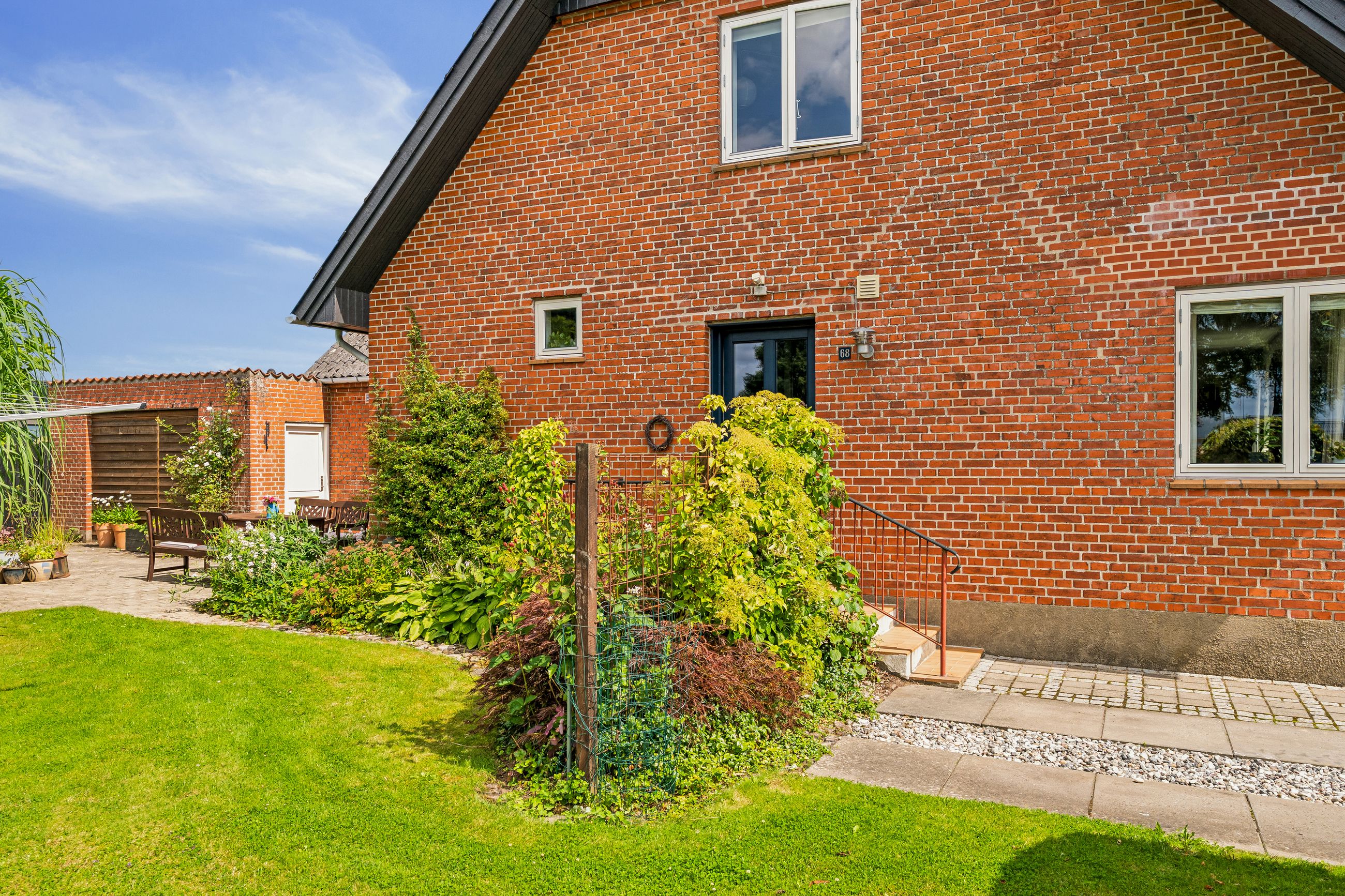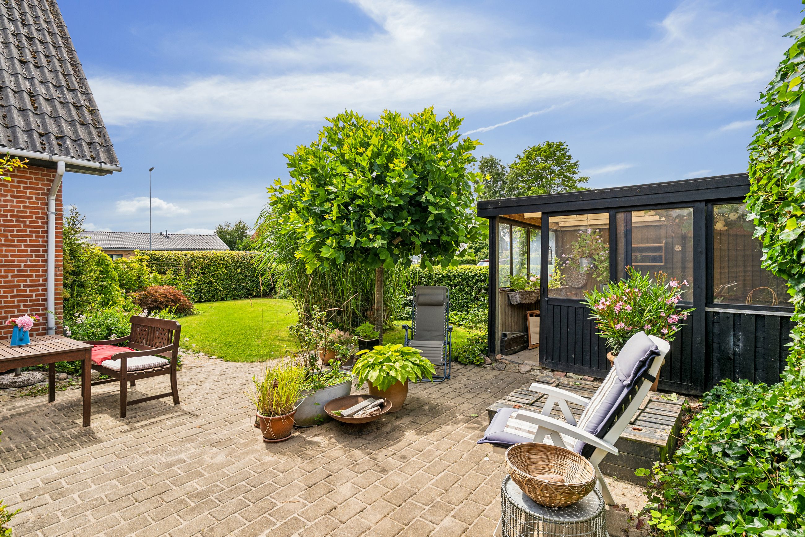 Udenfor venter en mindre vedligeholdelsesnem have samt en hyggelig overdækning, der kan lukkes helt af og dermed bruges som udestue eller orangeri – perfekt sted at nyde kaffen mens man betragter årstidernes skiften.