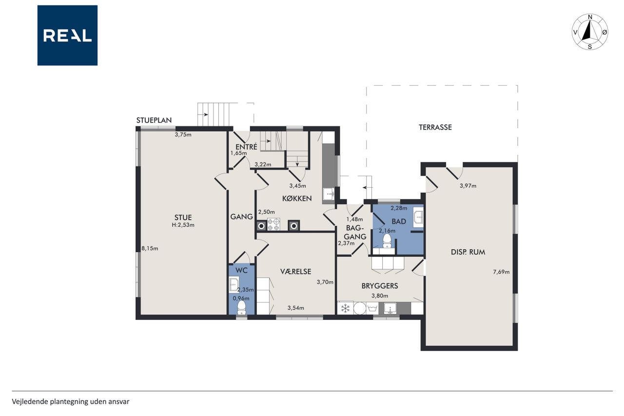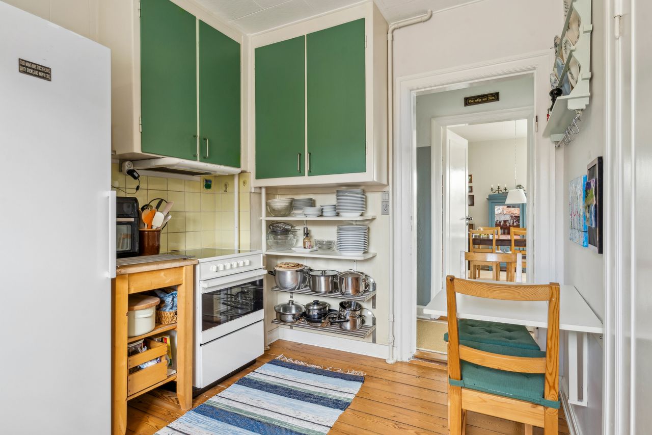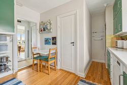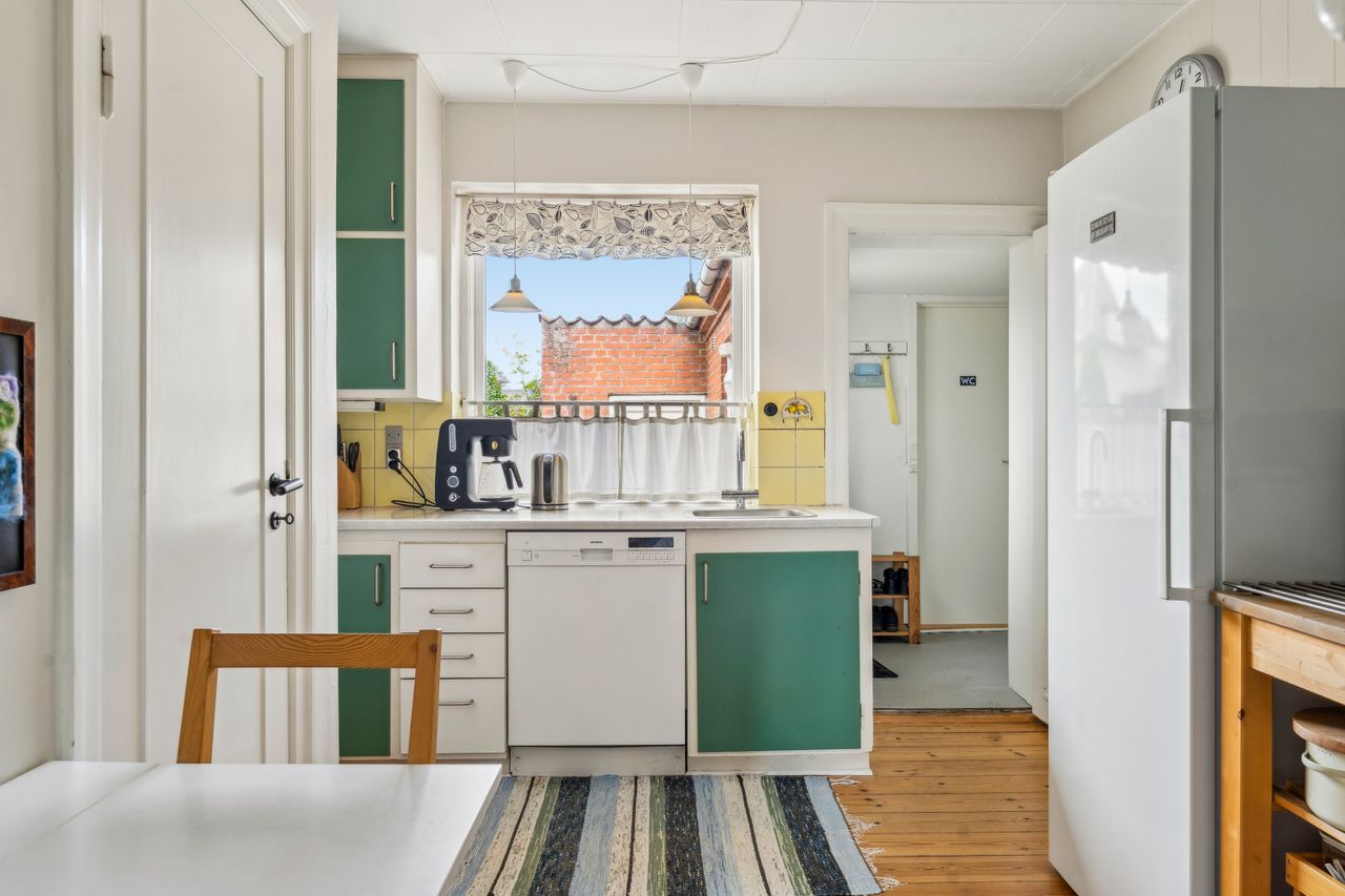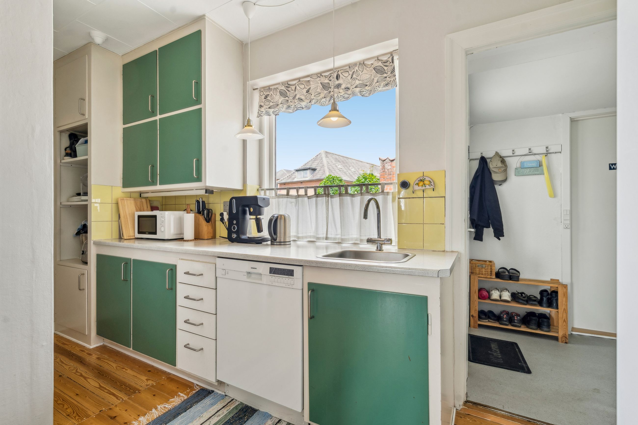 Stueplan indeholder en dejlig stor stue, hvor store vinduespartier sikrer et fantastisk lysindfald hele dagen. Det fine trægulv skaber en varm atmosfære, der indbyder til hyggelige stunder med familien. Det ældre køkken er funktionelt indrettet med en lille spiseplads – perfekt til de hurtige morgenmåltider. Herudover finder du et stort soveværelse udstyret med rummelige skabe, et toilet samt et lyst badeværelse med gulvvarme og et praktisk bryggers med masser af skabsplads og gulvvarme.