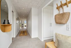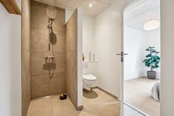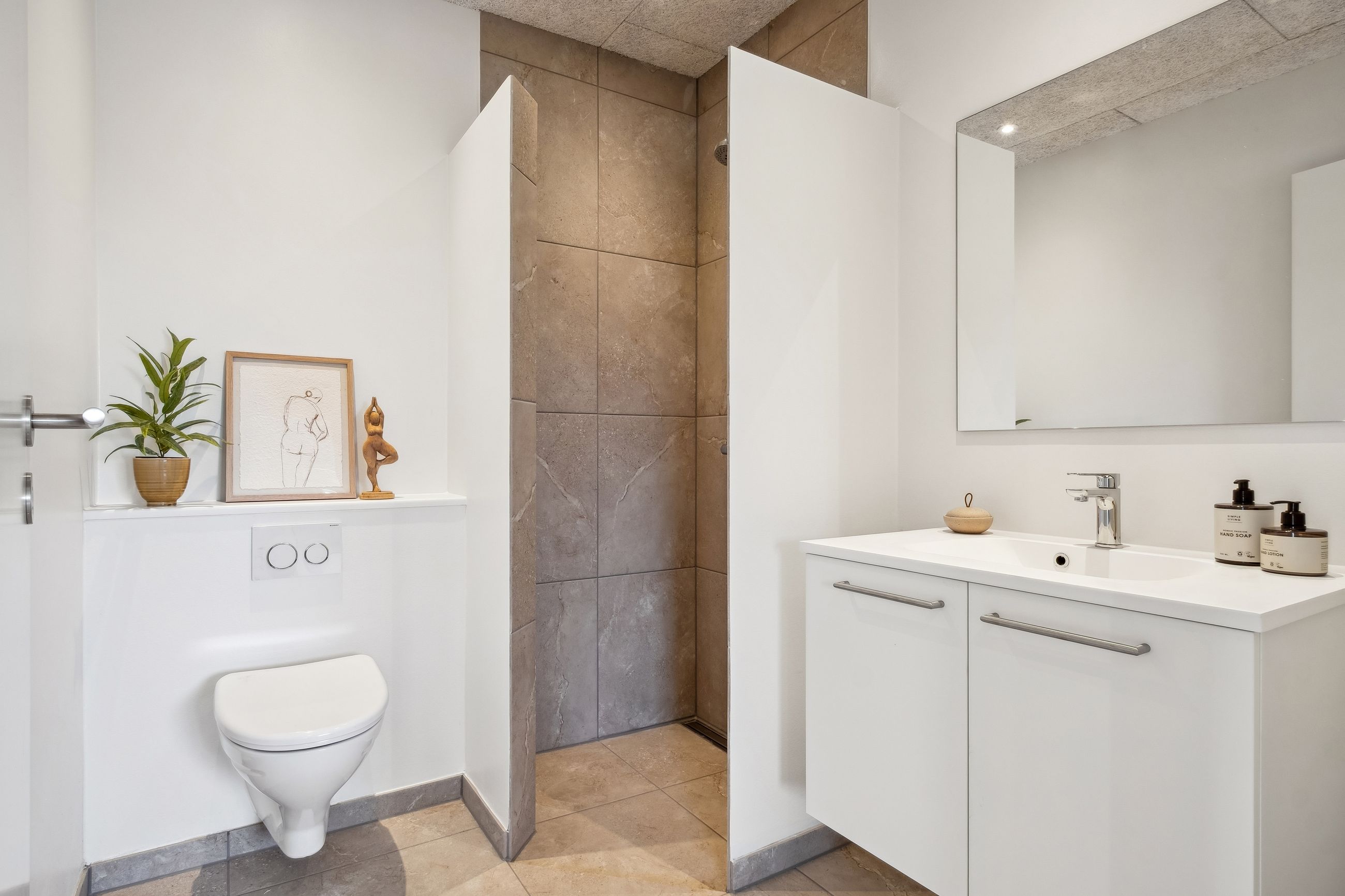 Brusenicher med linjeafløb, gulvvarme i alle rum, væghængte toiletter med skjult cisterne og Silent