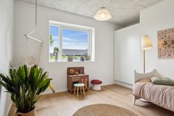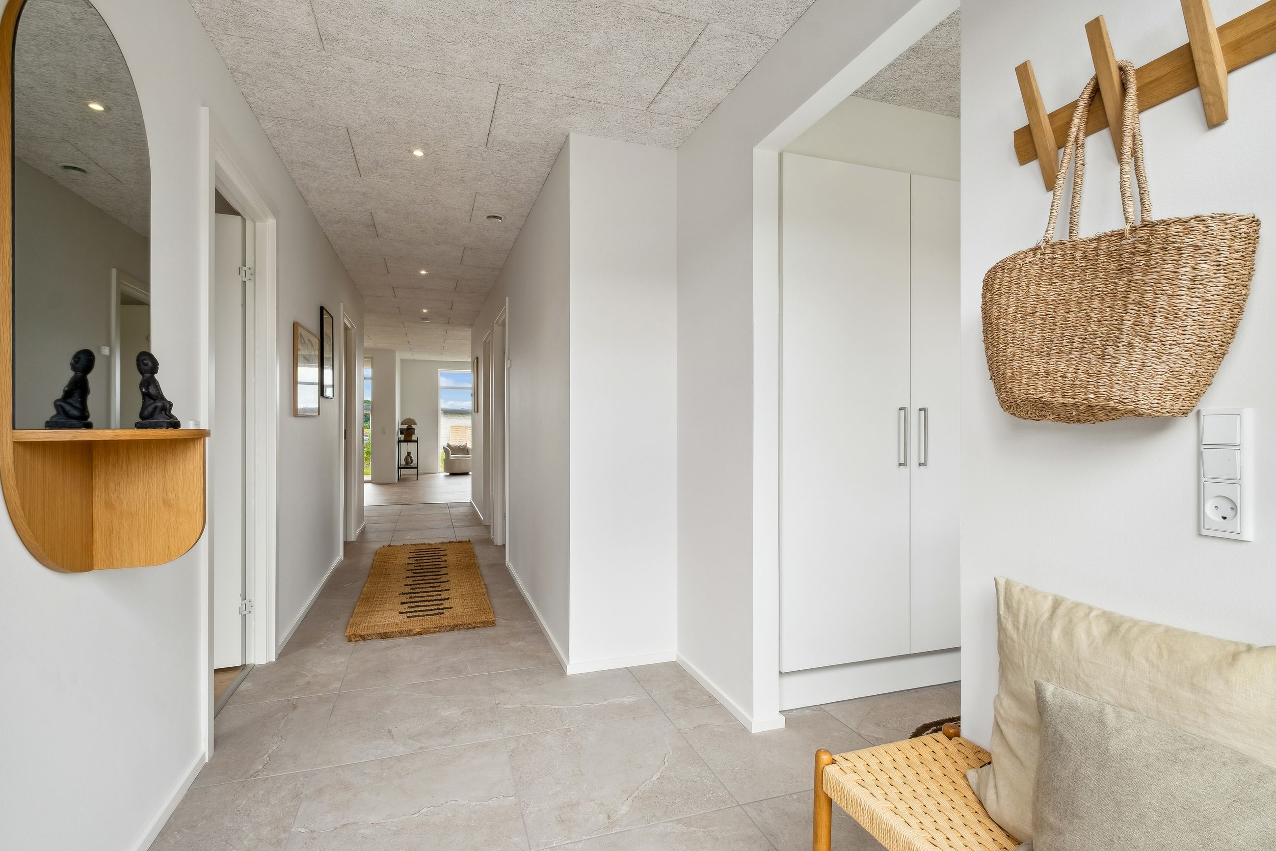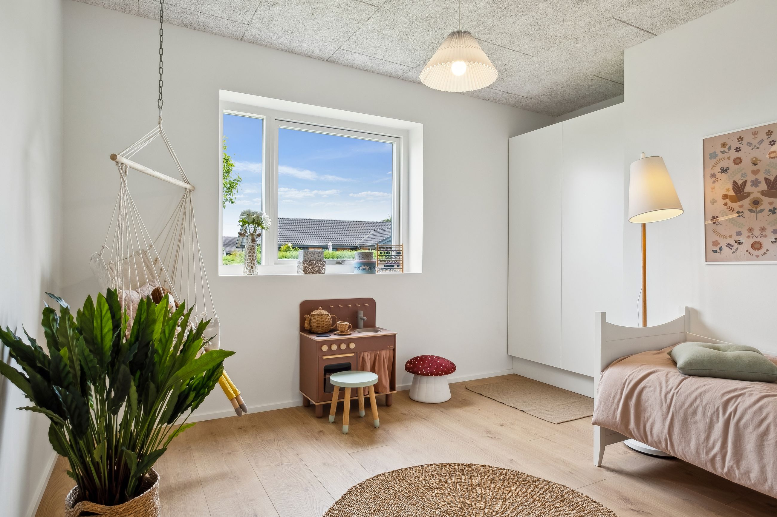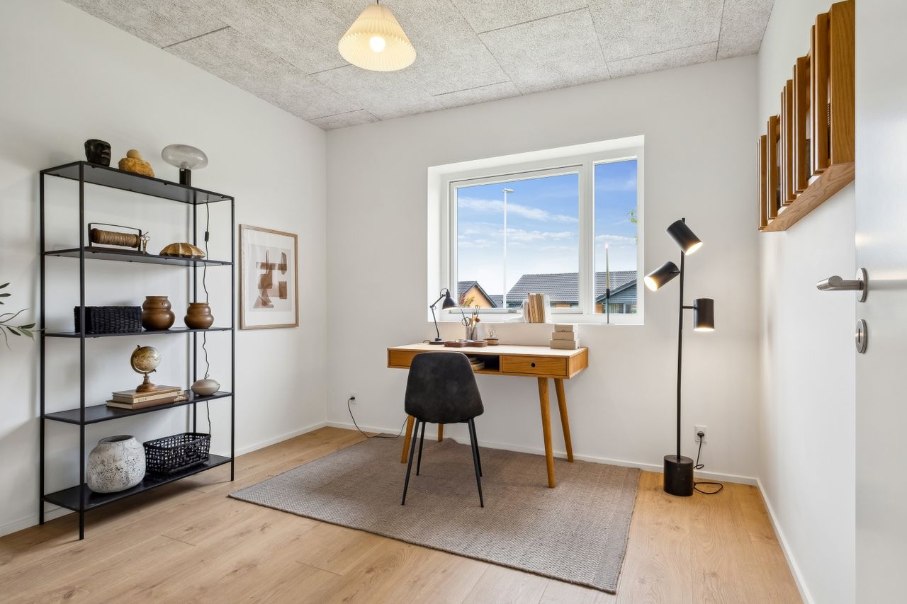 I dette rækkehus finder du Troldtektlofter, som er støjdæmpende og skaber et behageligt lydmiljø.