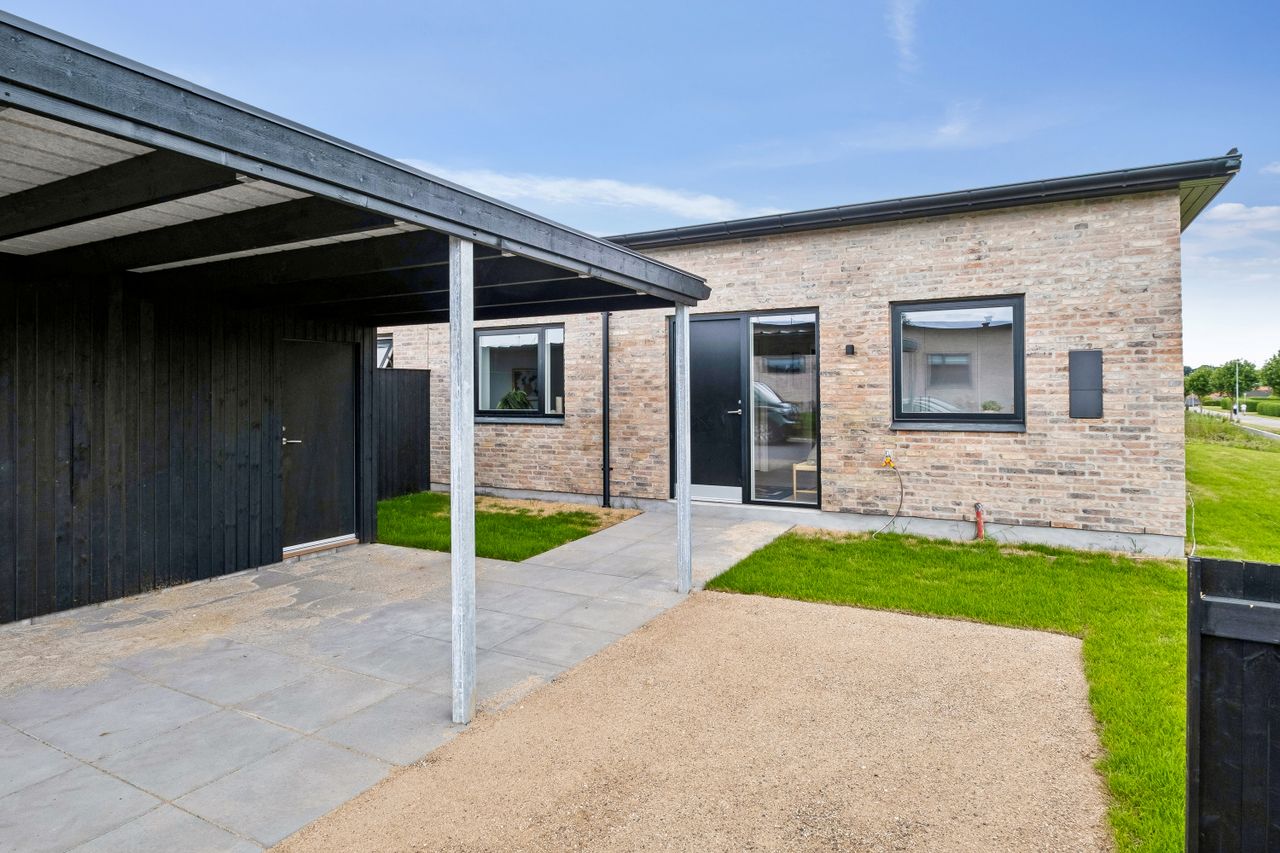 færdig hæk og græsplæne, samt et udhus til opbevaring af diverse redskaber. Carport medfølger