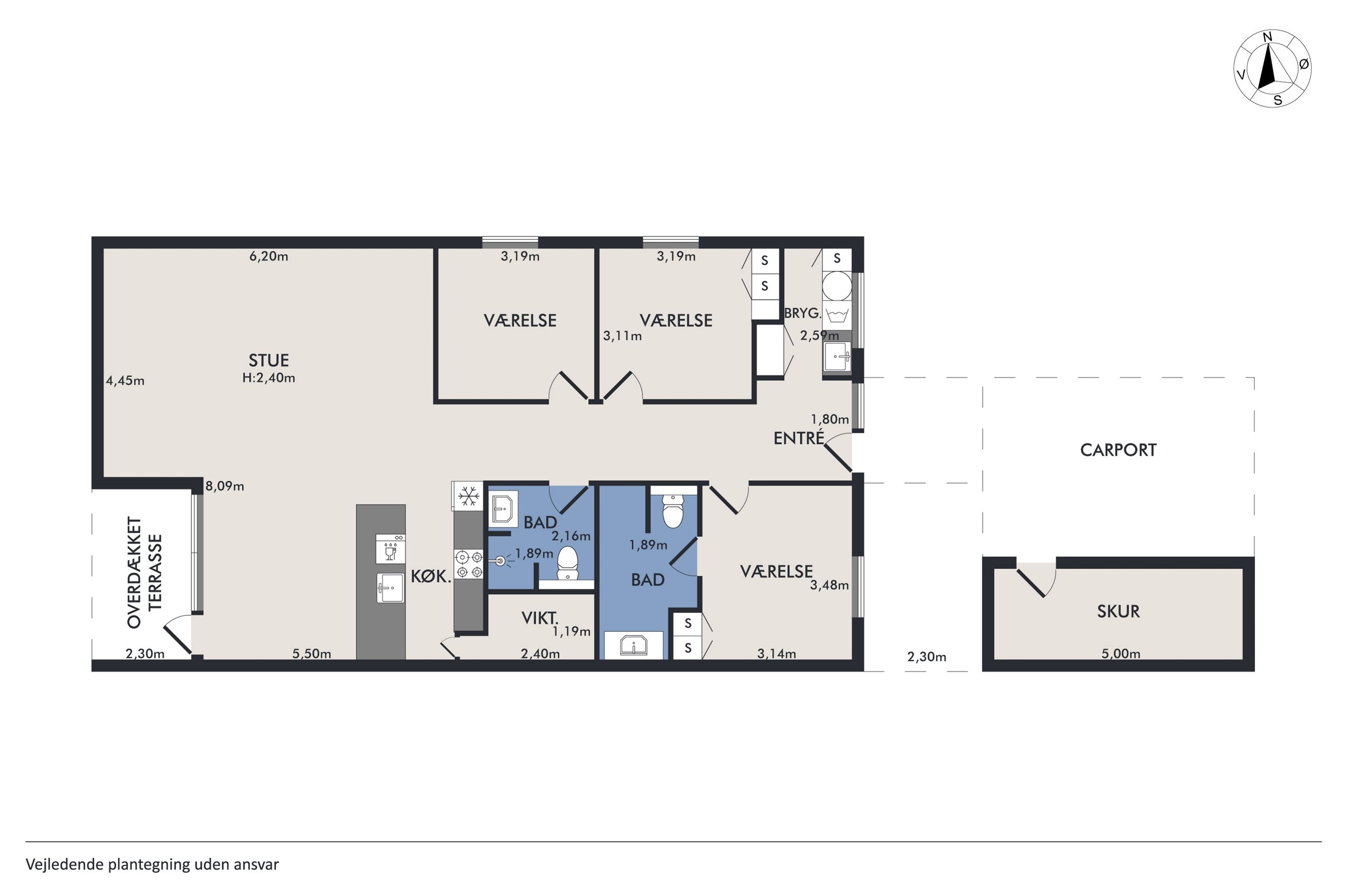 af entré, køkken alrum med viktualierum, tre gode værelser samt to badeværelser og bryggers.